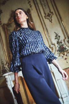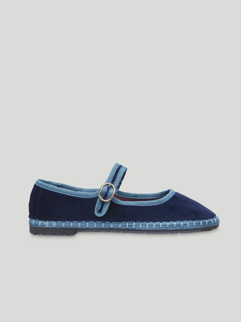 - Mary jane de terciopelo en azul oscuro con ribete azul claro y cierre de hebilla.