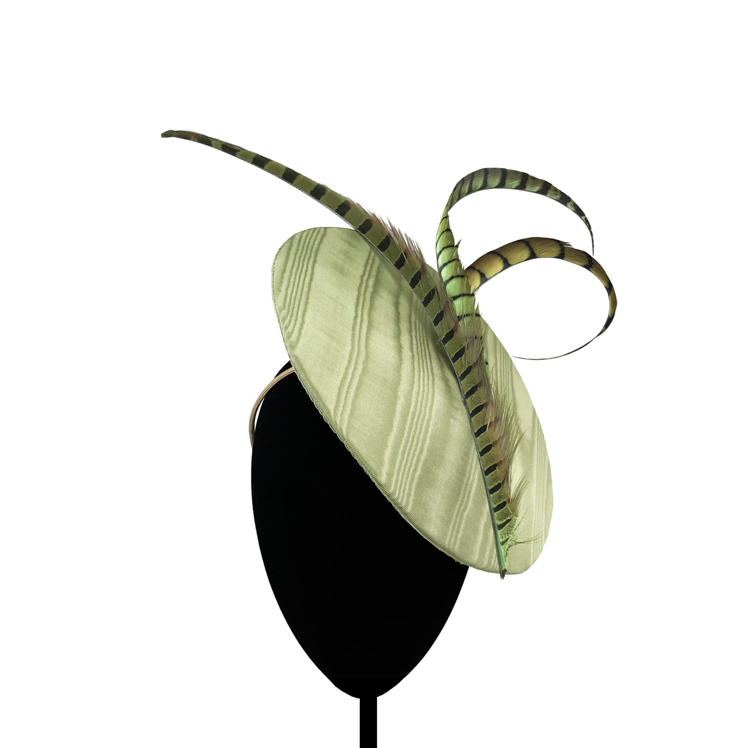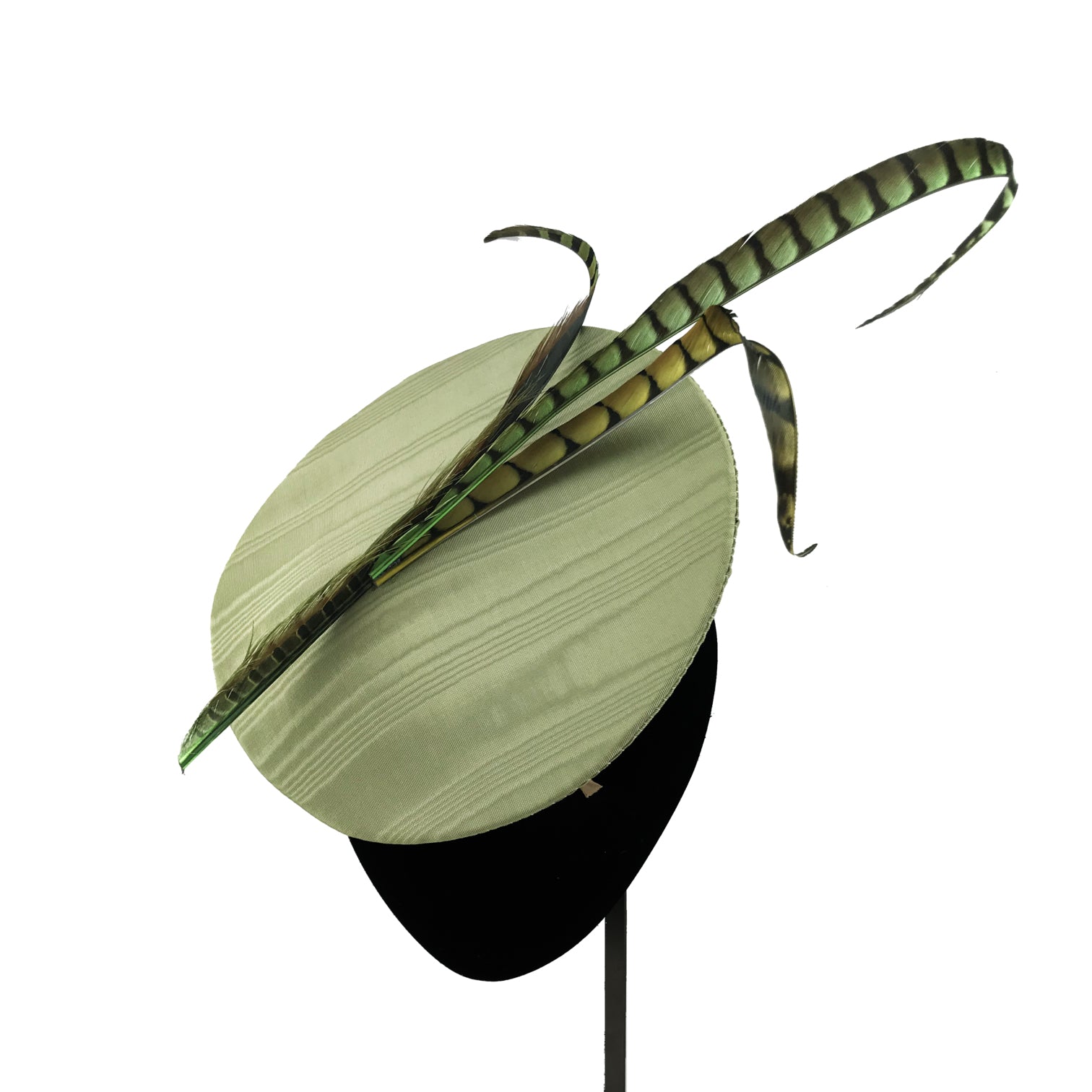 Mini Dulcinea lined in dry green moire with matching pheasant feathers.