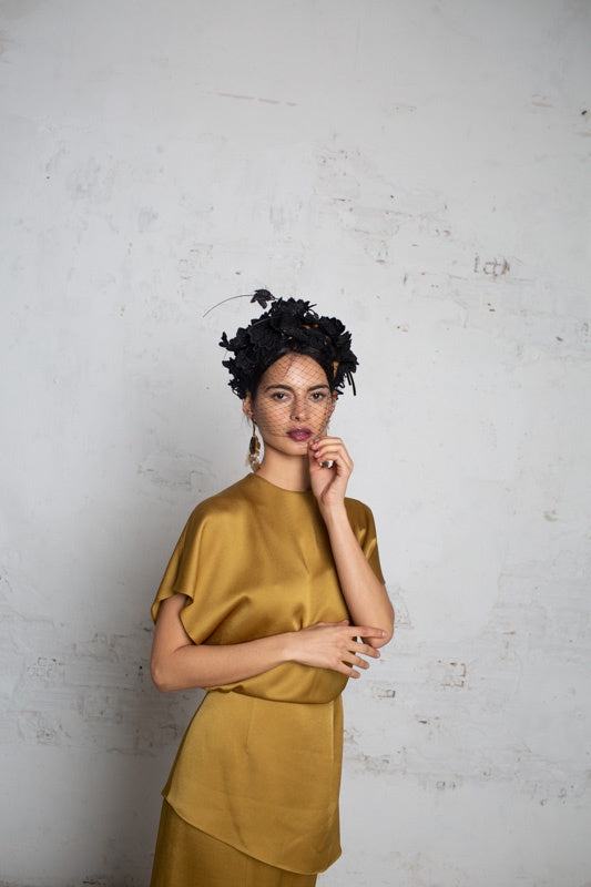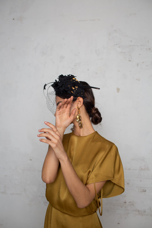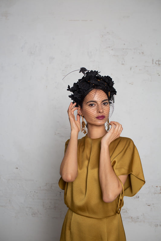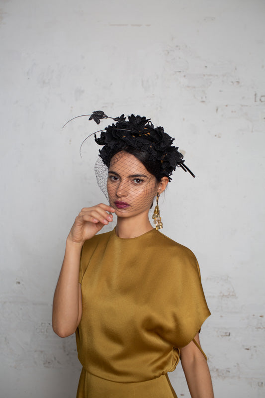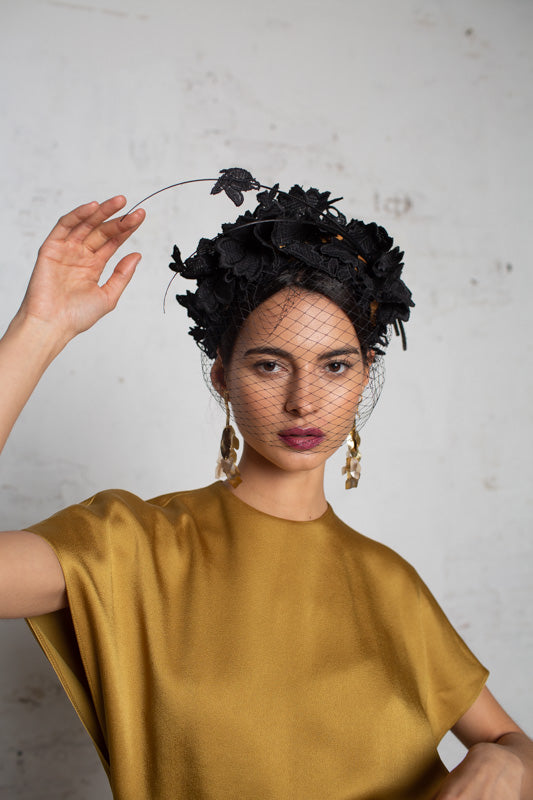 Wide headband with black embroidered lace flowers with a matching veil on the face and two black spines