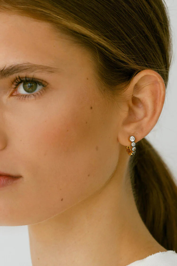 Los pendientes Delia destacan por su diseño de aro semicircular en latón con baño de oro de 24 k, que aporta un acabado cálido y sofisticado. Cada circonita está engastada en bisel y realzada con un delicado rodiado en negro efecto blackish, creando un contraste moderno que intensifica el brillo de las piedras.
