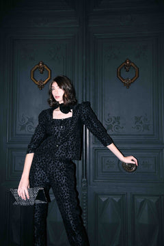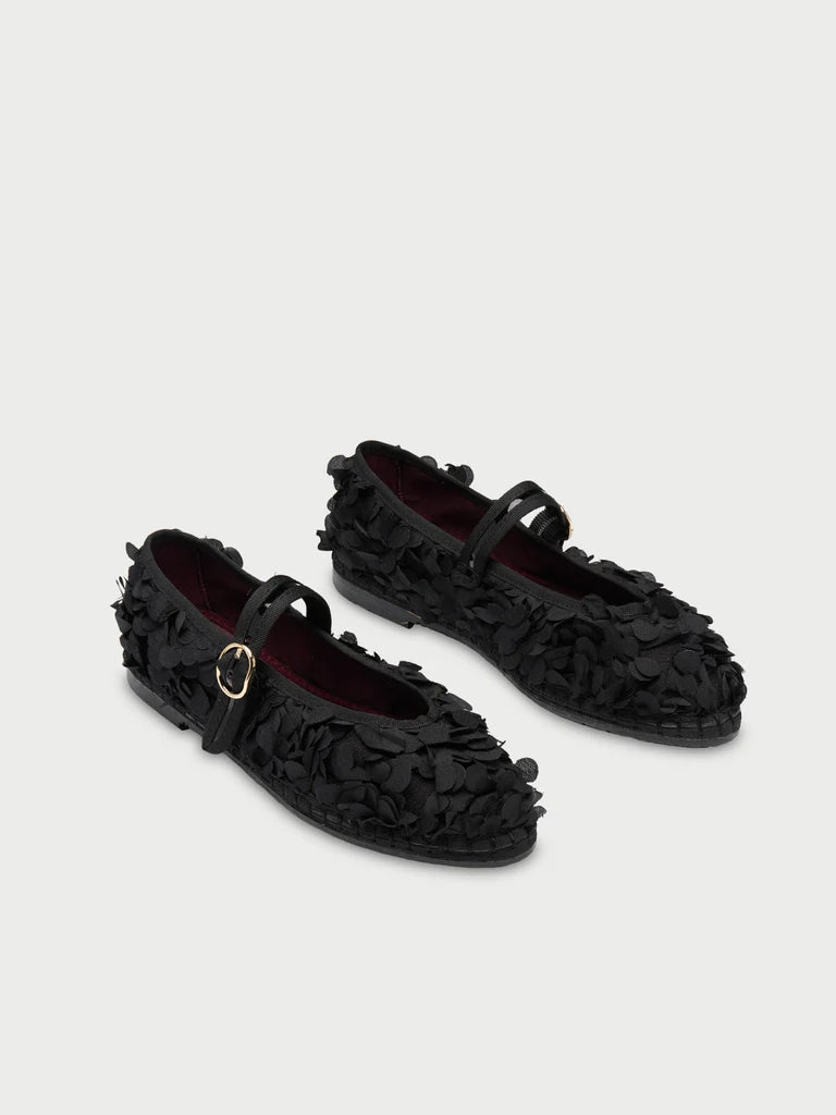 - Bailarina de terciopelo con corte en V en encaje negro con ribete negro.