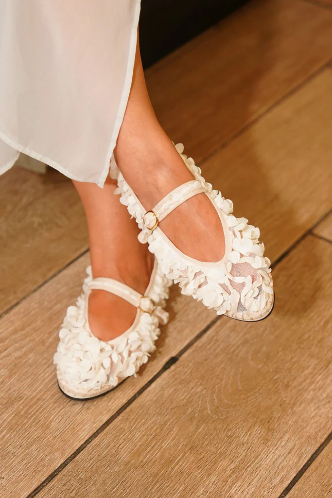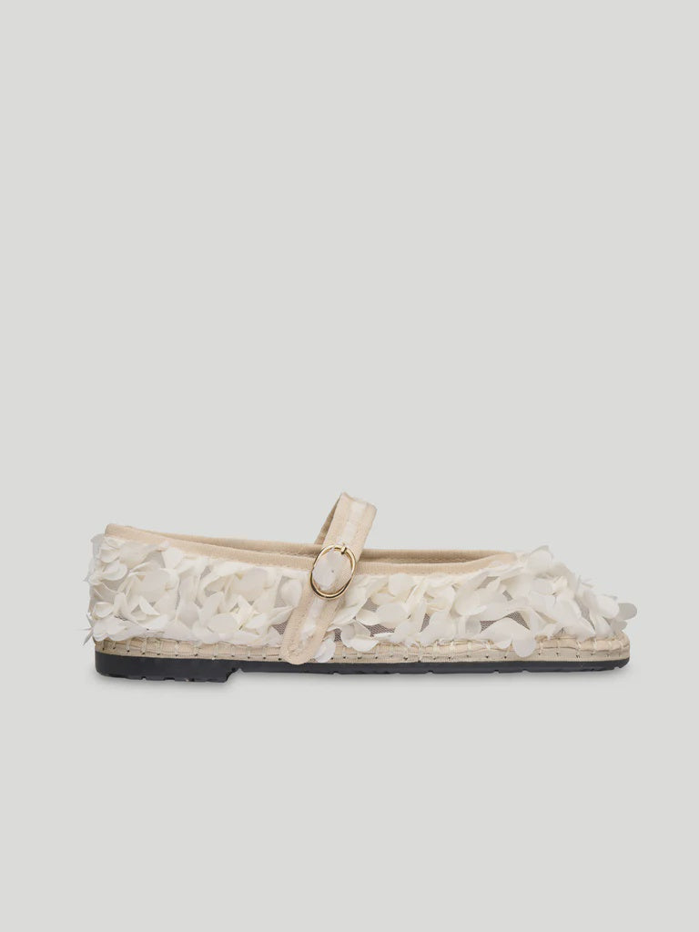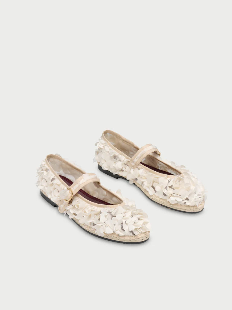 - Bailarina de terciopelo con corte en V en encaje blanco con ribete blanco.