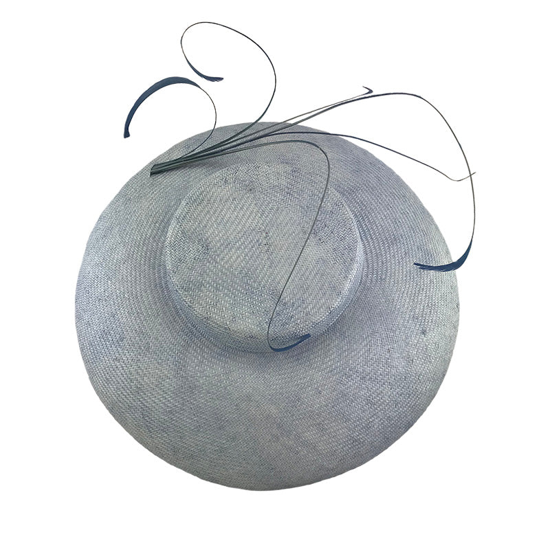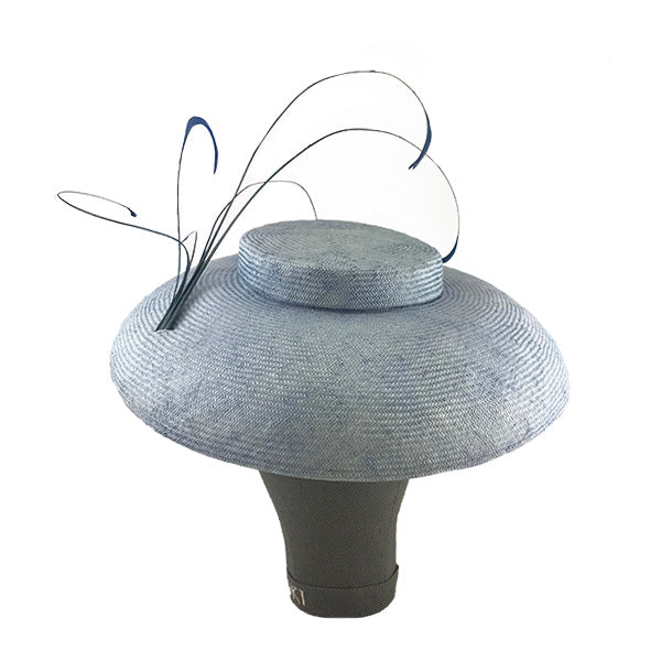 Flared hat made of greyish blue parasisal with a square crown and curved feathers in the same colour
