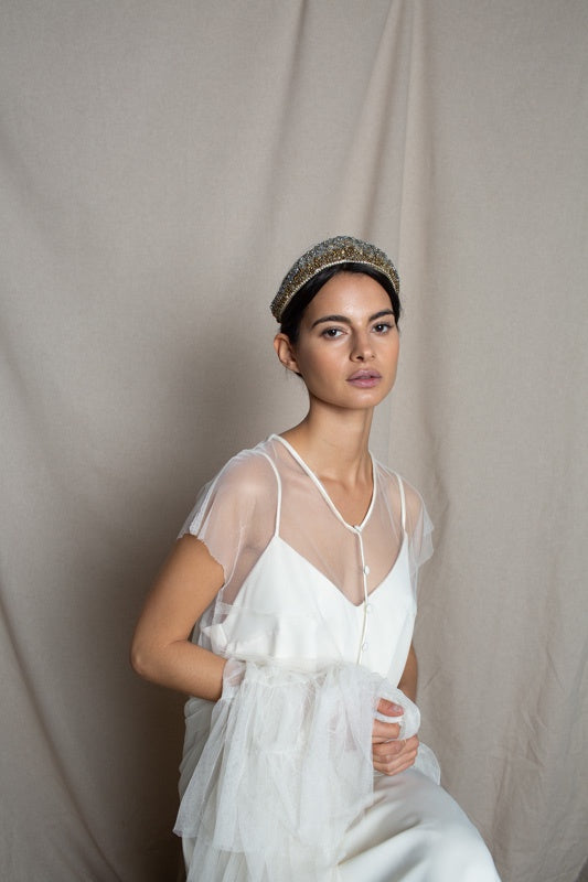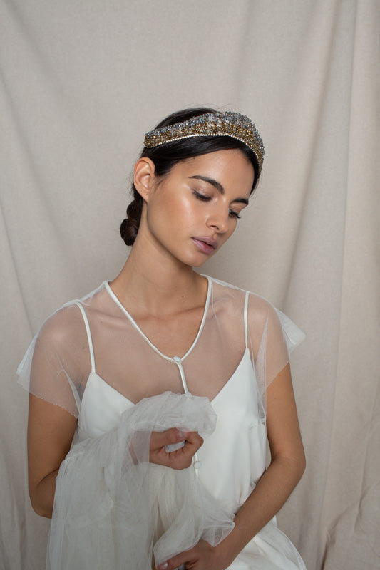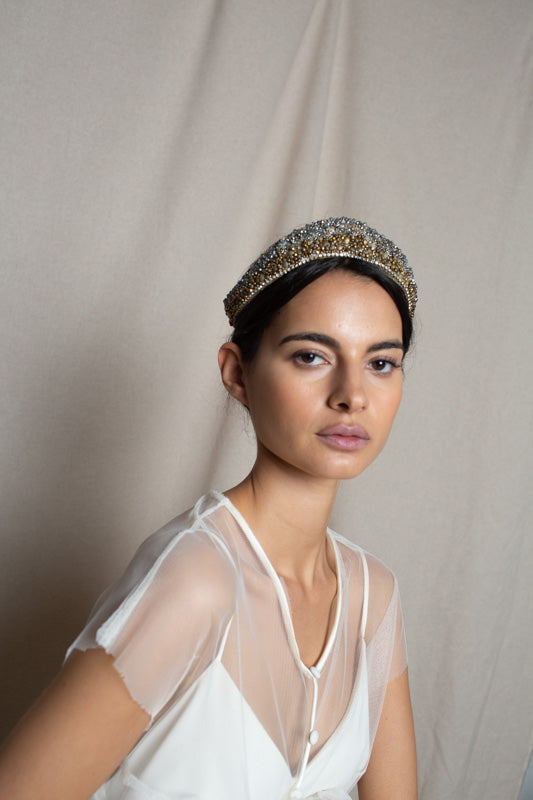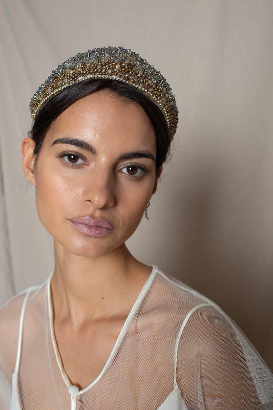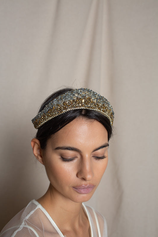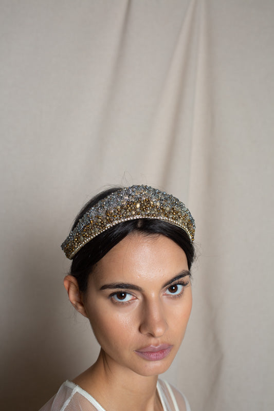 Tiara embroidered with gold and silver stones and metallic flowers embedded with a border of diamonds