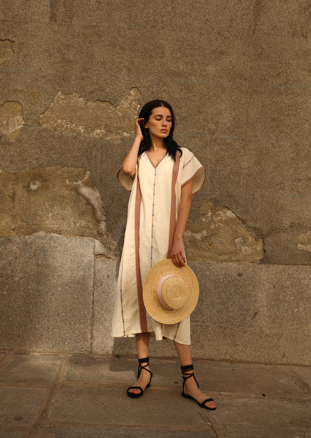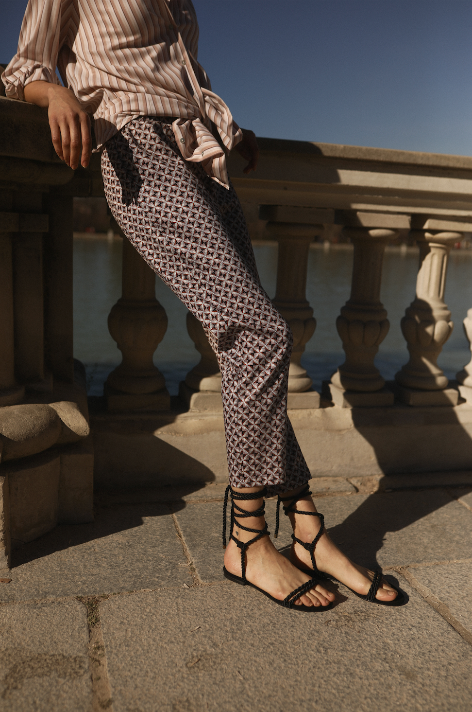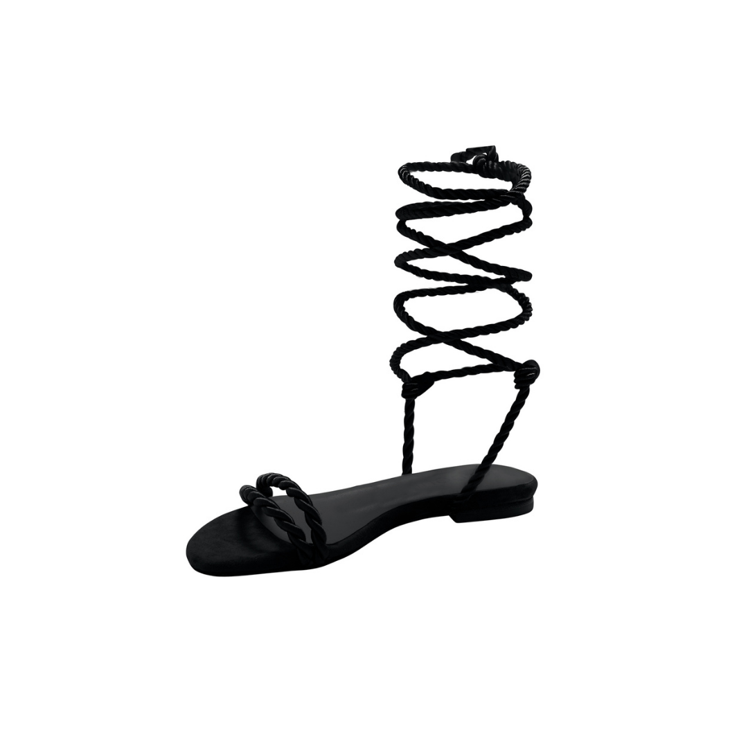 Flat leather sandal with silk cord straps to tie around the ankle as you wish.