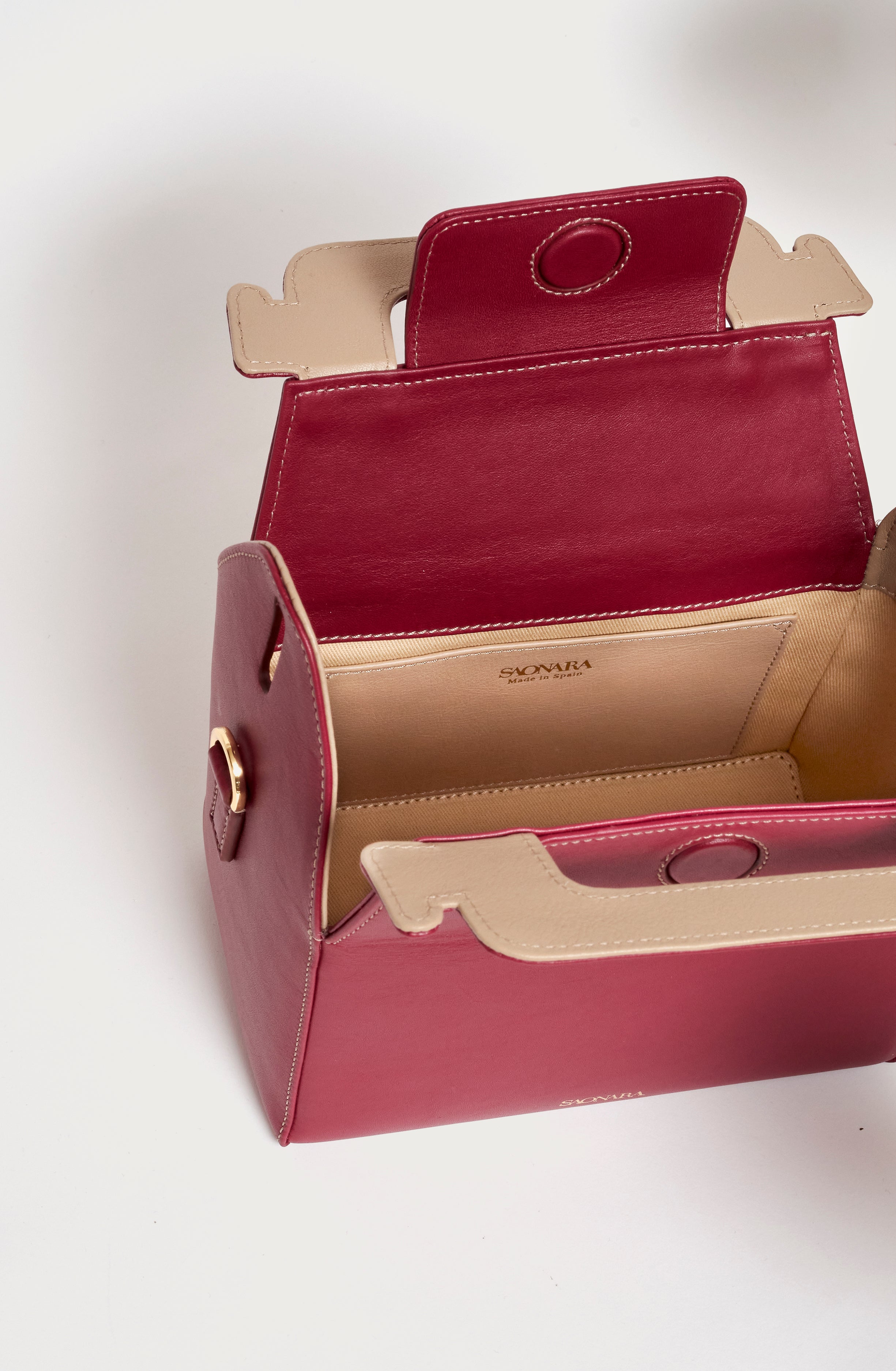 - Contrasting integrated handle. Two-tone taupe and peony removable shoulder strap adjustable in 4 positions