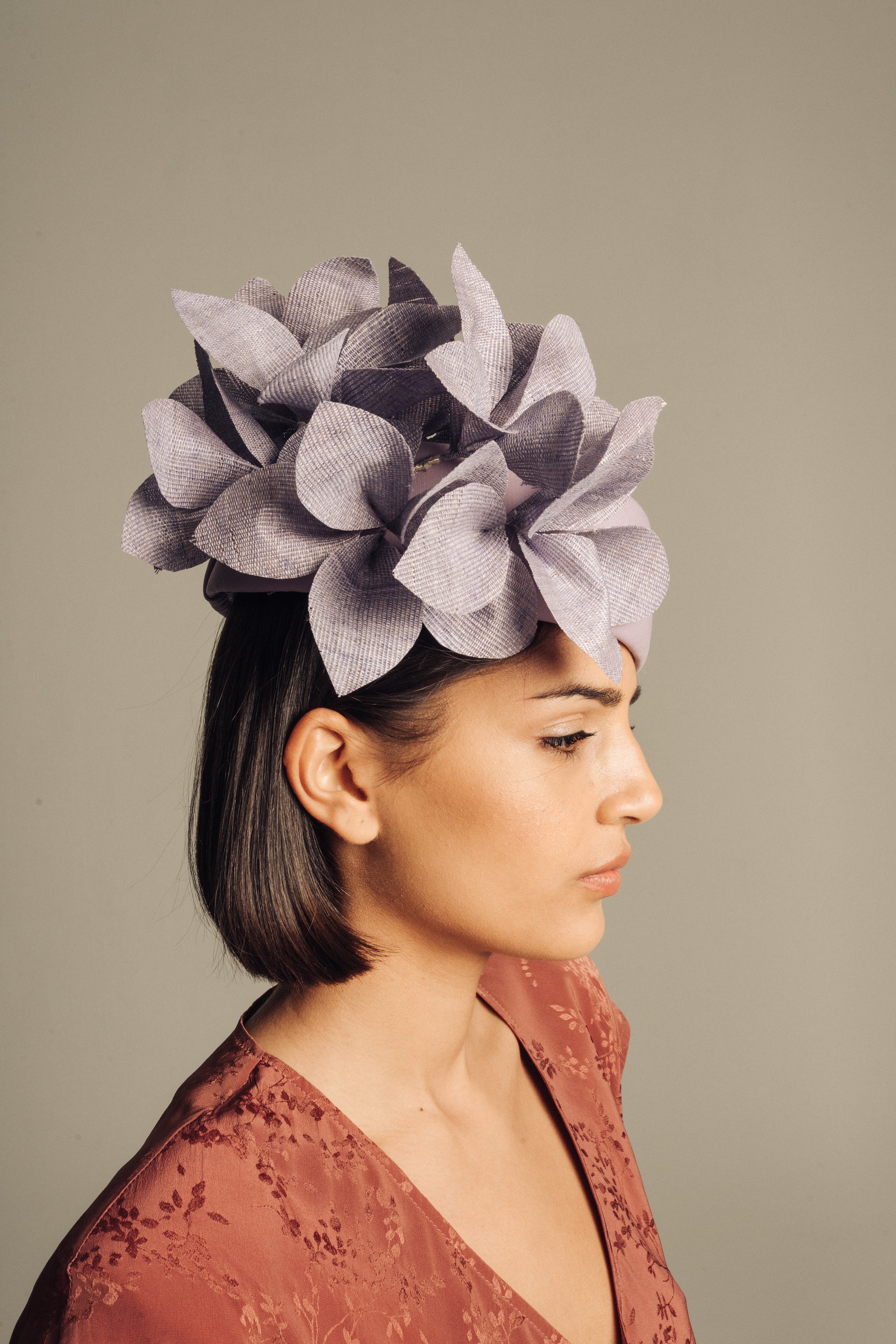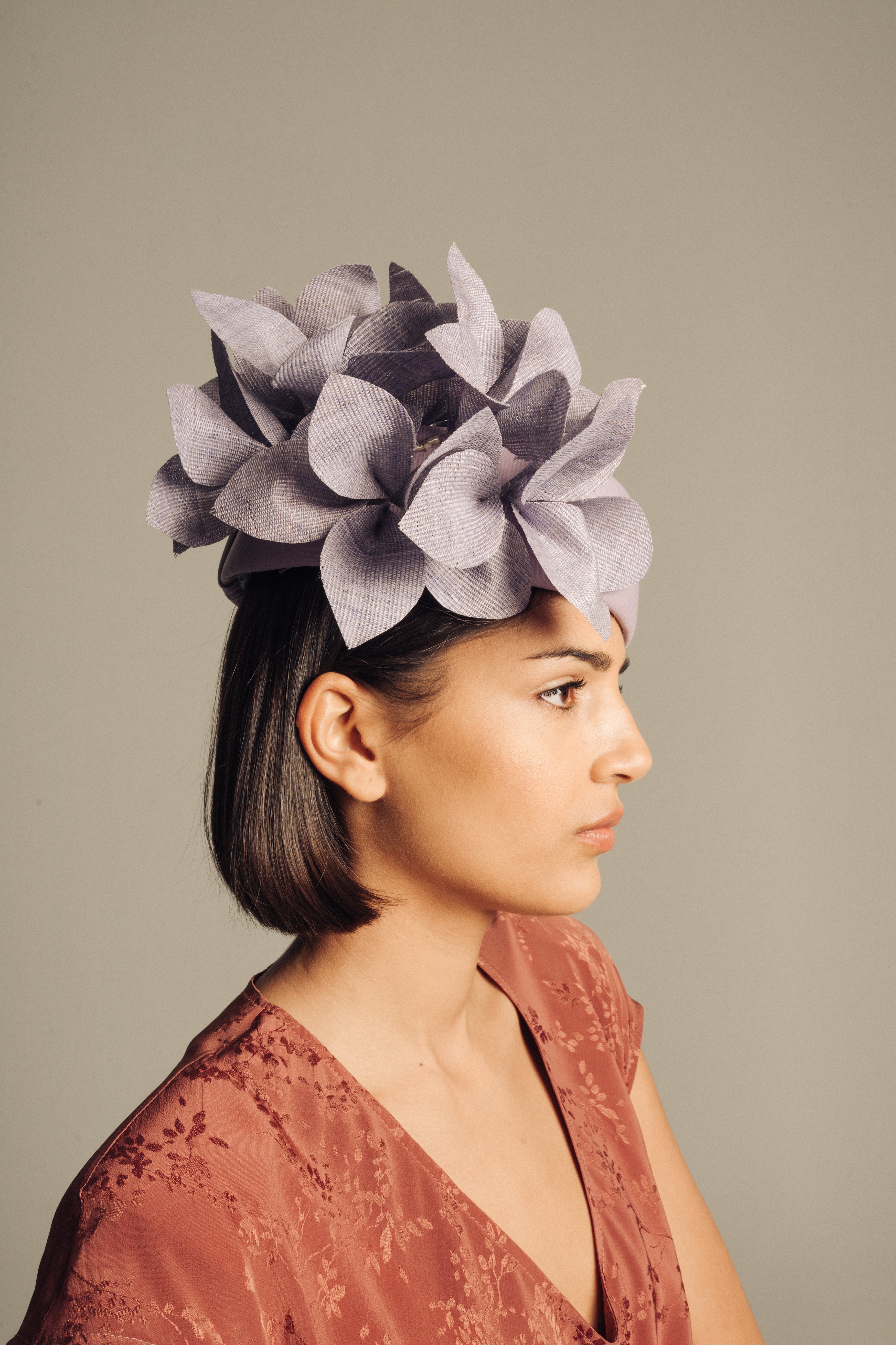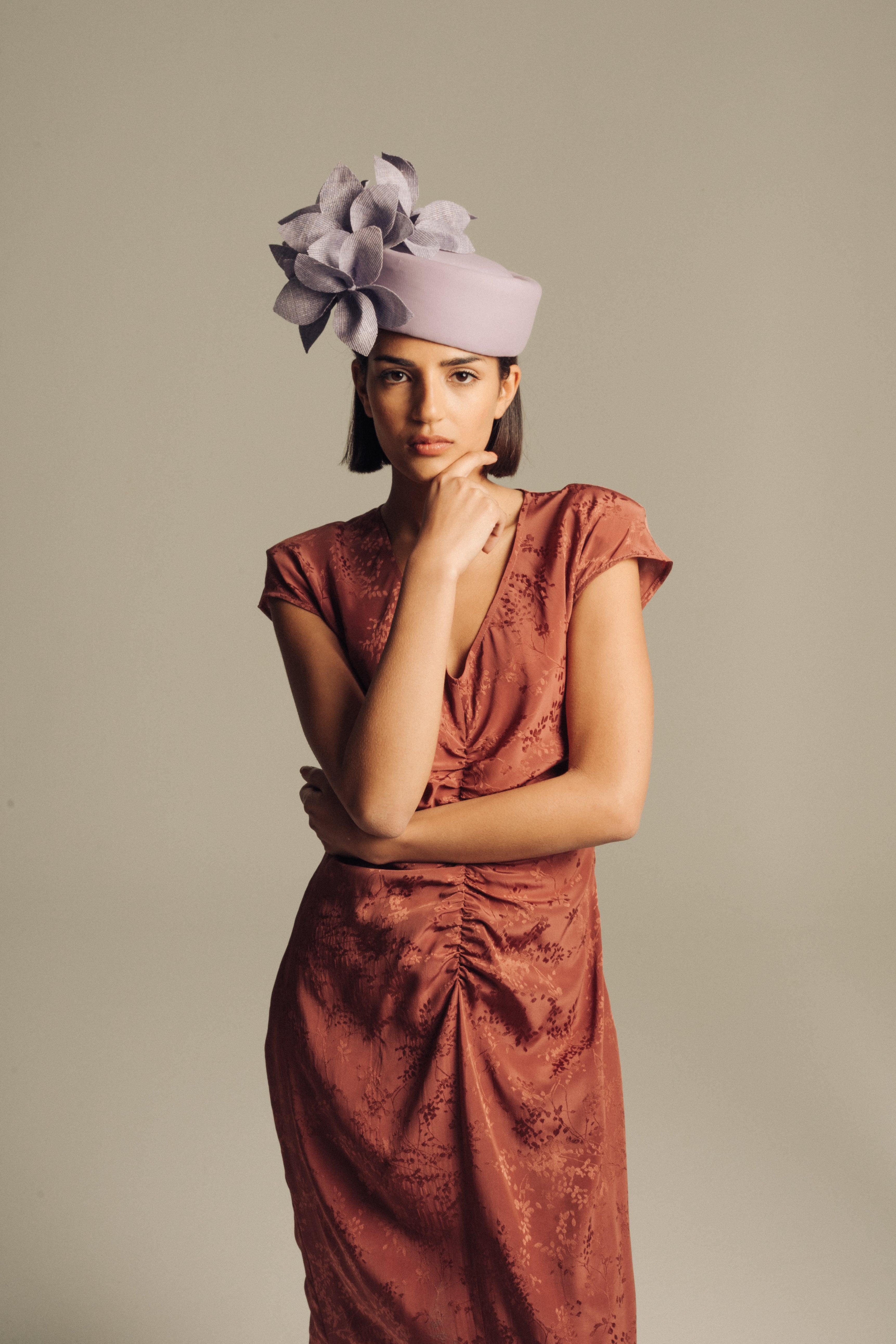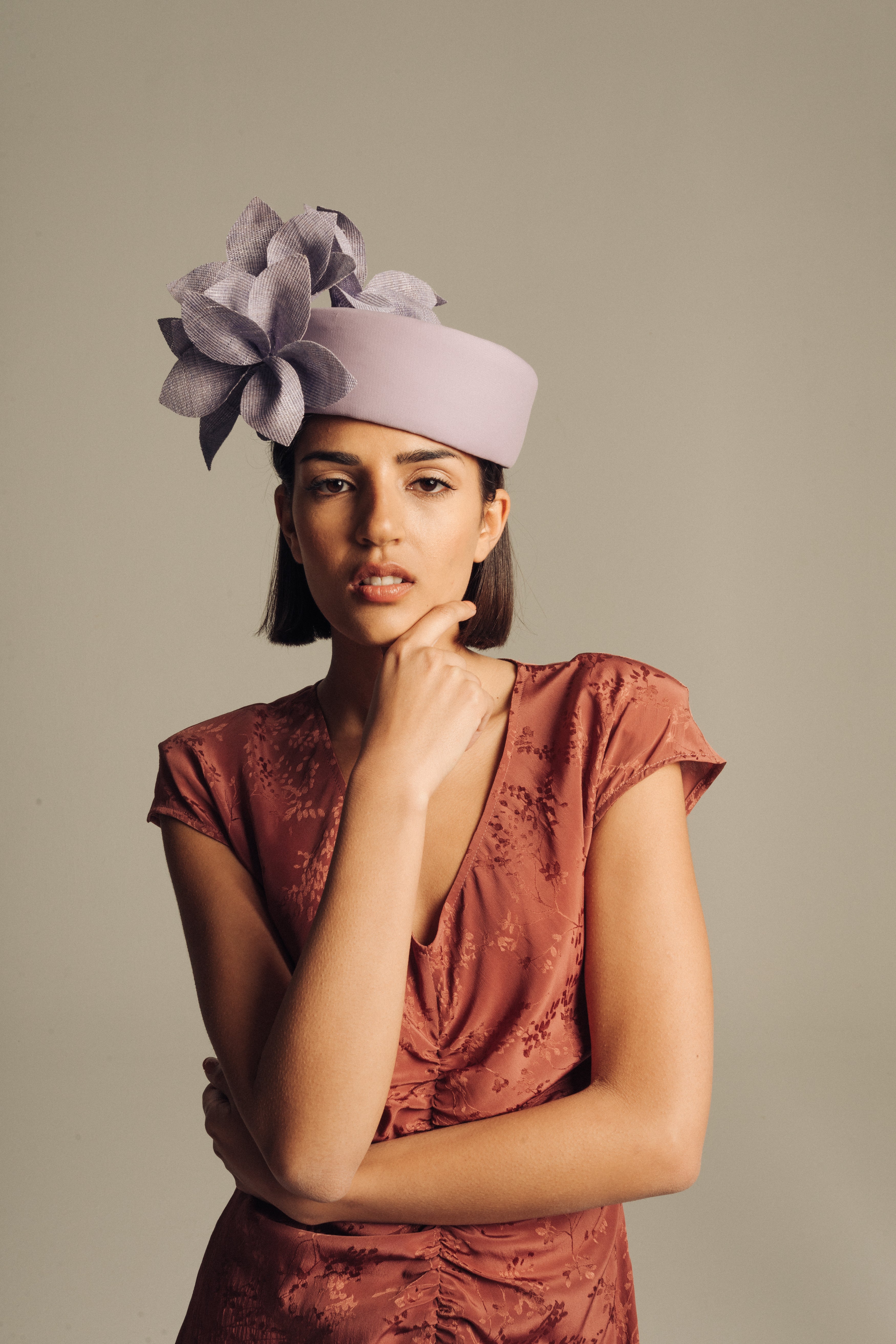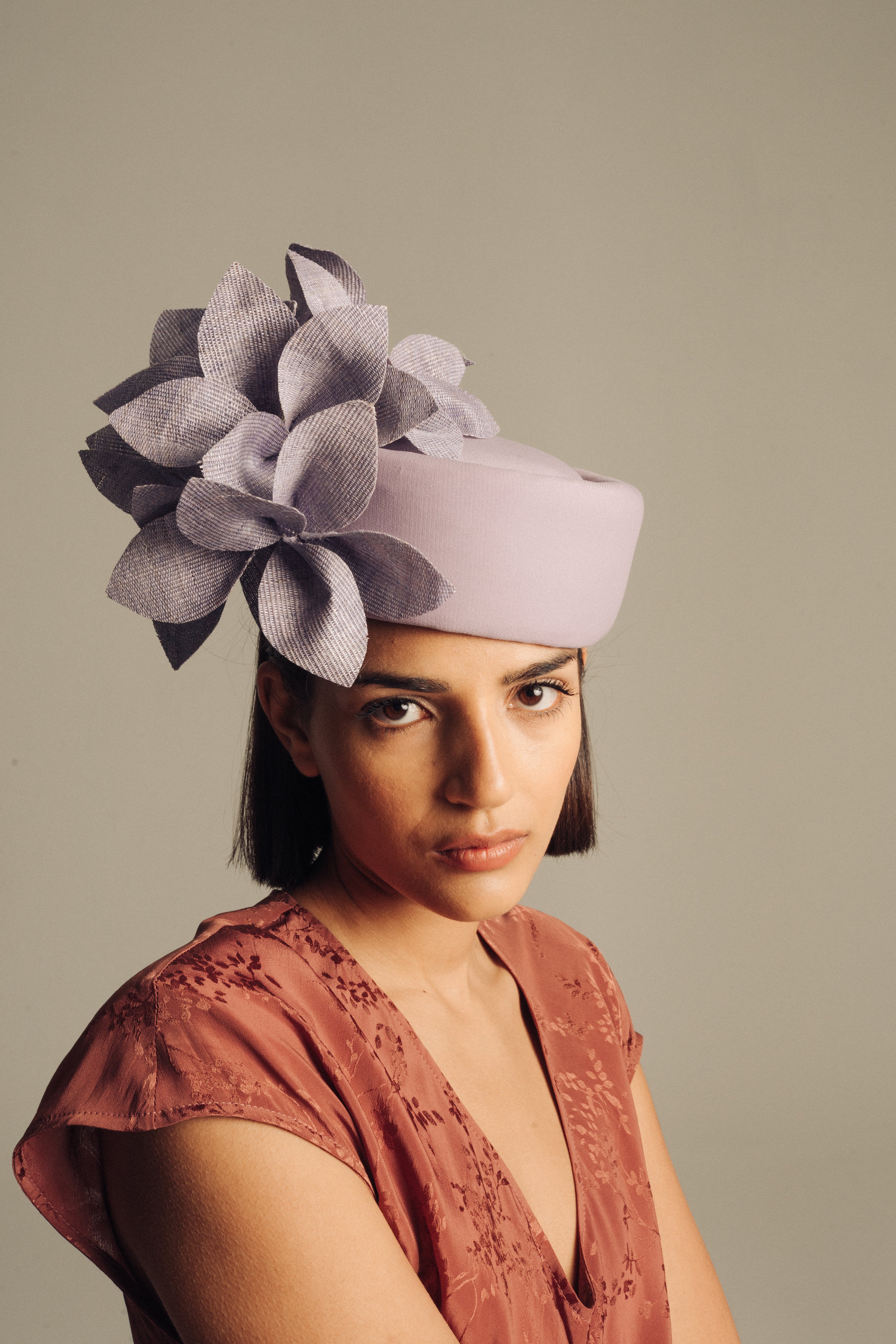 Pillbox lined in mauve crepe with matching rigid tinalak flowers.