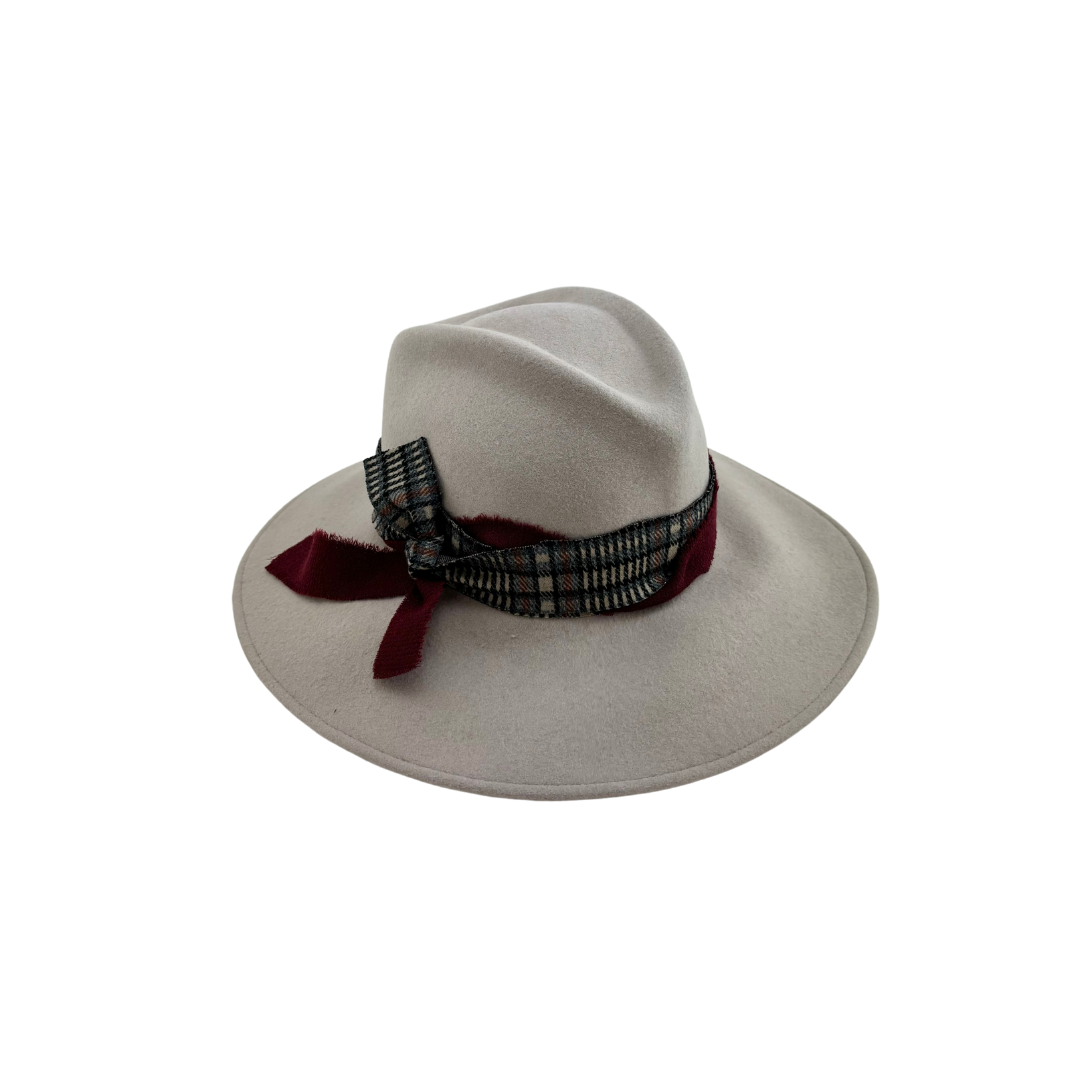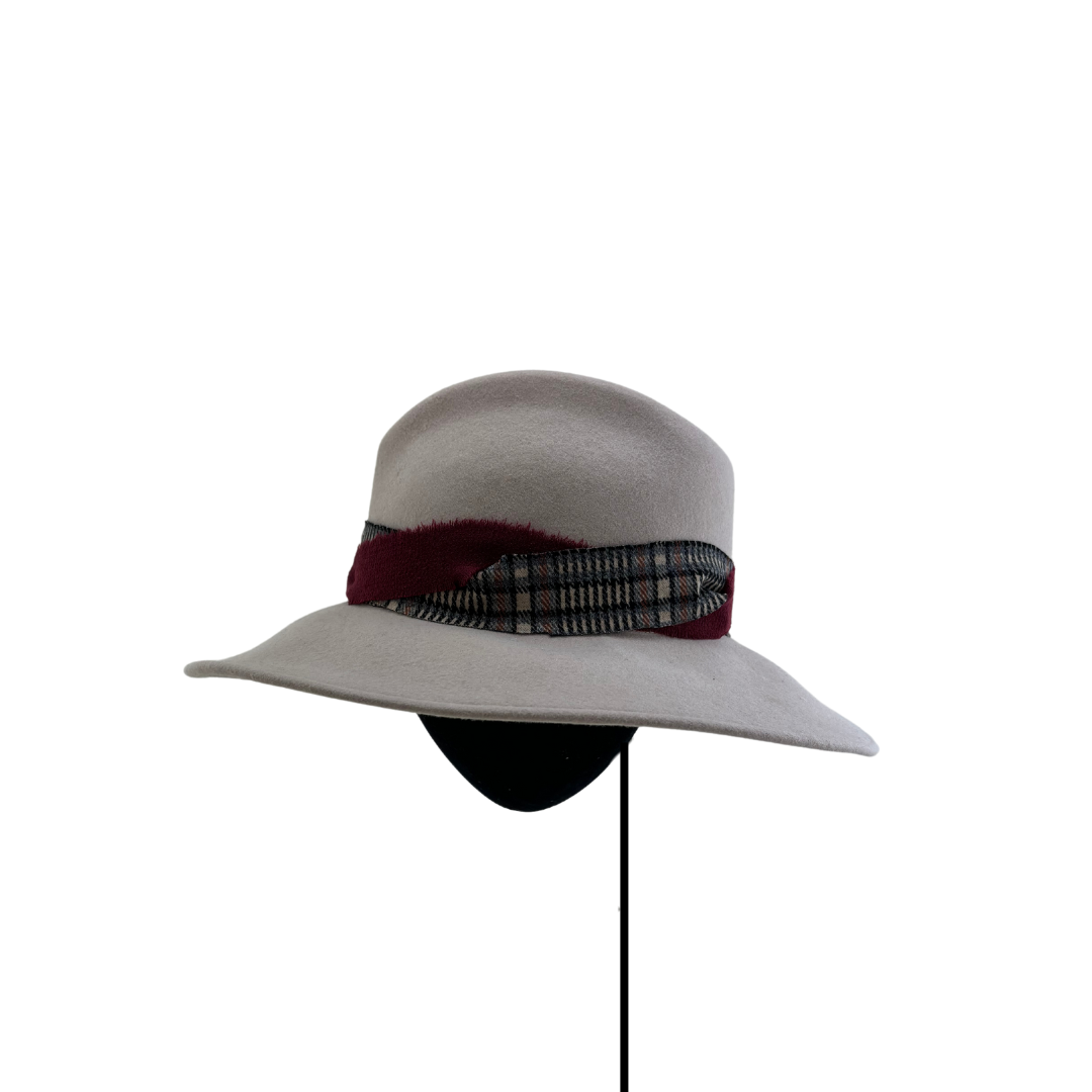 Sombrero de fieltro de lana beige con dos cintas entrelazadas en granate y cuadros beige y gris.