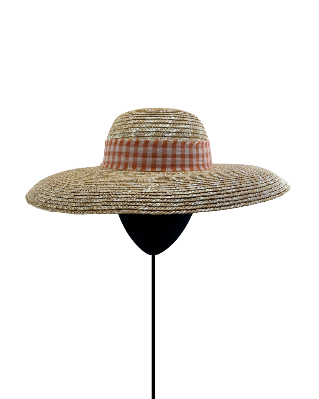 Sombrero de verano PICNIC bosque de paja natural, ala acampanada y copa redonda con cinta de algodón estampada de cuadros vichy naranjas.