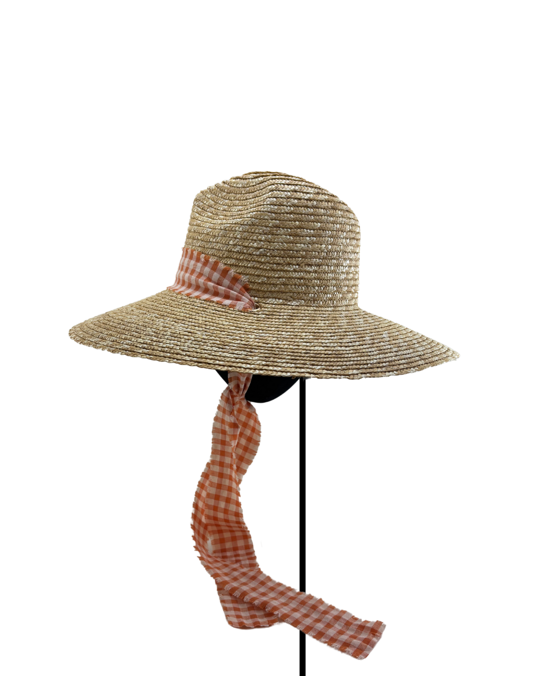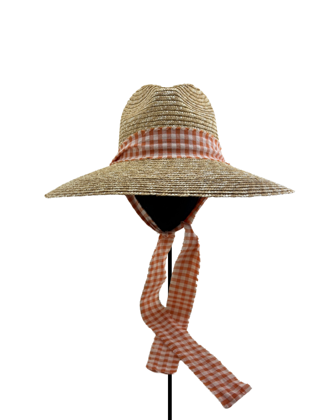 Sombrero de verano PICNIC jardín de paja natural, copa cowboy con cinta de algodón estampada de cuadros vichy naranjas para atar al cuello. Ajustable.