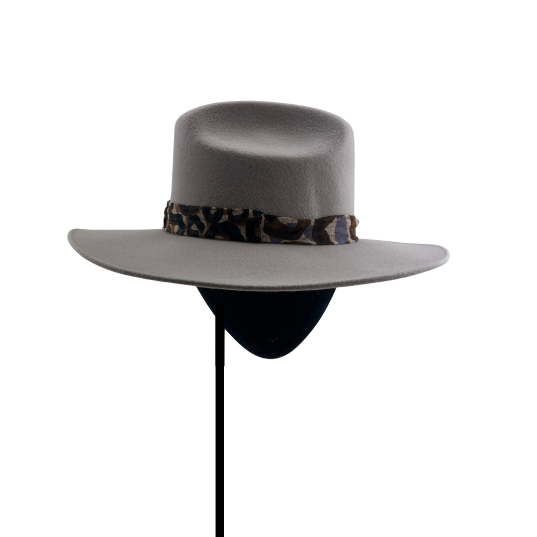 Sombrero de fieltro de lana beige con copa estilo cowboy y cinta estampada en tonos marrones y lilas