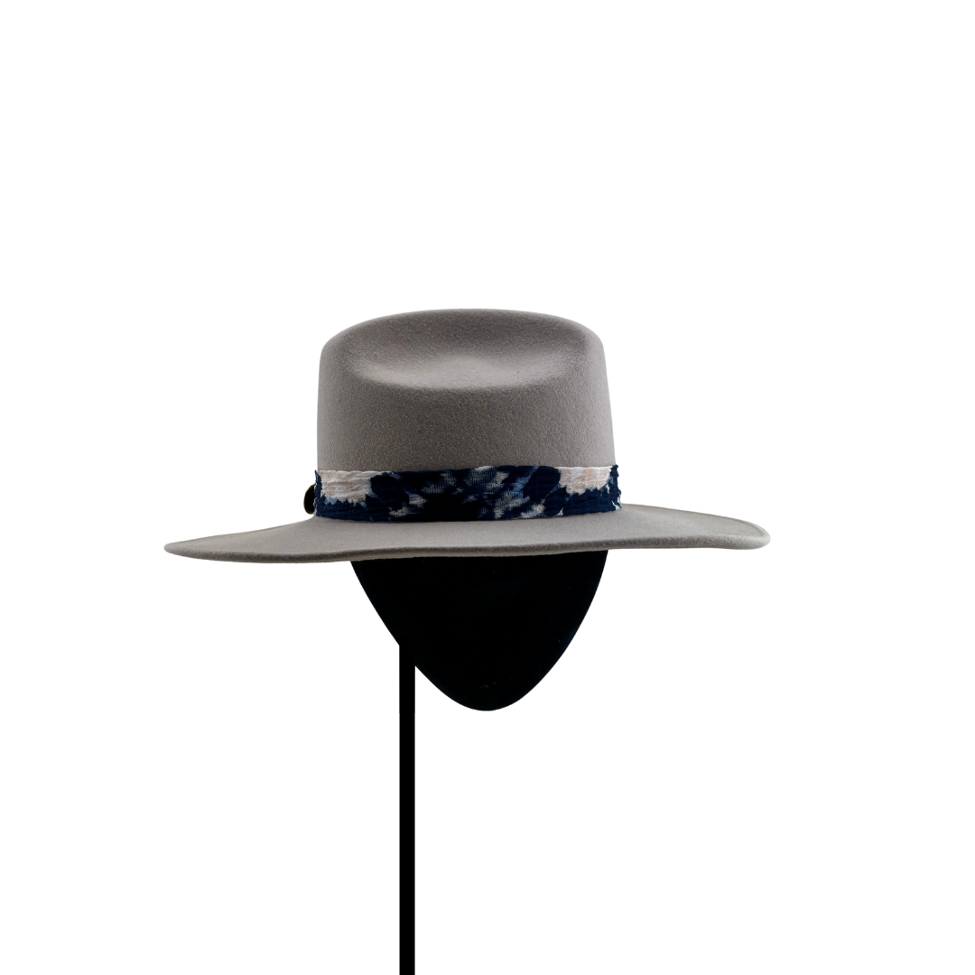 Sombrero de fieltro de lana beige con copa estilo cowboy y cinta estampada en tonos azules y blancos