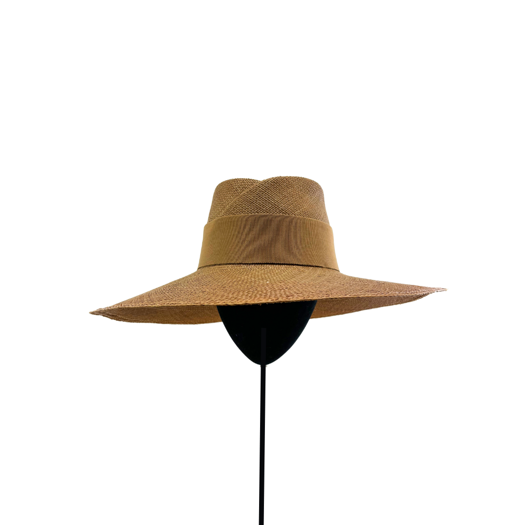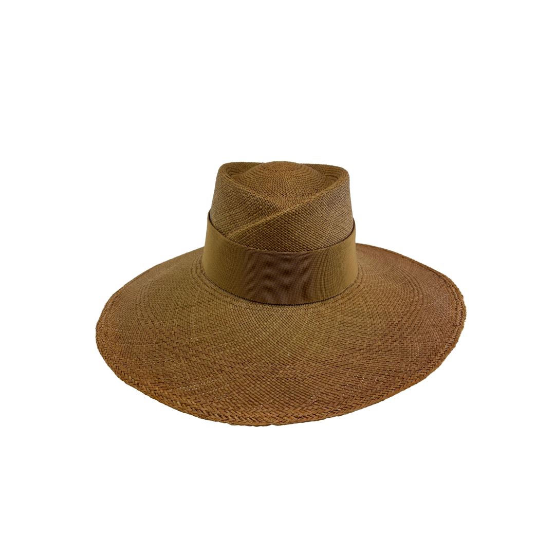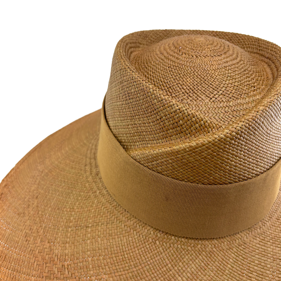 Camel-colored natural straw hat with an asymmetric crown and matching grosgrain ribbon. (100% toquilla straw)