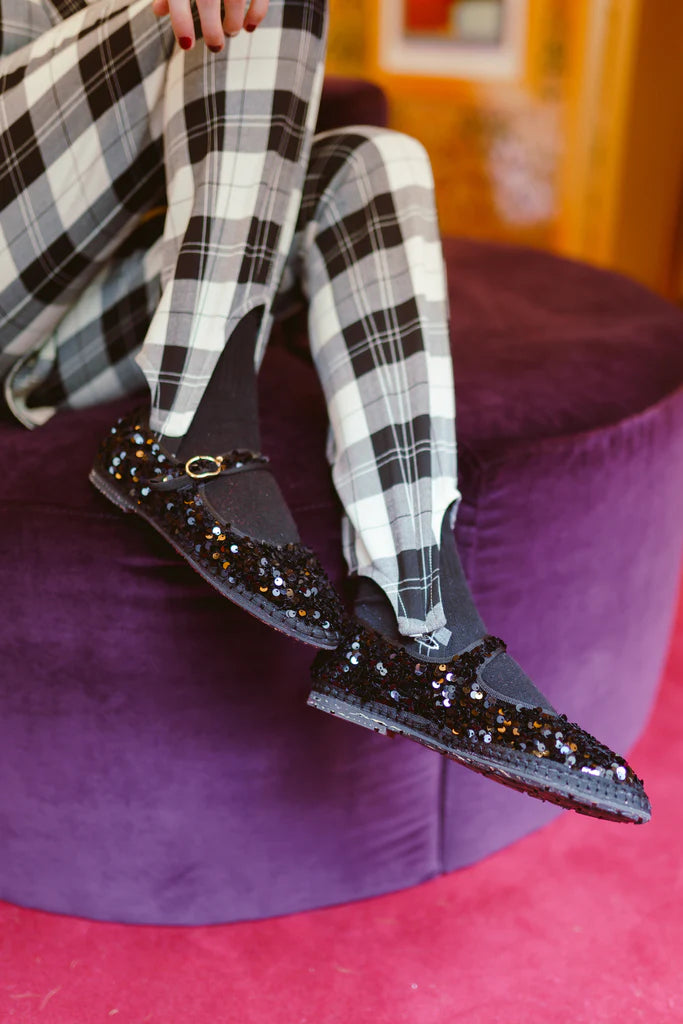 - Merceditas con lentejuelas en negro con ribetes negros y cierre de hebilla.