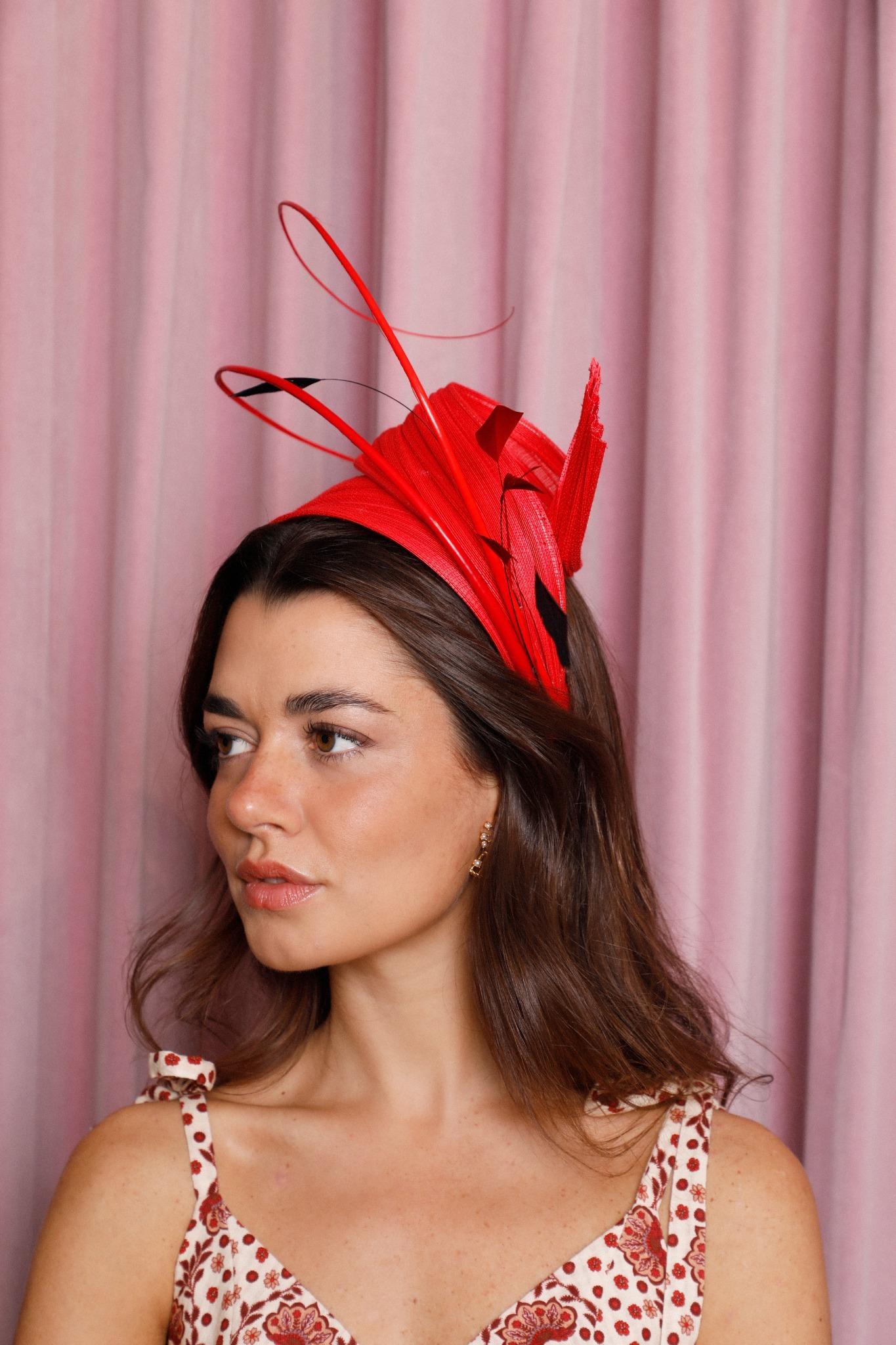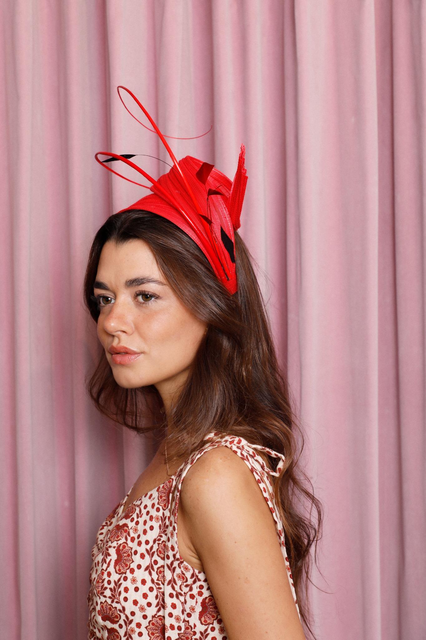 Diadema de rafia rígida roja con modelado y raquis al tono y antenitas rojas y negras