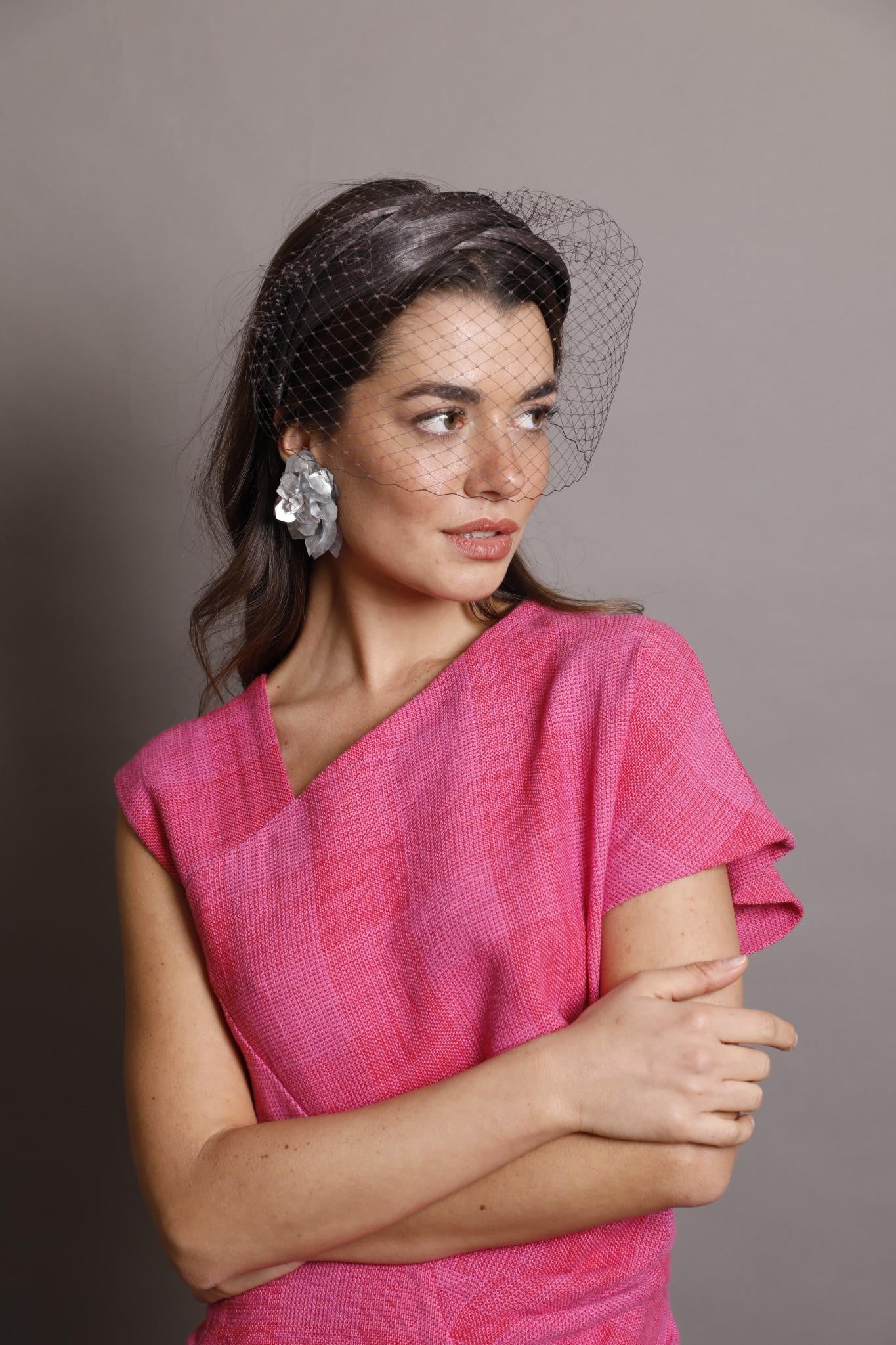 Diadema cruzada de rafia de algodón marrón chocolate con velo al tono