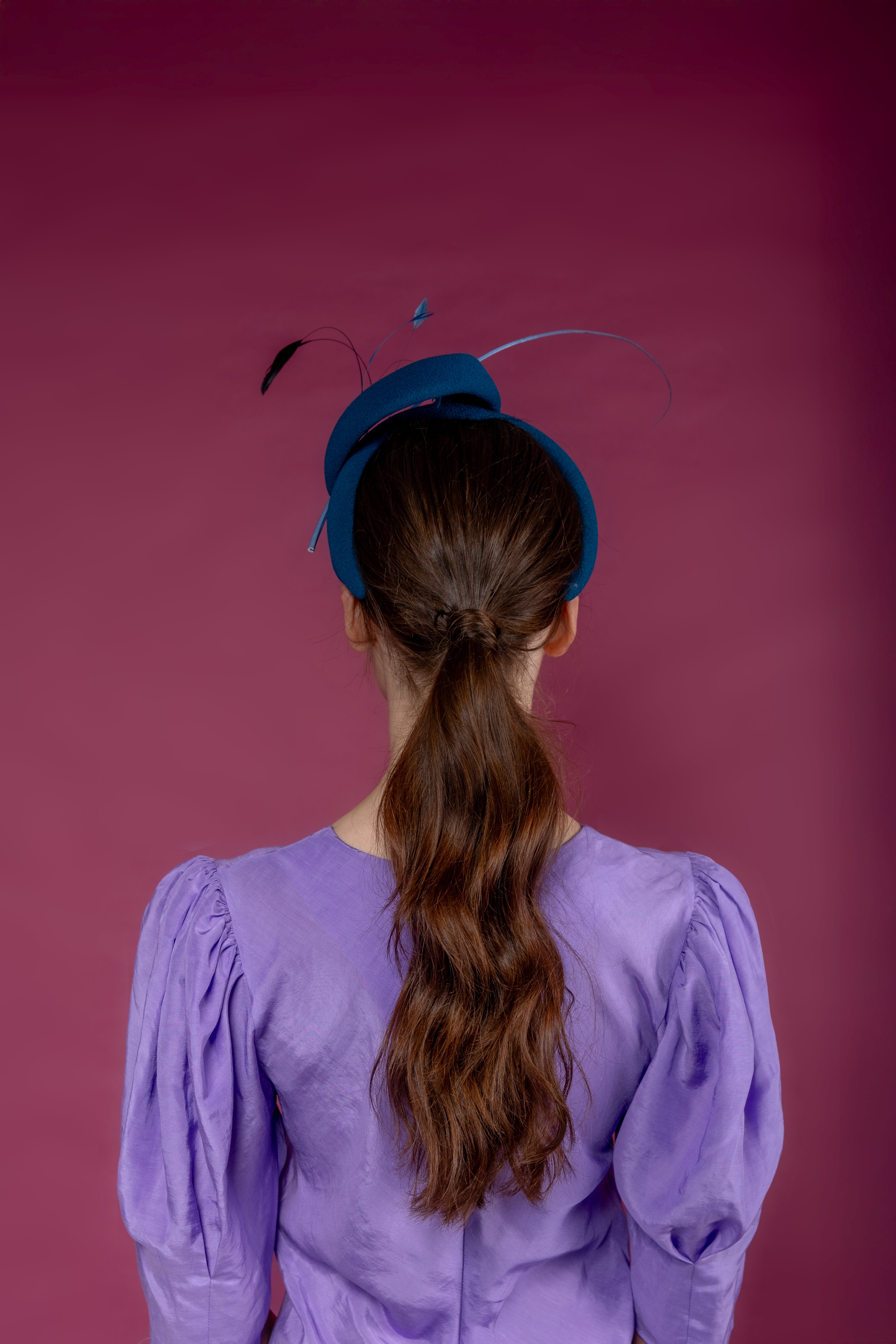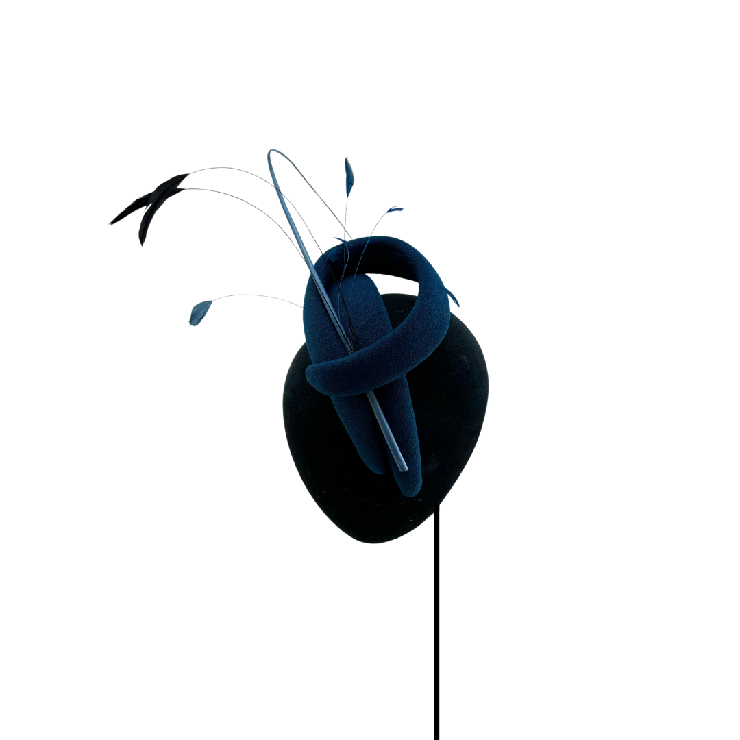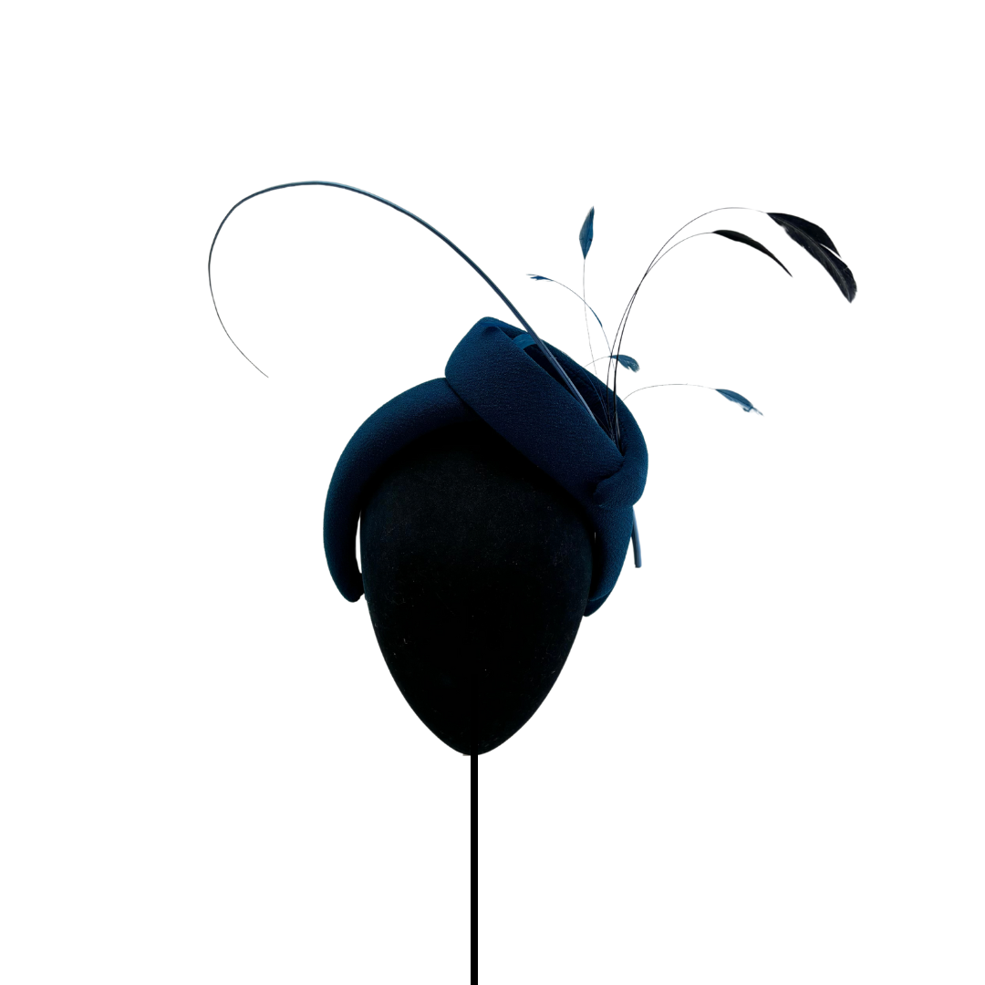 Diadema con estructura ondulada forrada en crepe azul petroleo, raquis y antenitas al tono