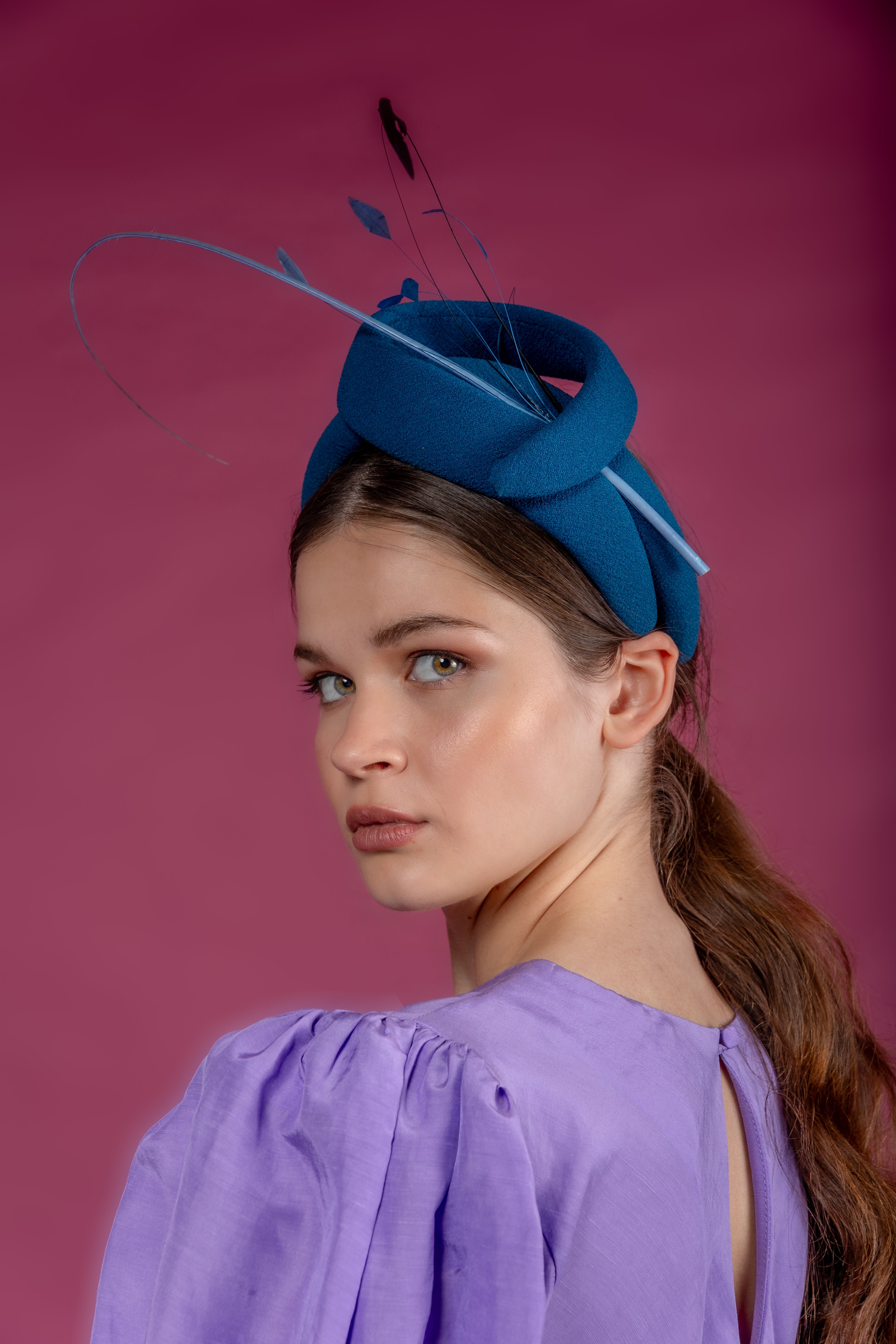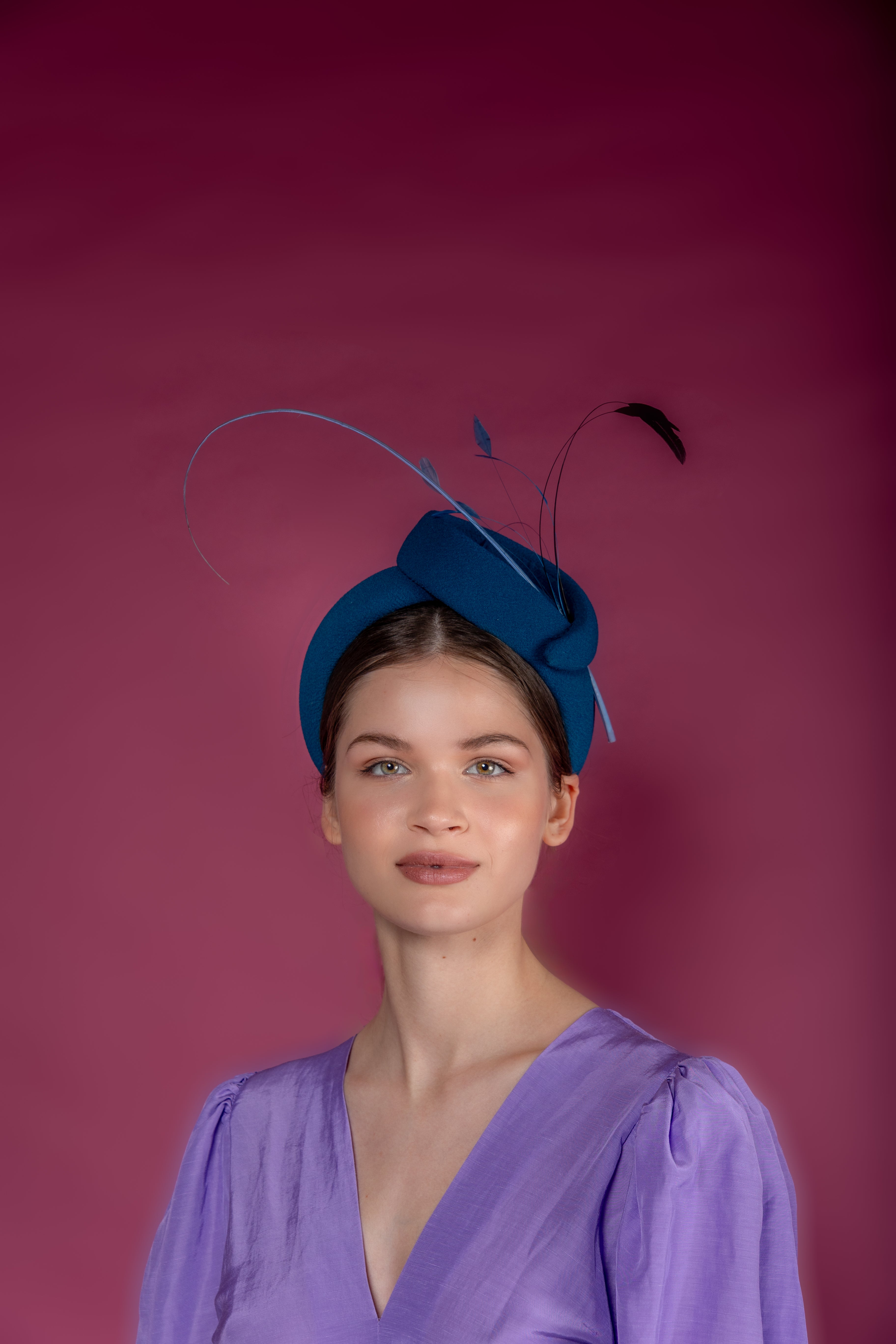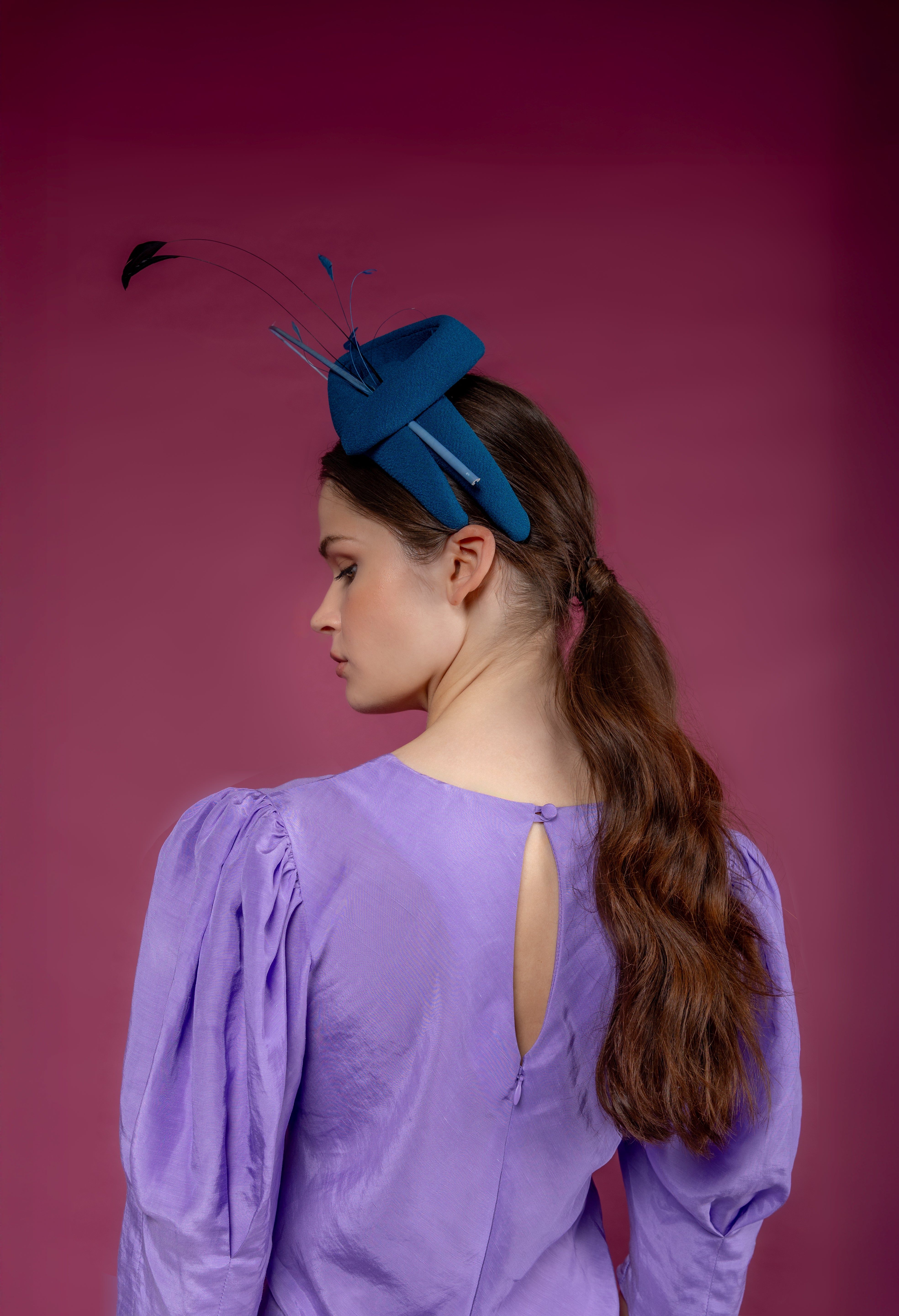 Diadema con estructura ondulada forrada en crepe azul petroleo, raquis y antenitas al tono