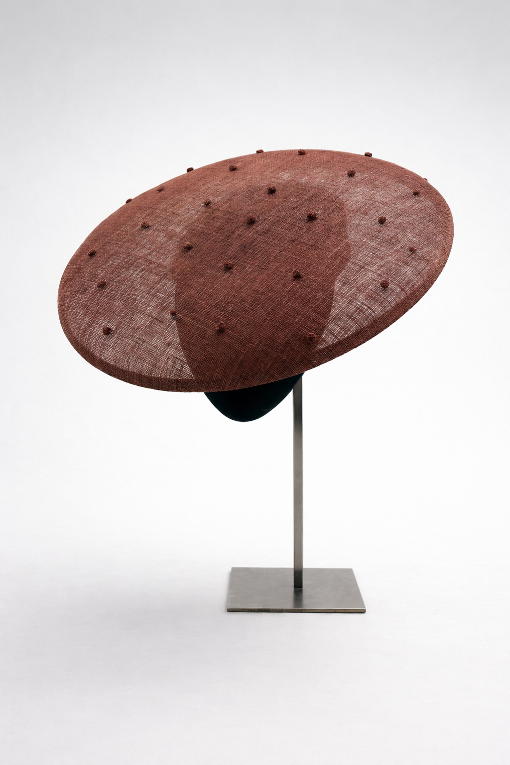 Pamela de ala redonda de sinamay color teja con topitos montada sobre casquete lágrima