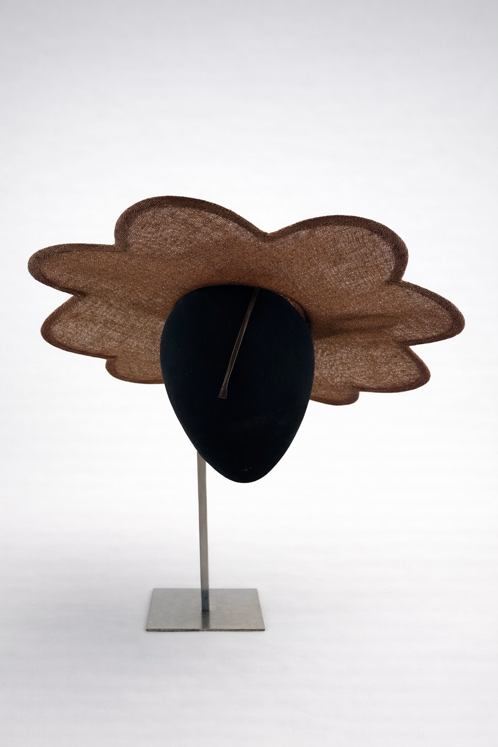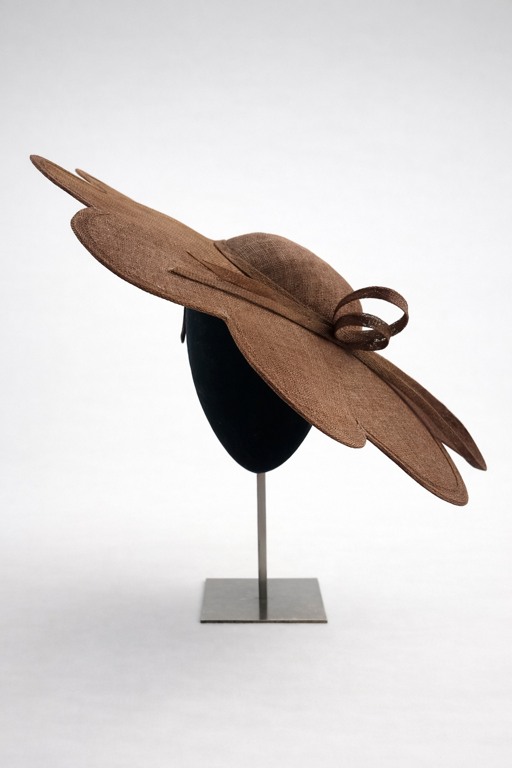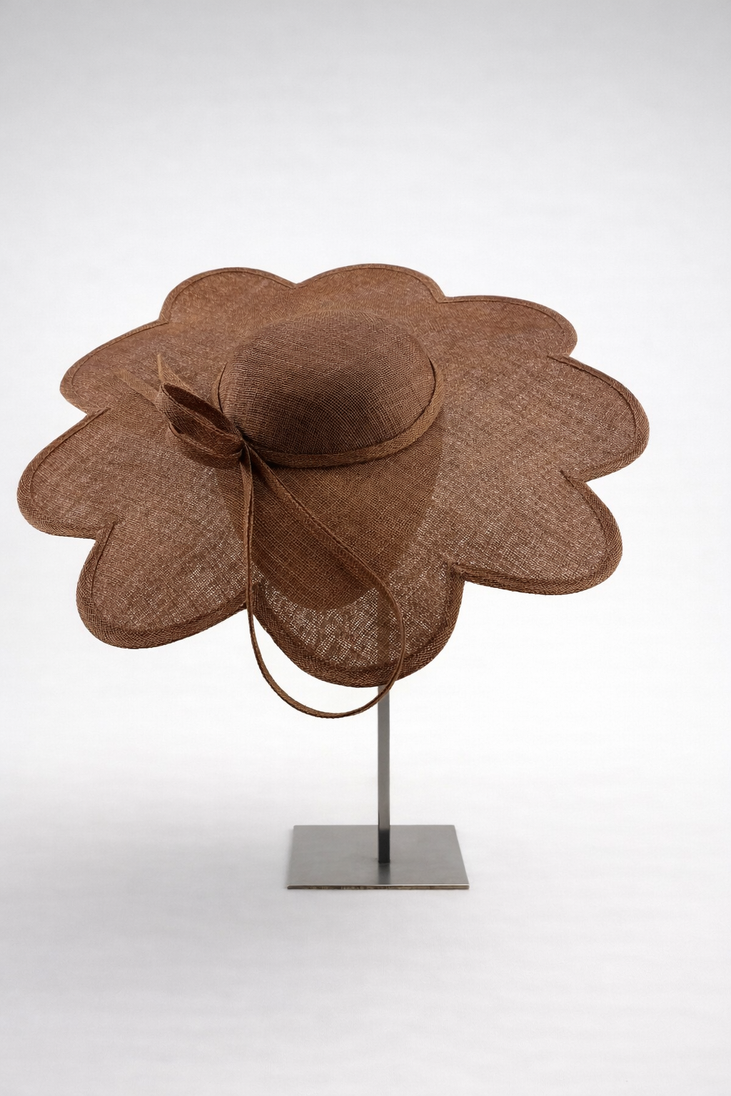 Pamela de sinamay tostado en forma de flor con lazada de sinamay al tono