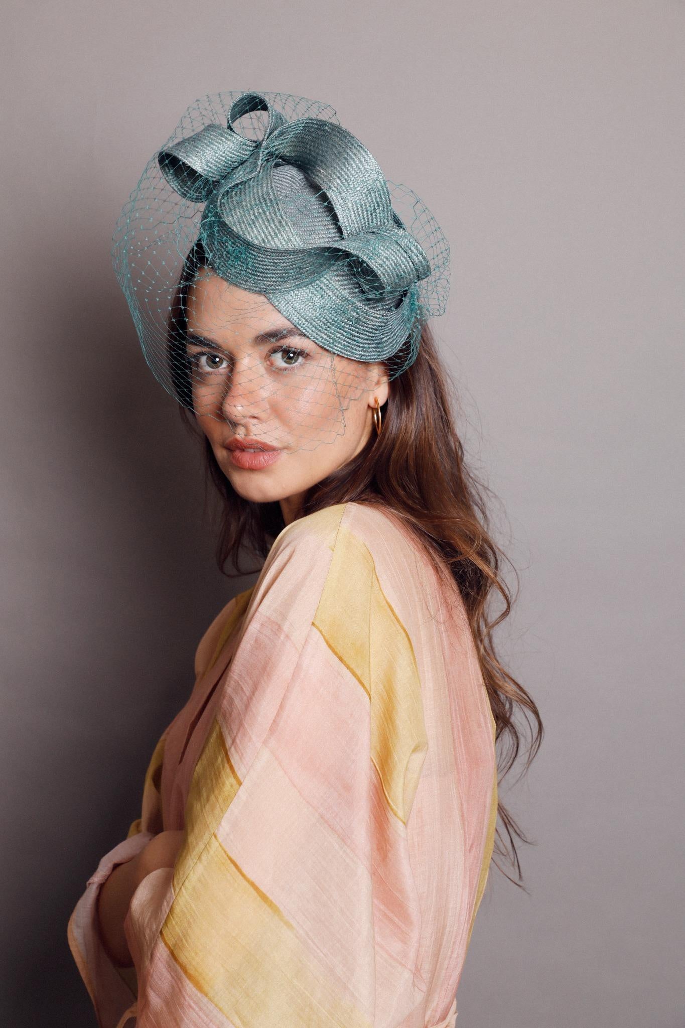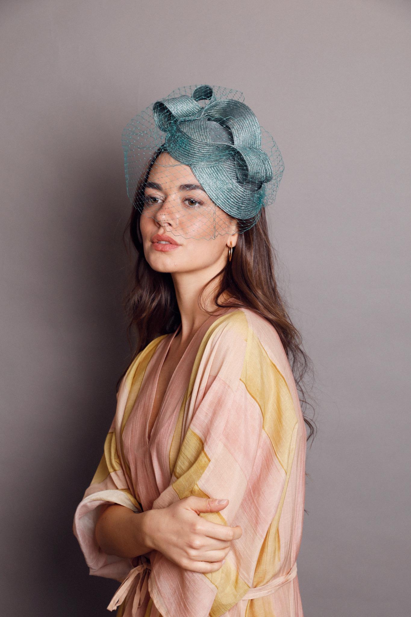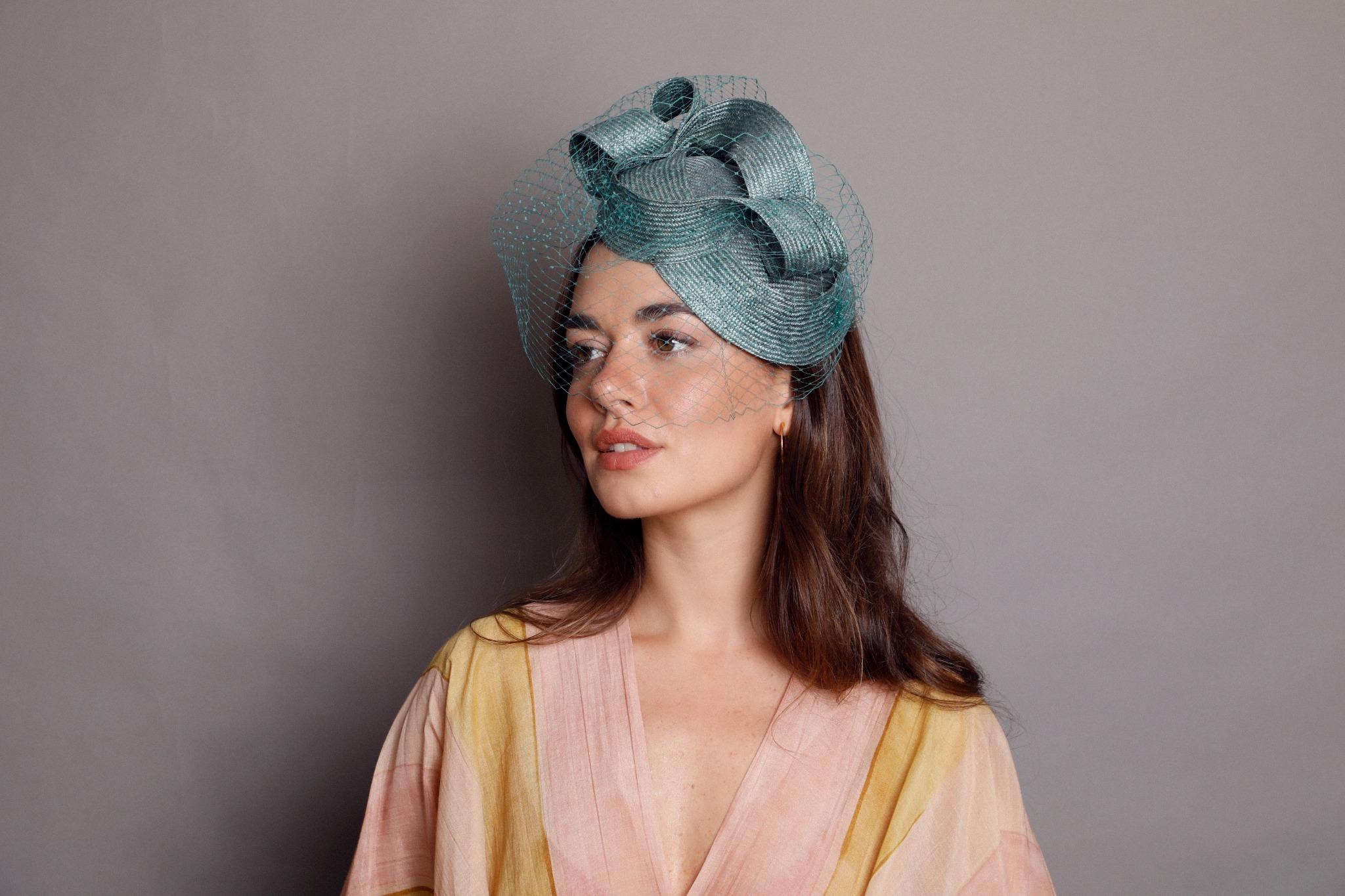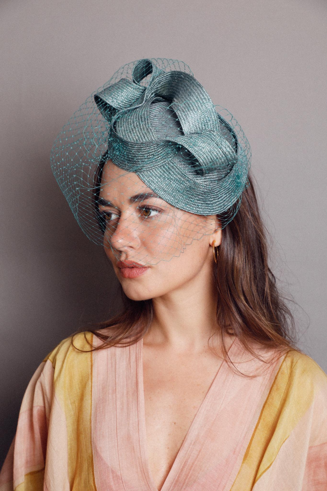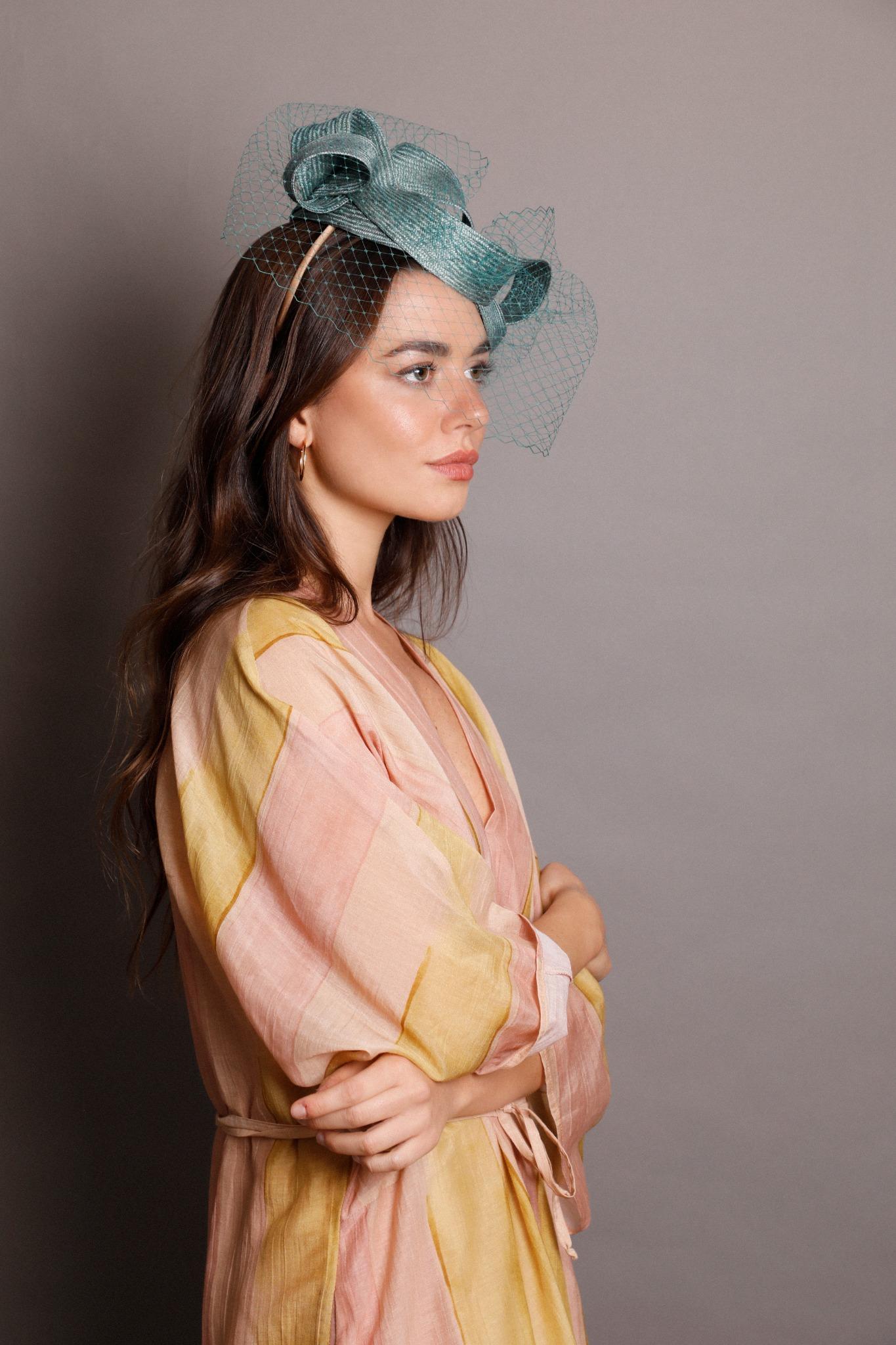 Casquete lágrima de parasisal verde con lazada en la parte superior y velo al tono