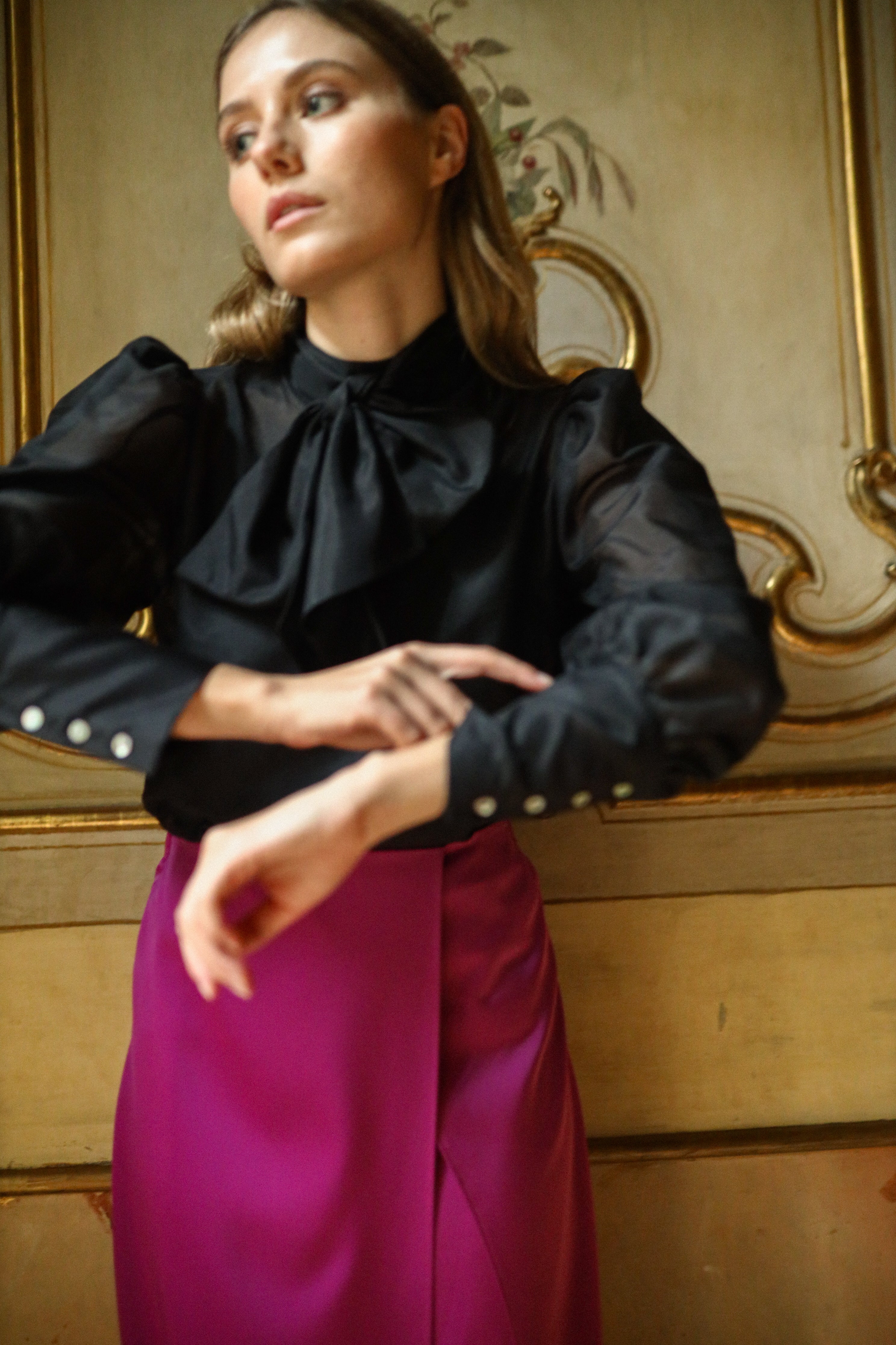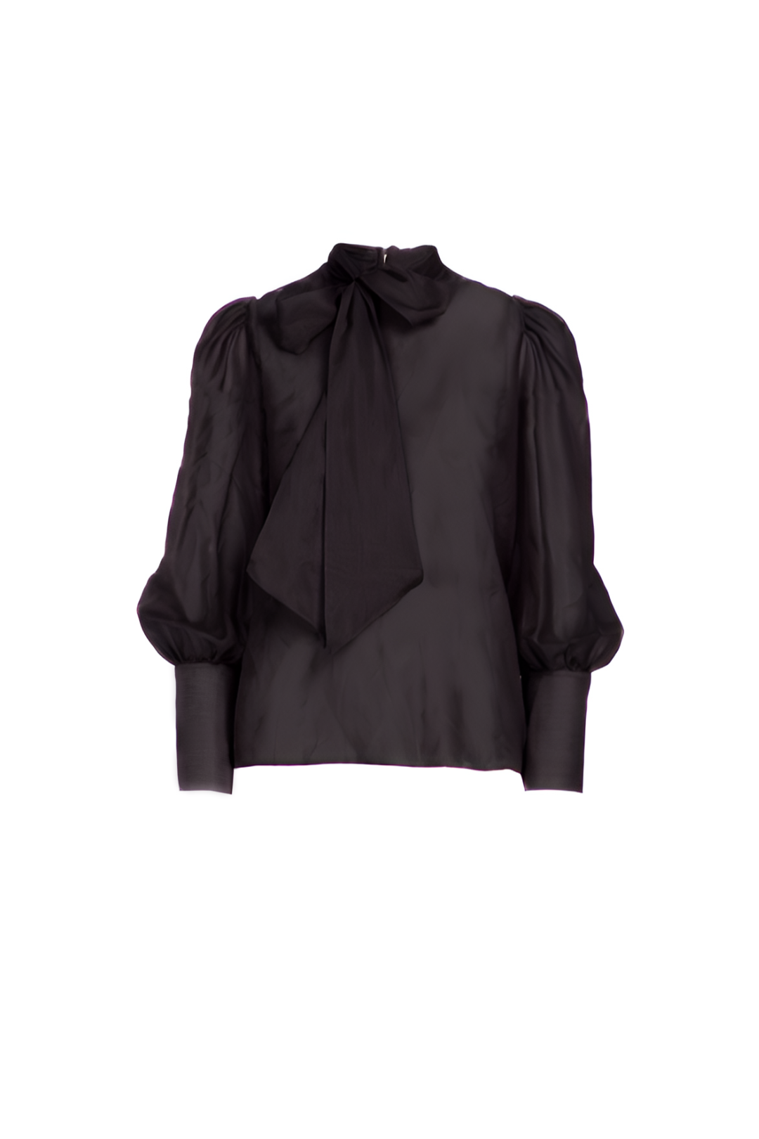 Long-sleeved blouse with a high neck with a bow and puffed sleeves.