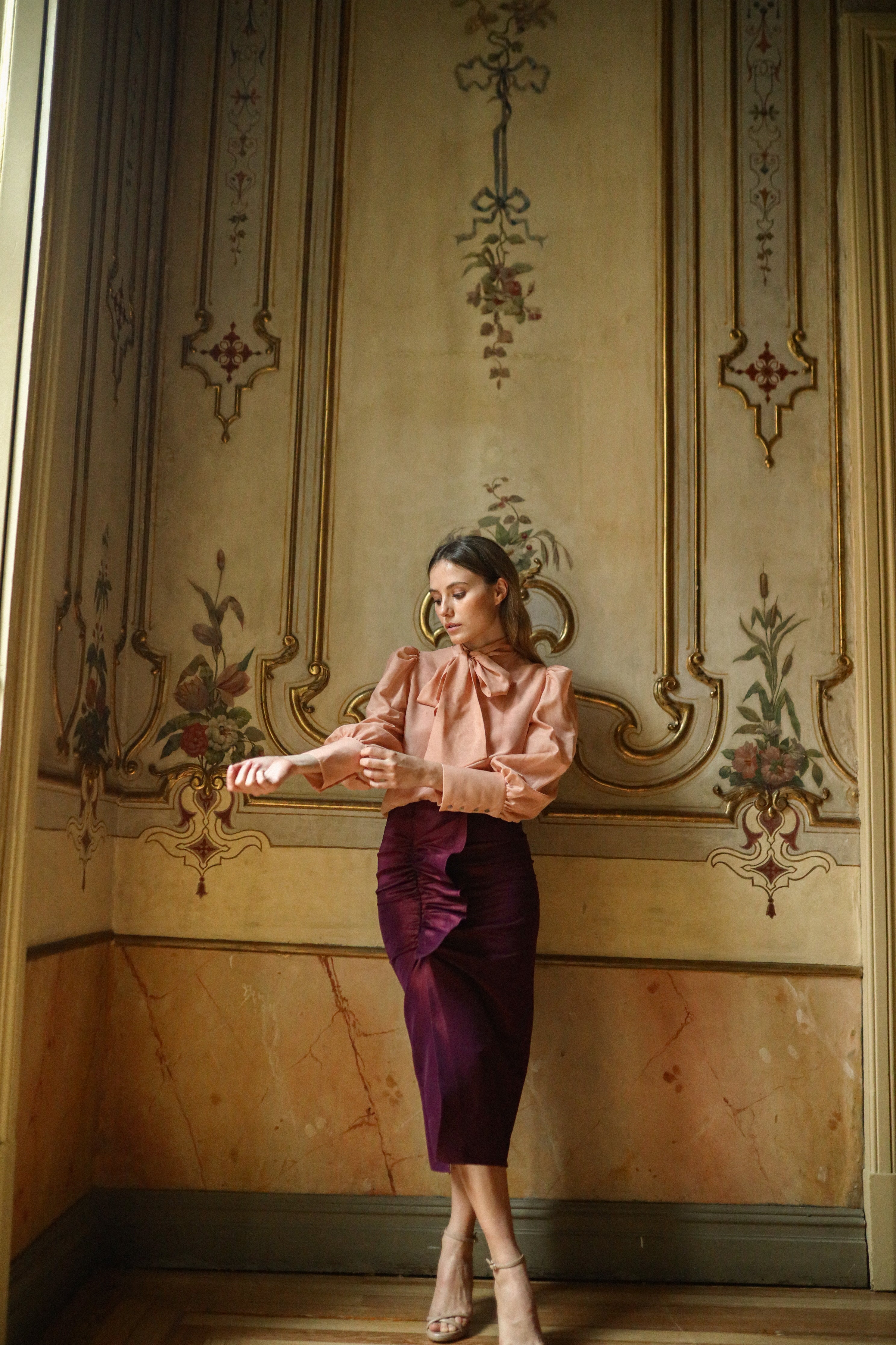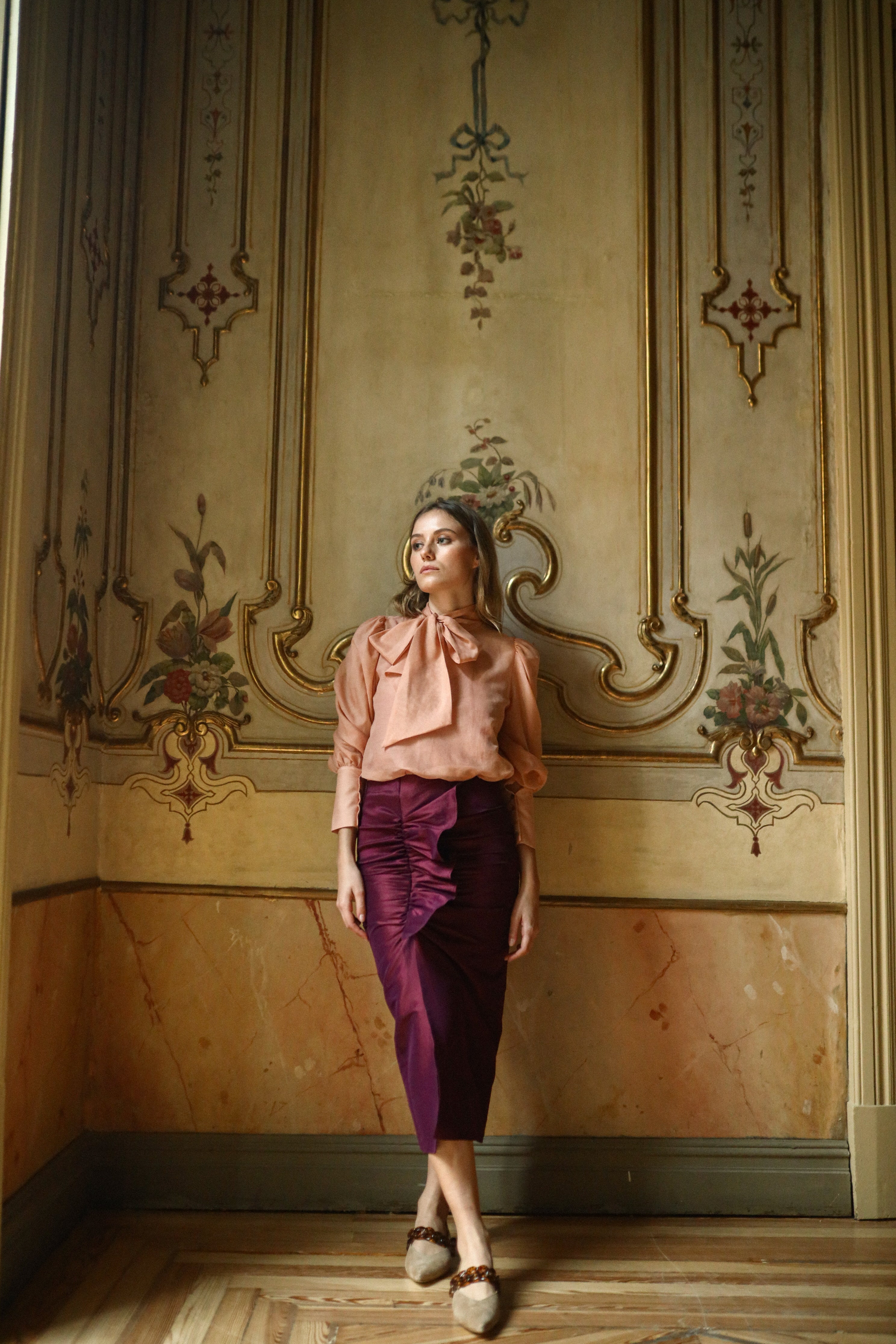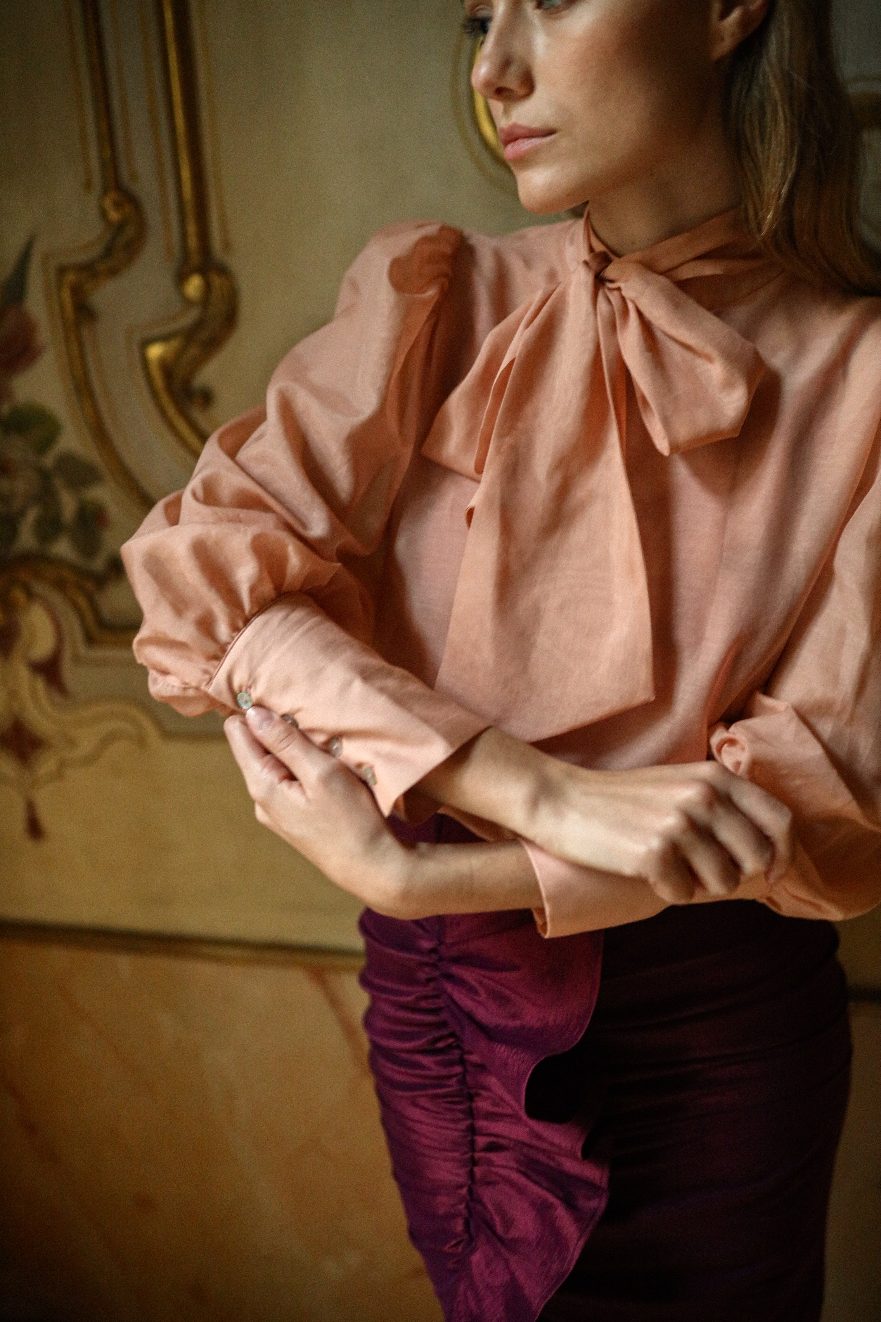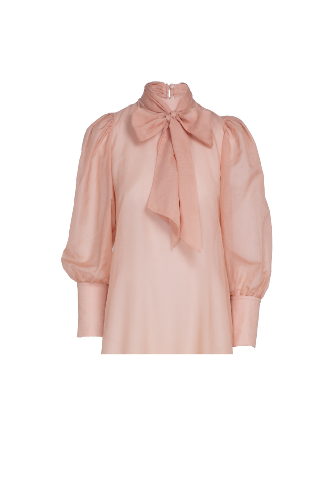 Long-sleeved blouse with a high neck with a bow and puffed sleeves.