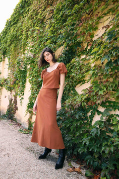 Top with sweetheart neckline and short puffed sleeves.