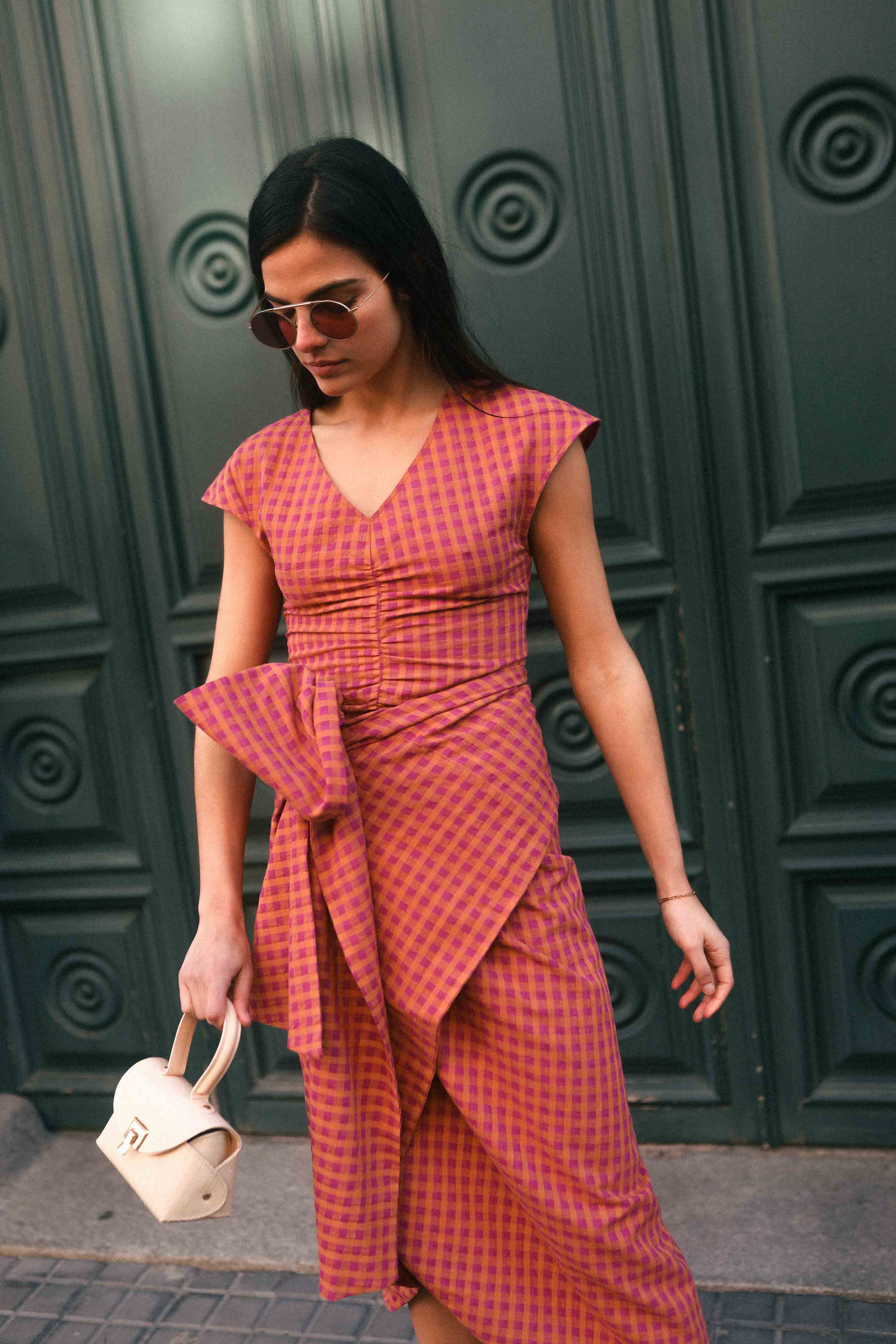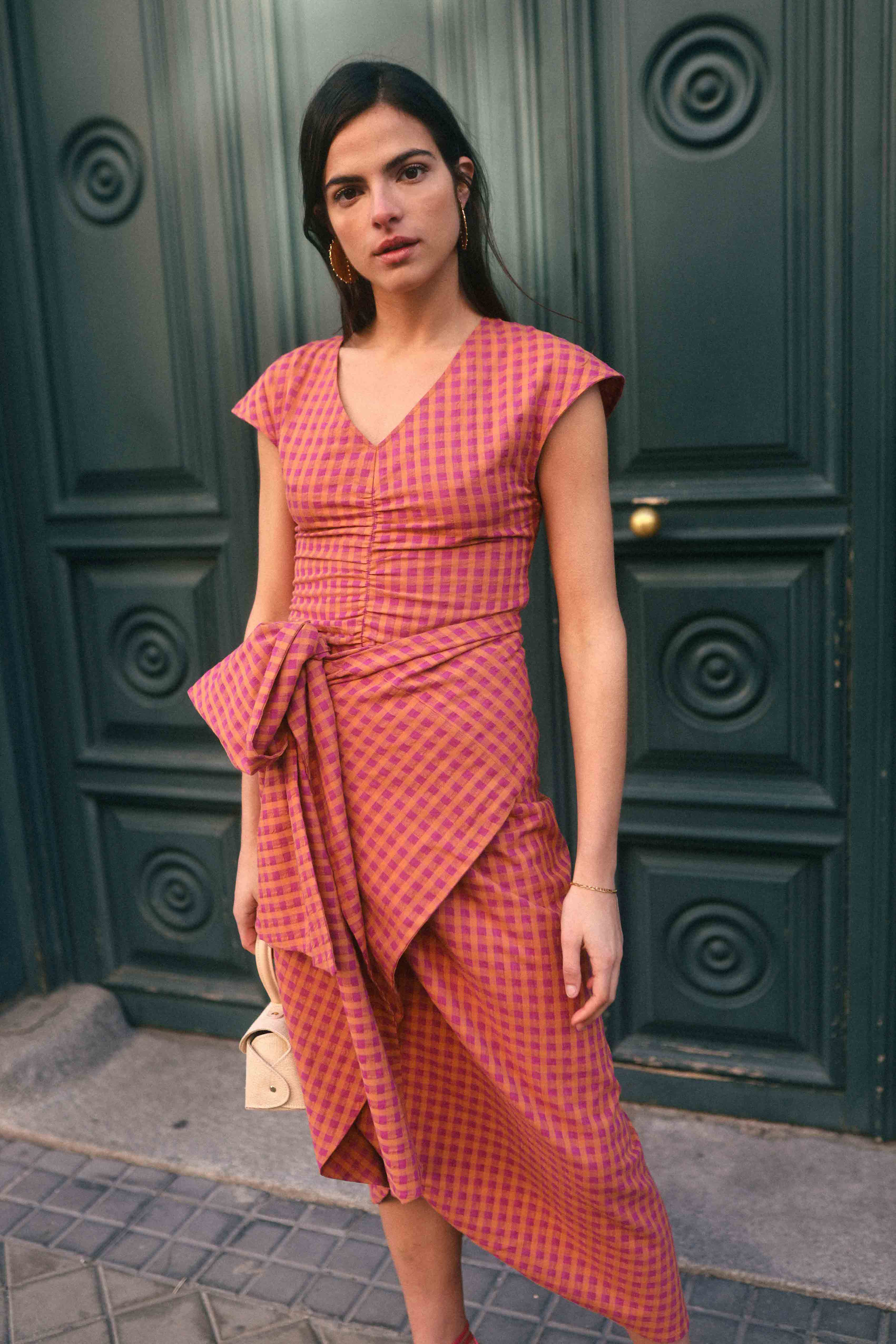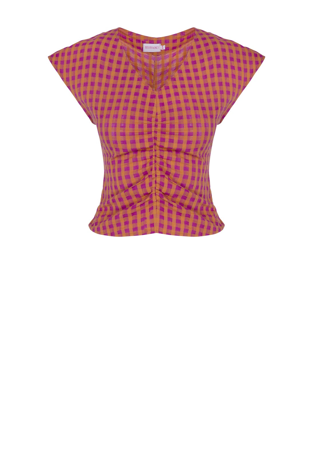 Sleeveless top with V-neckline and gathering.