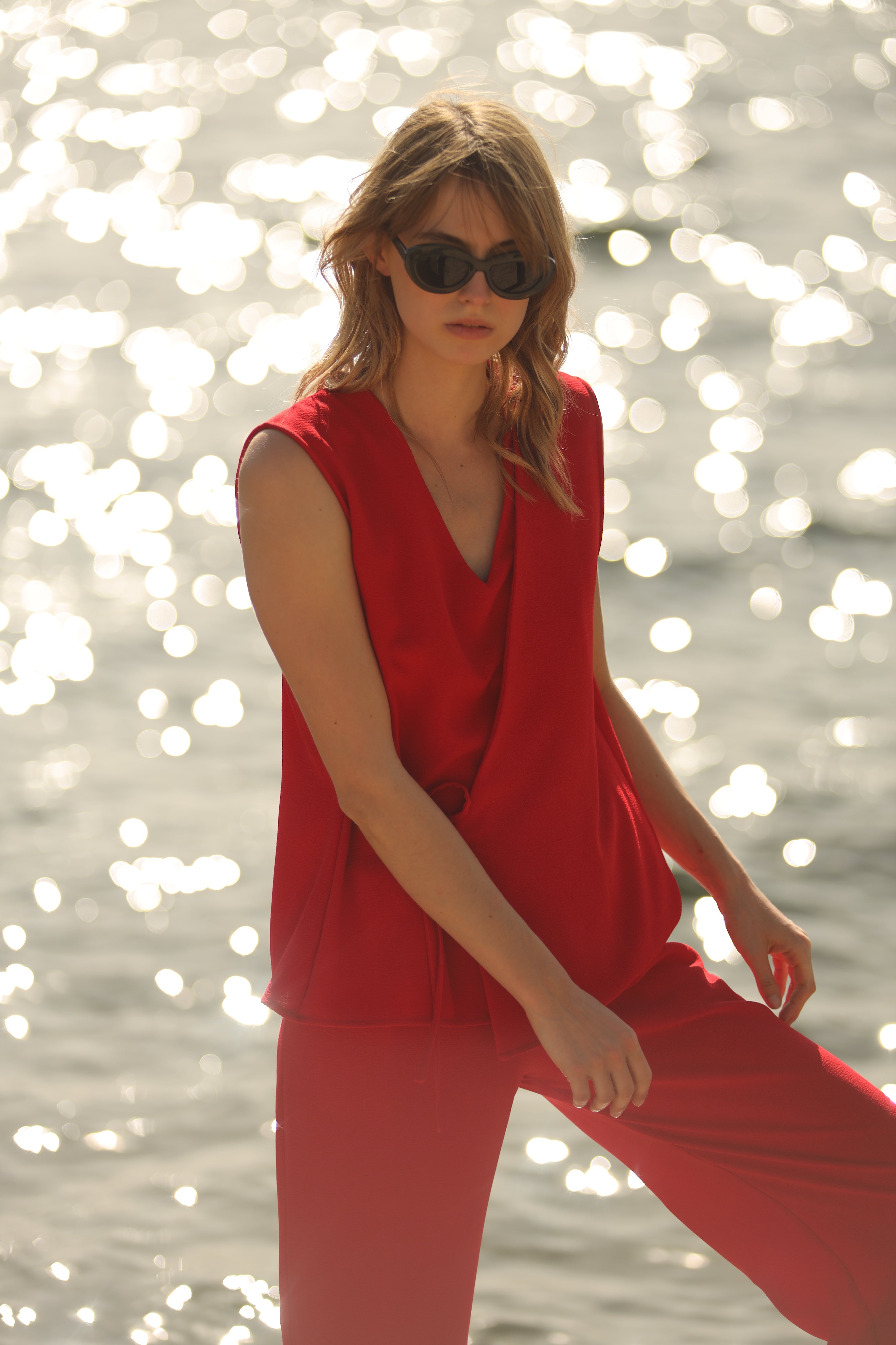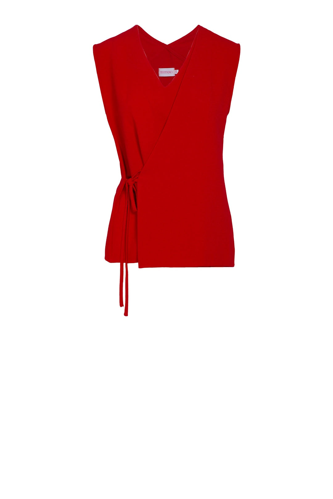 Sleeveless top, V-neckline with bow at the waist, and crossed back.