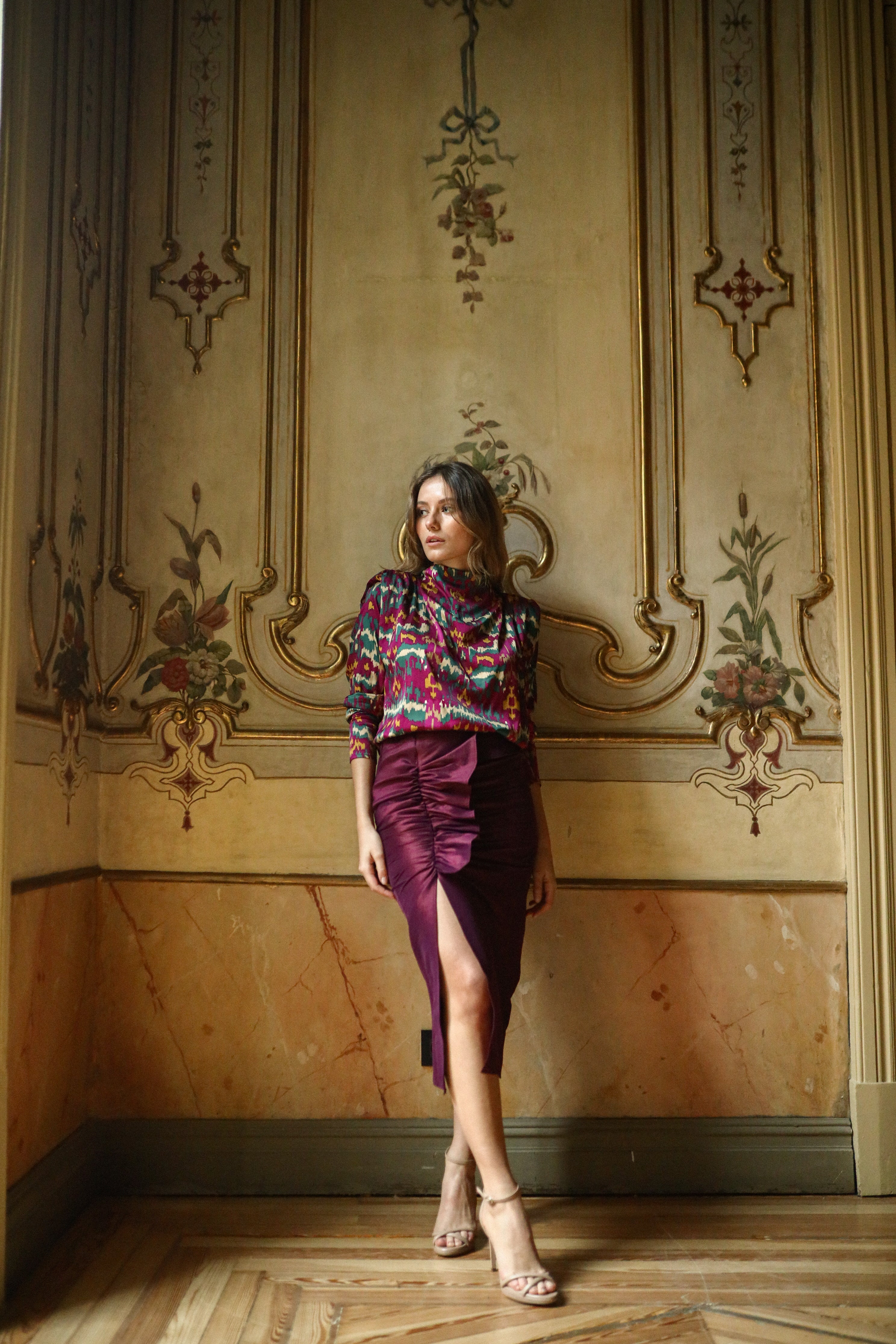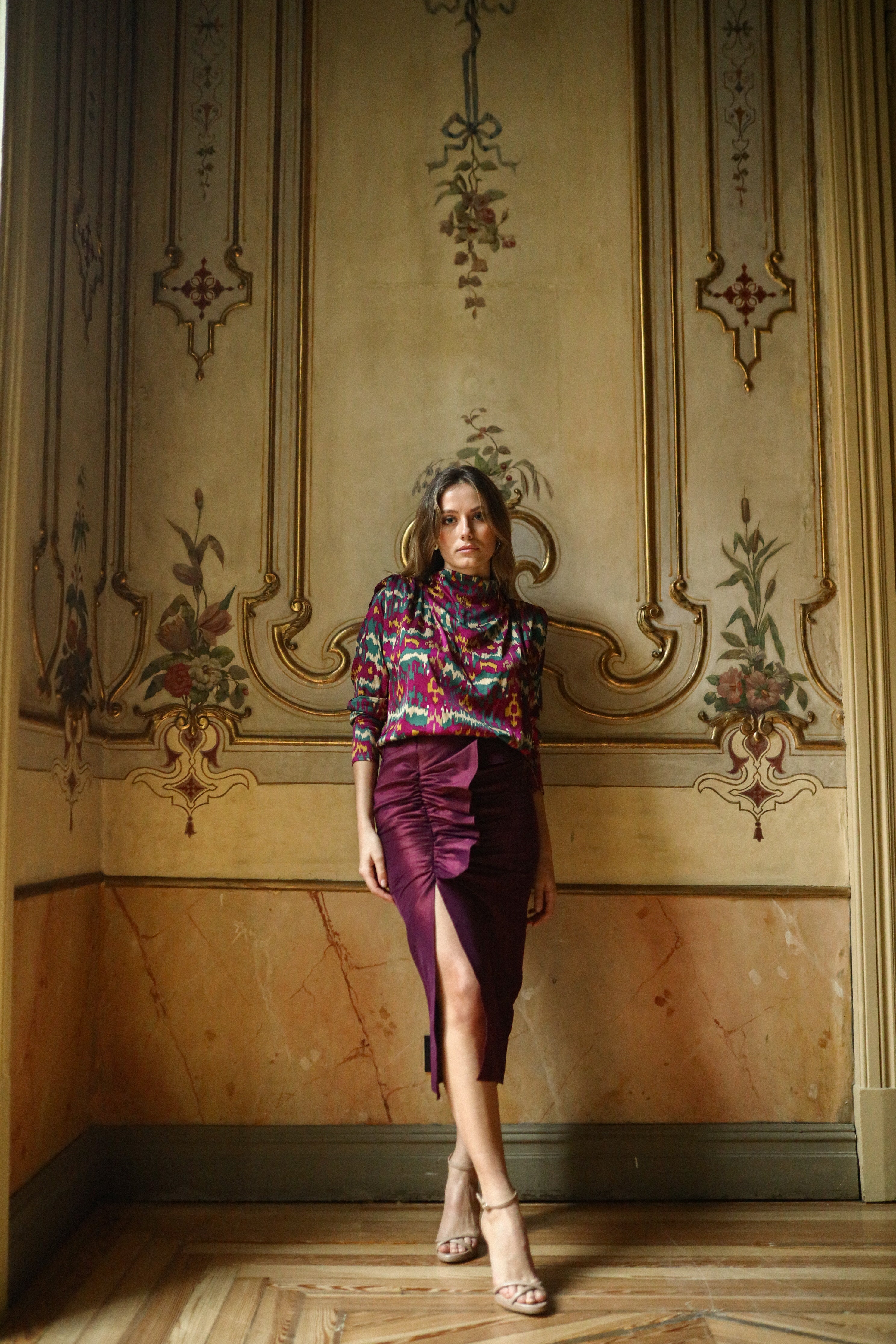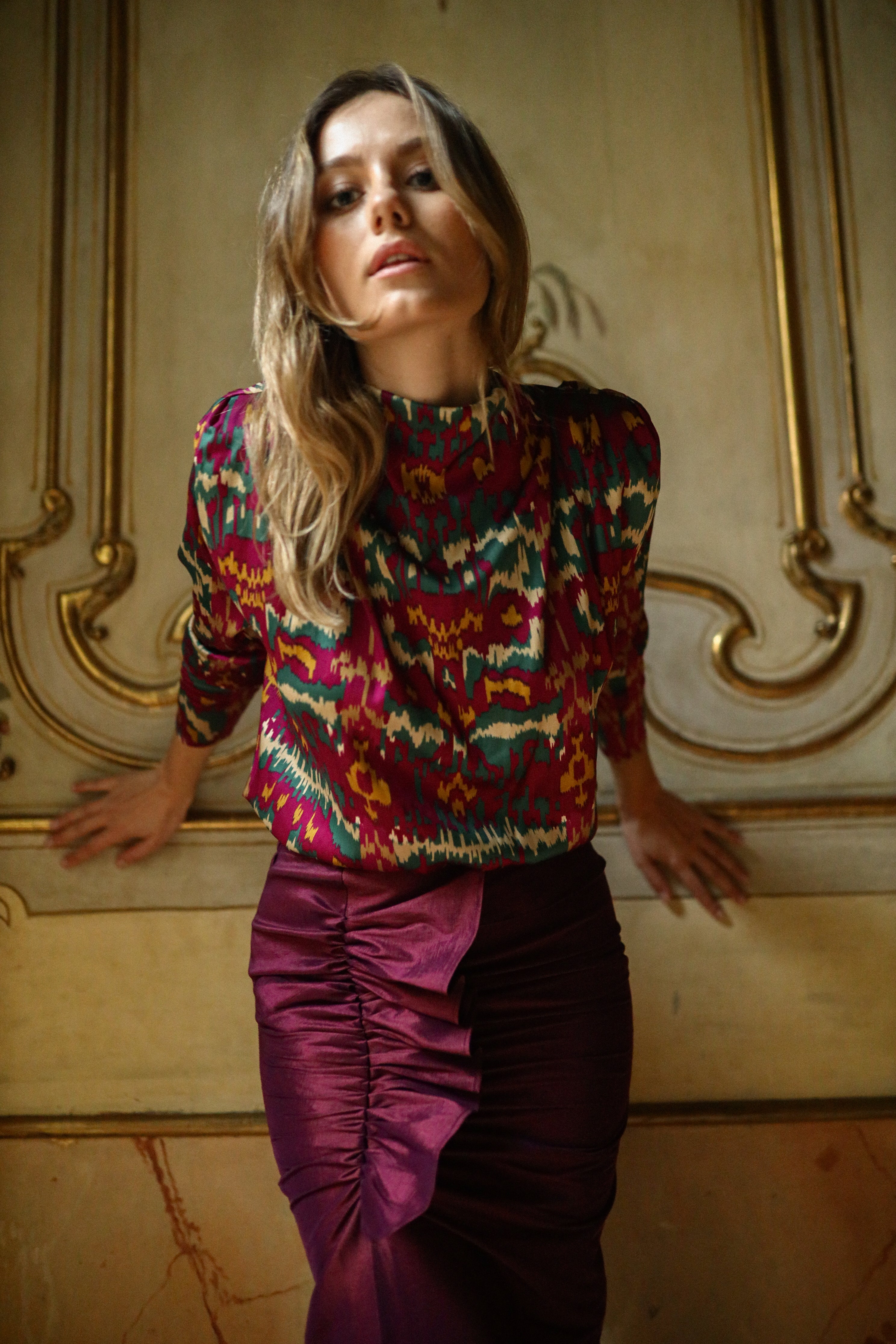 Shirt with shoulder pads, long sleeves and a Perkins collar.