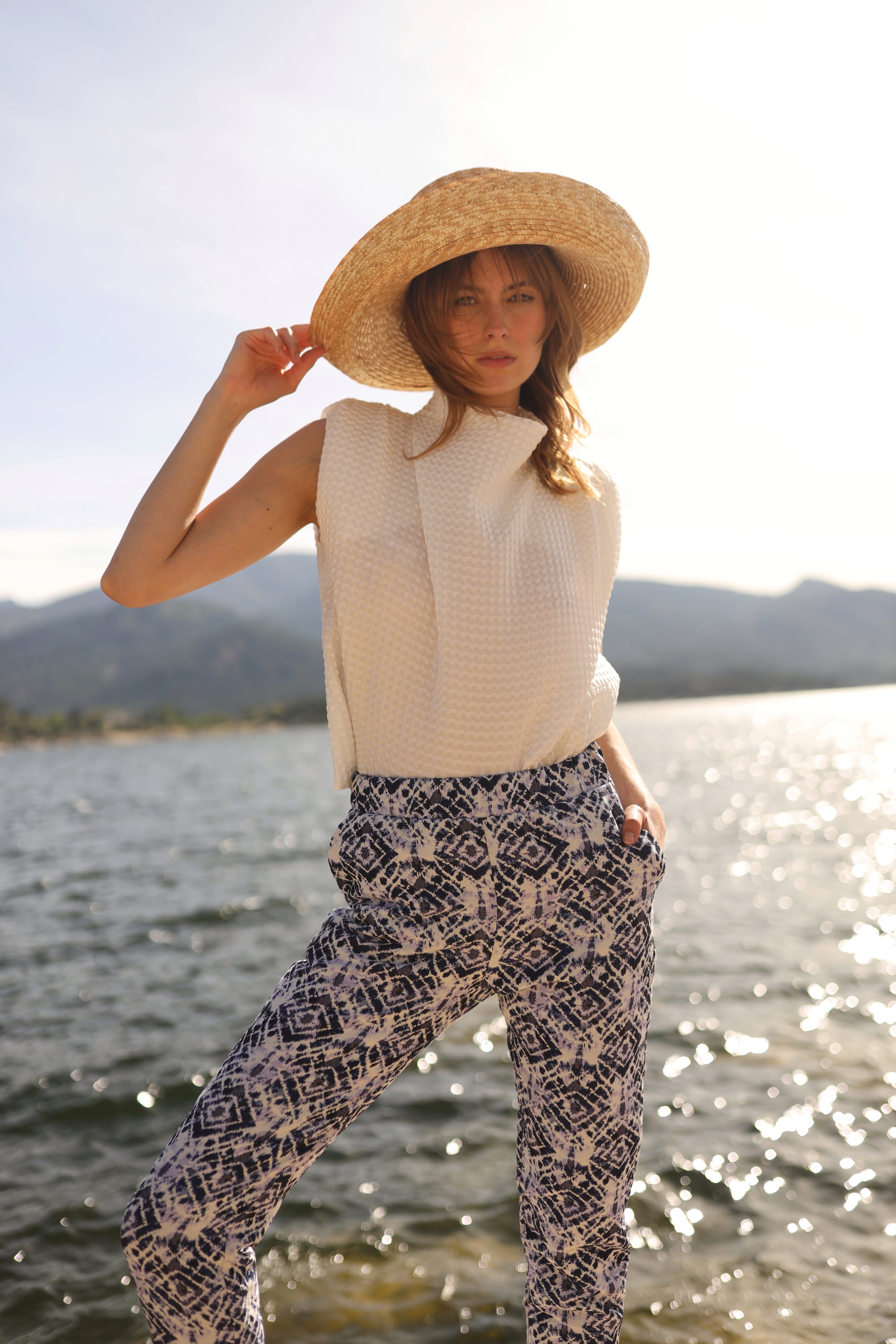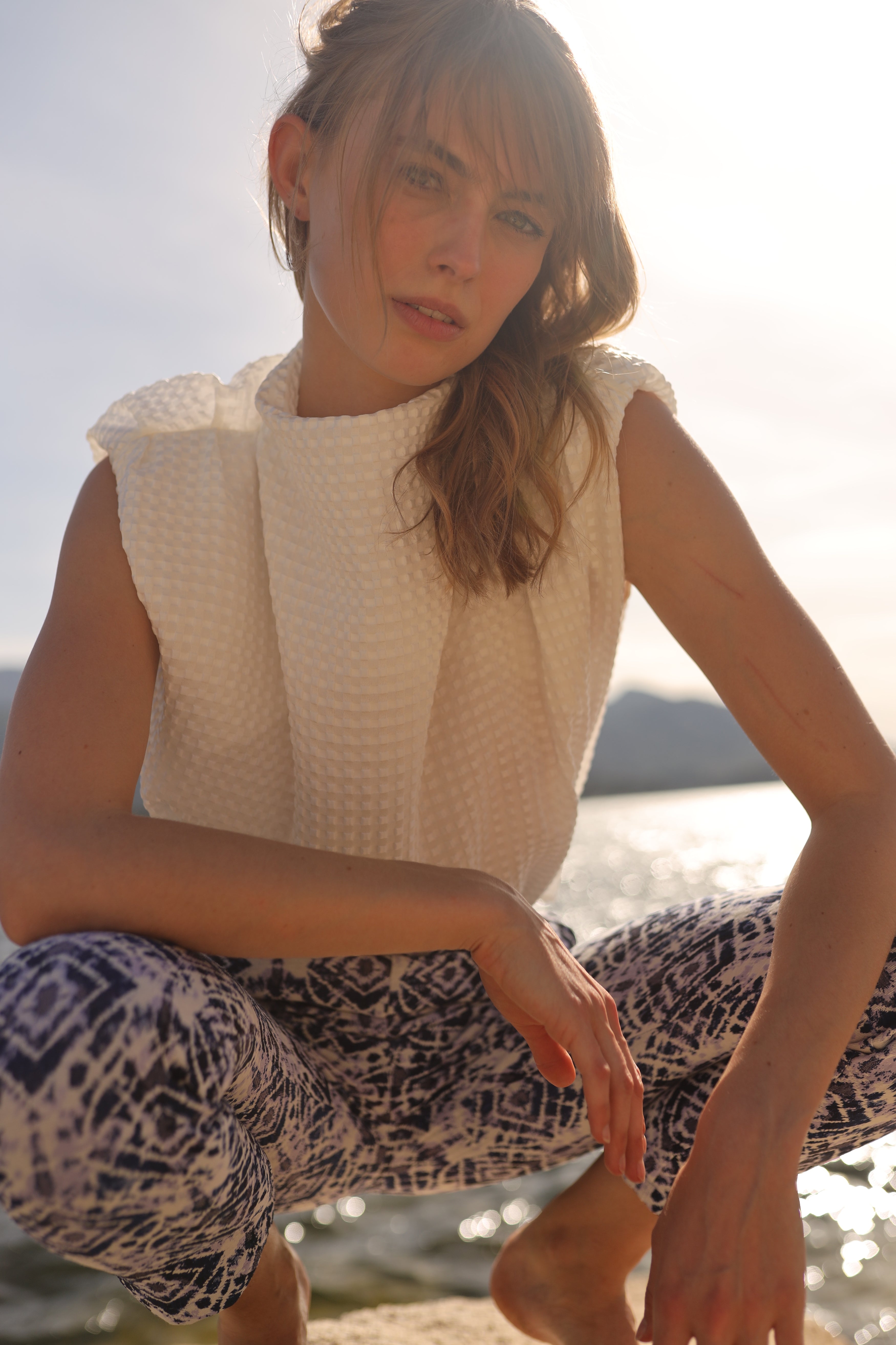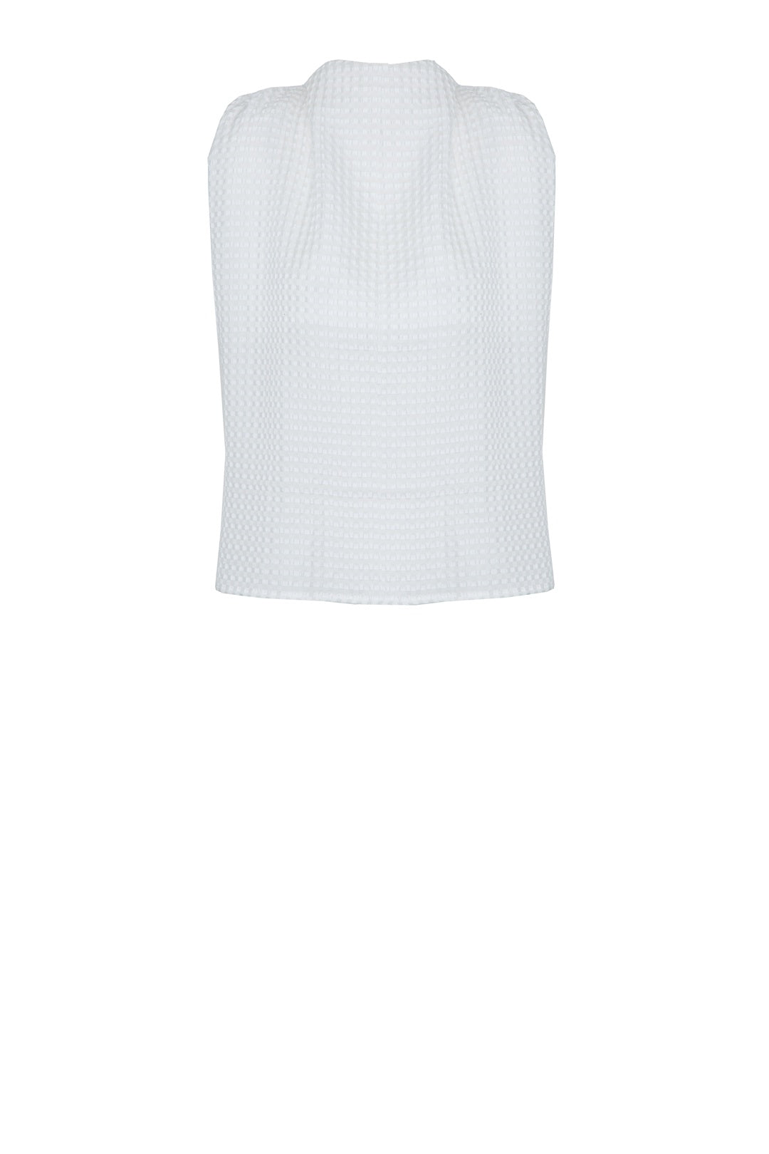 Shirt with shoulder pads, sleeveless and Perkins collar.