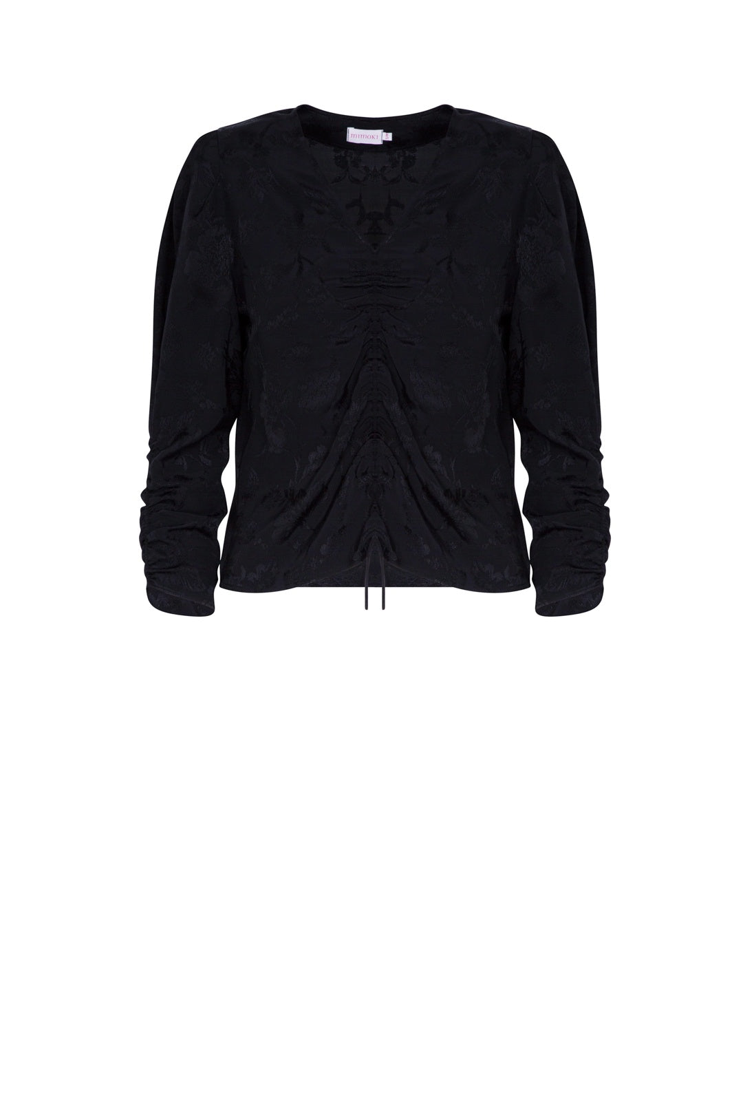 Black top, central gathering and V-neck.