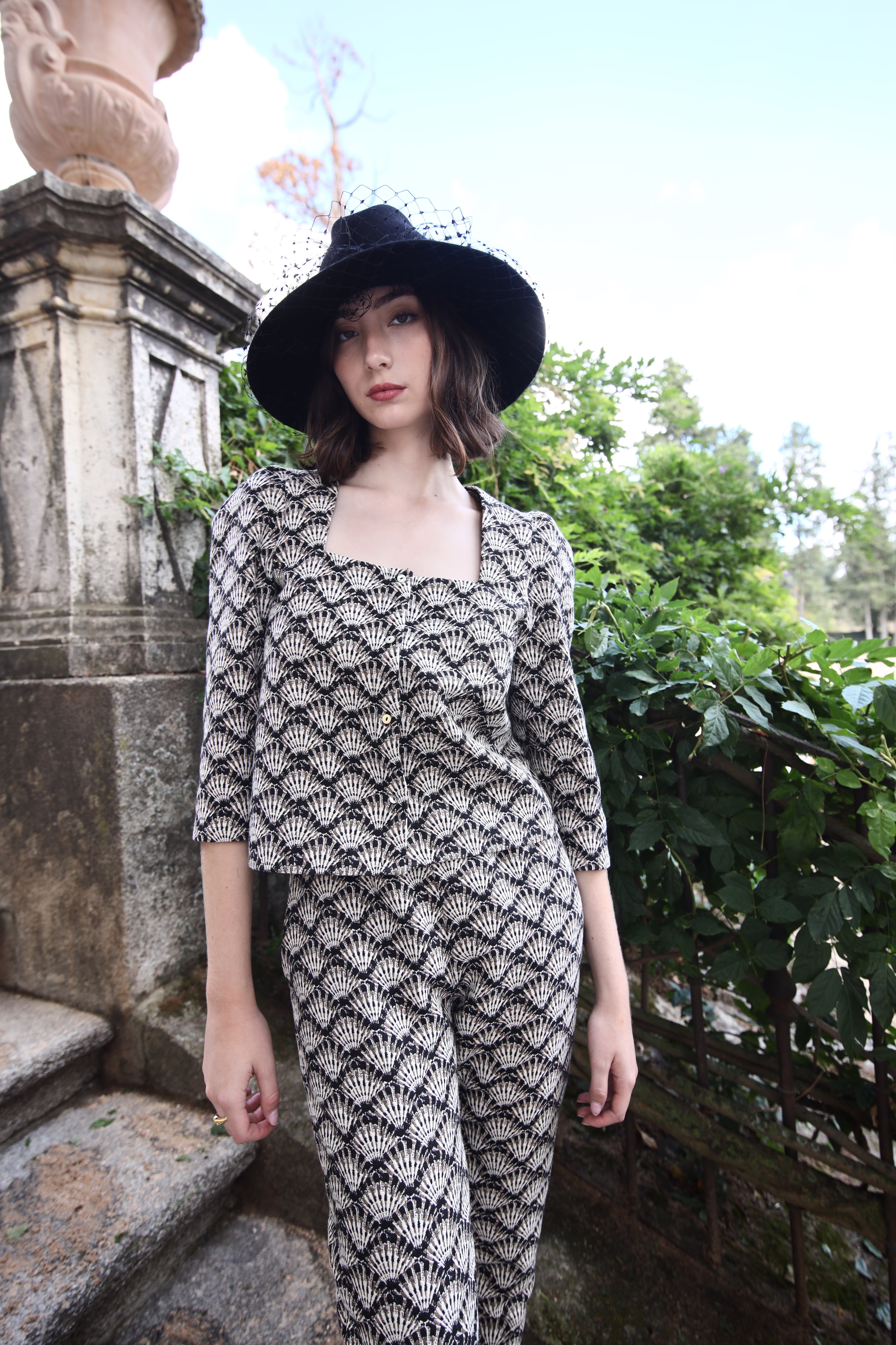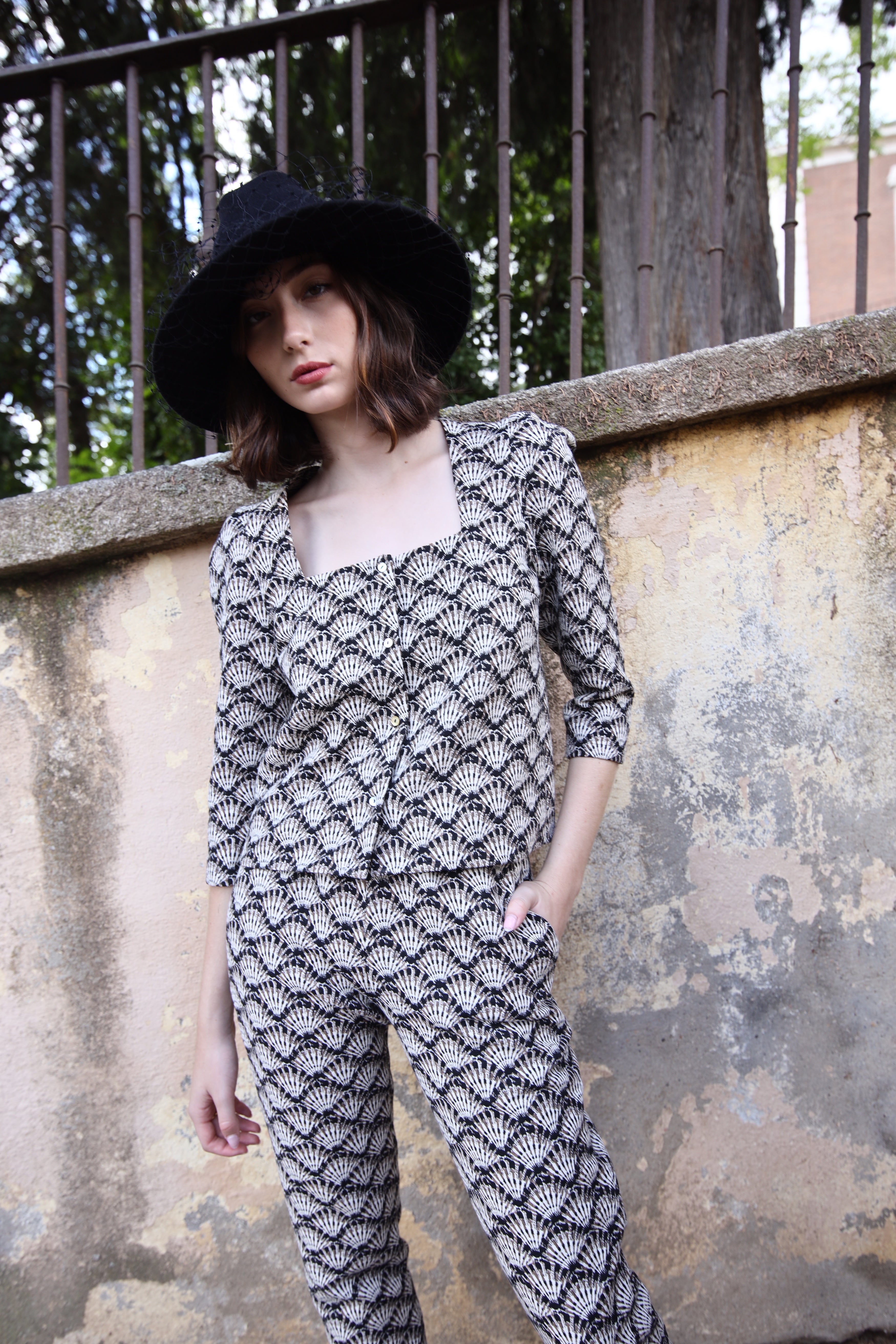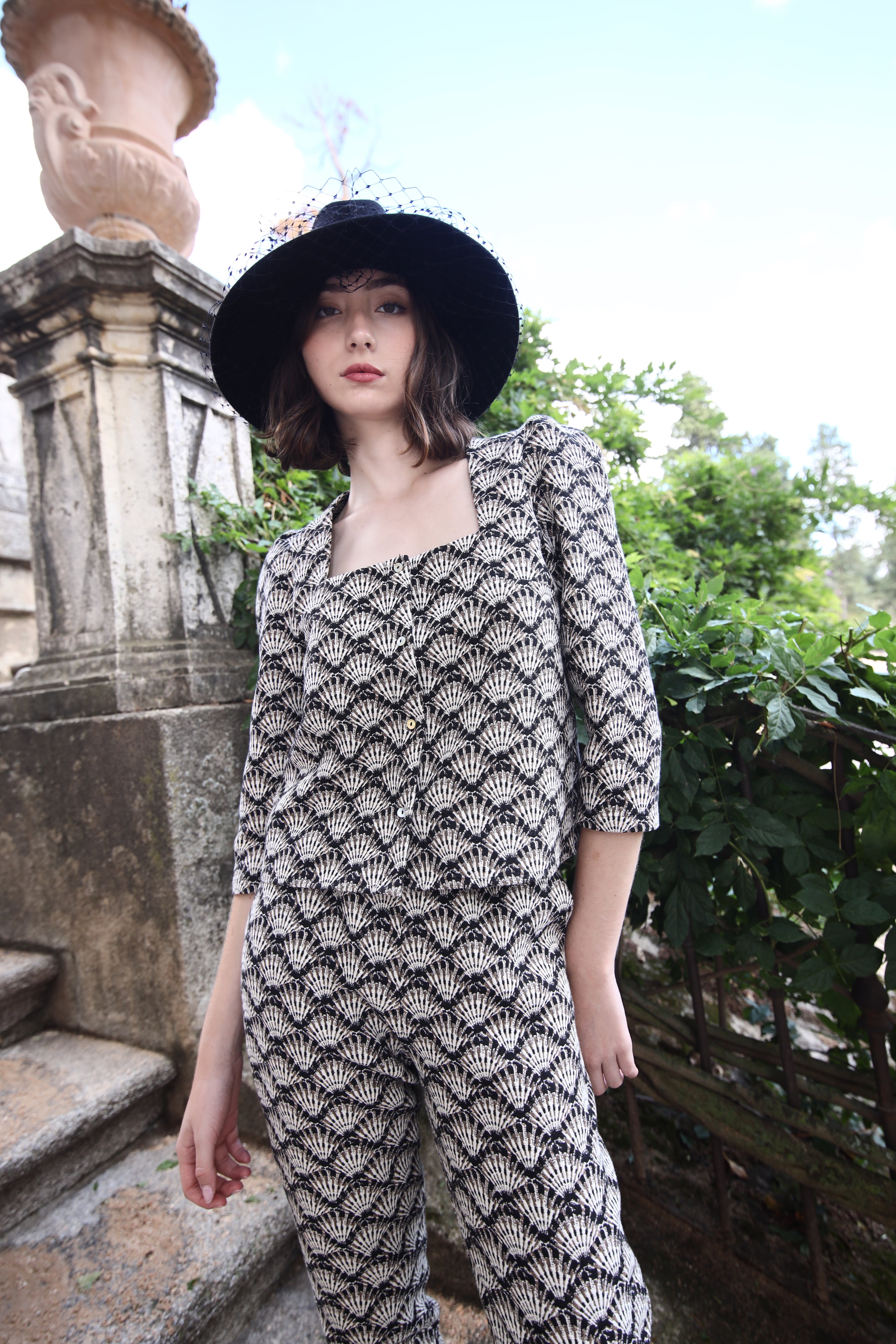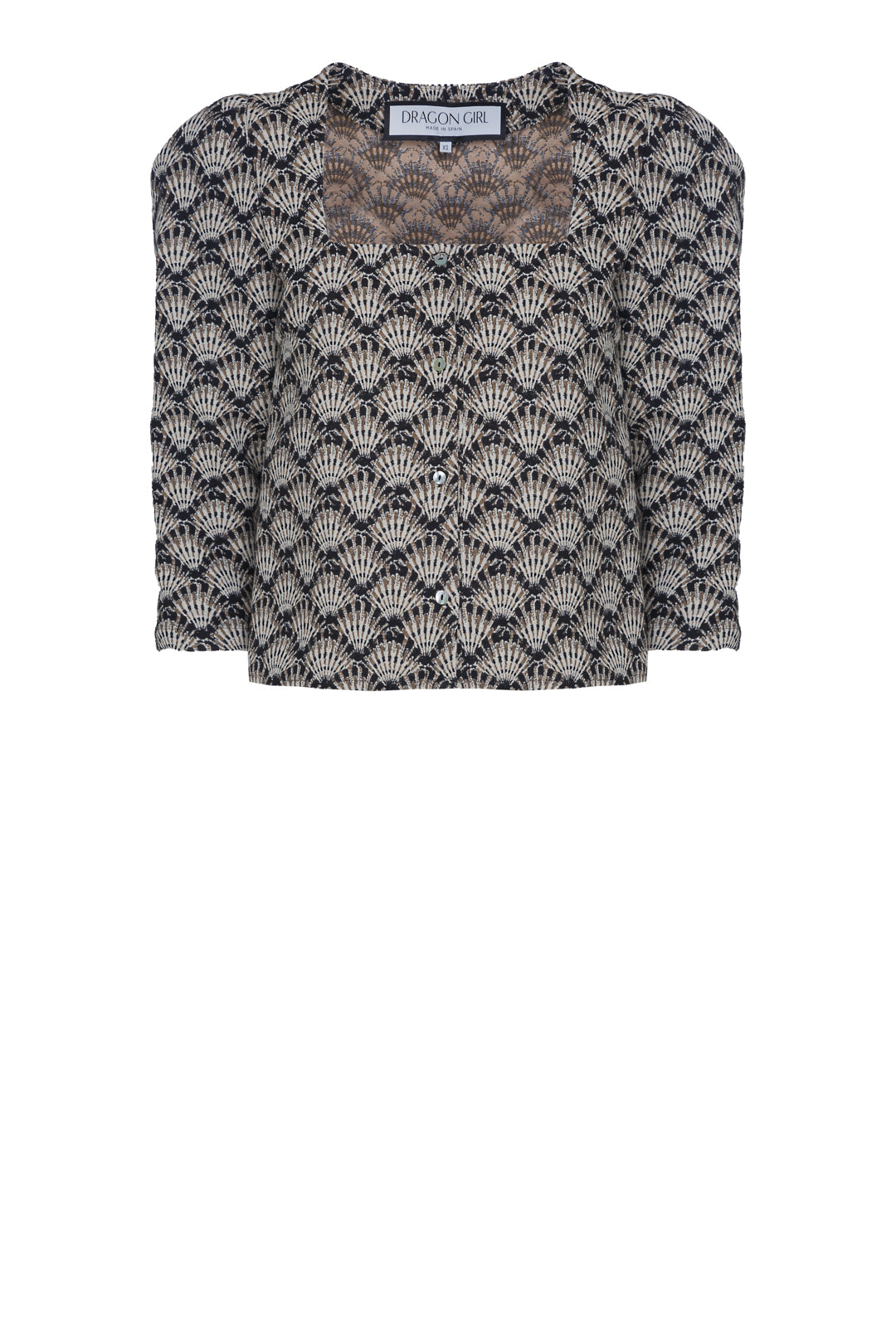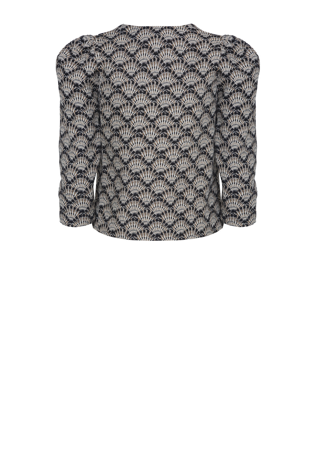 Top with trapeze neckline and puffed sleeves.
