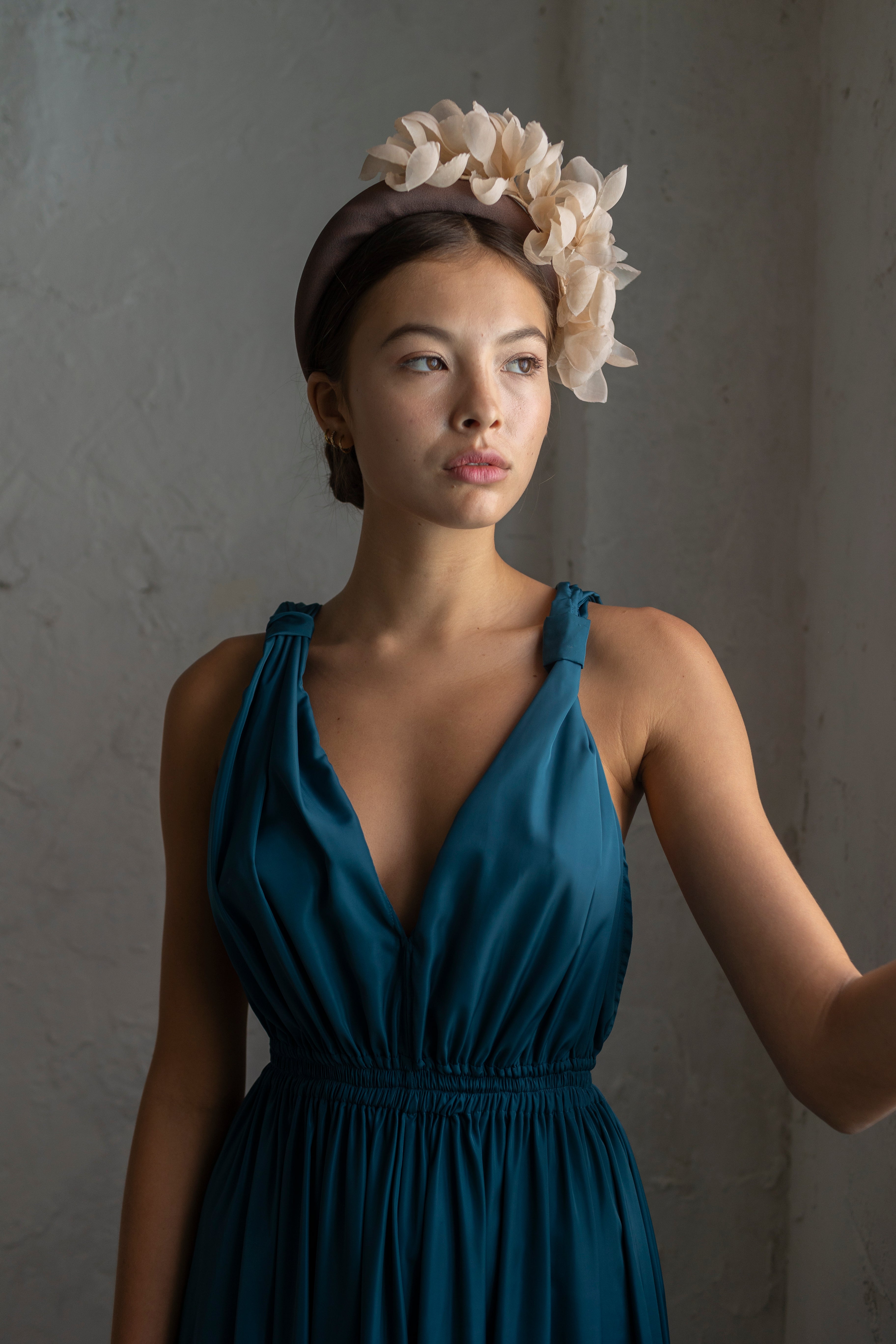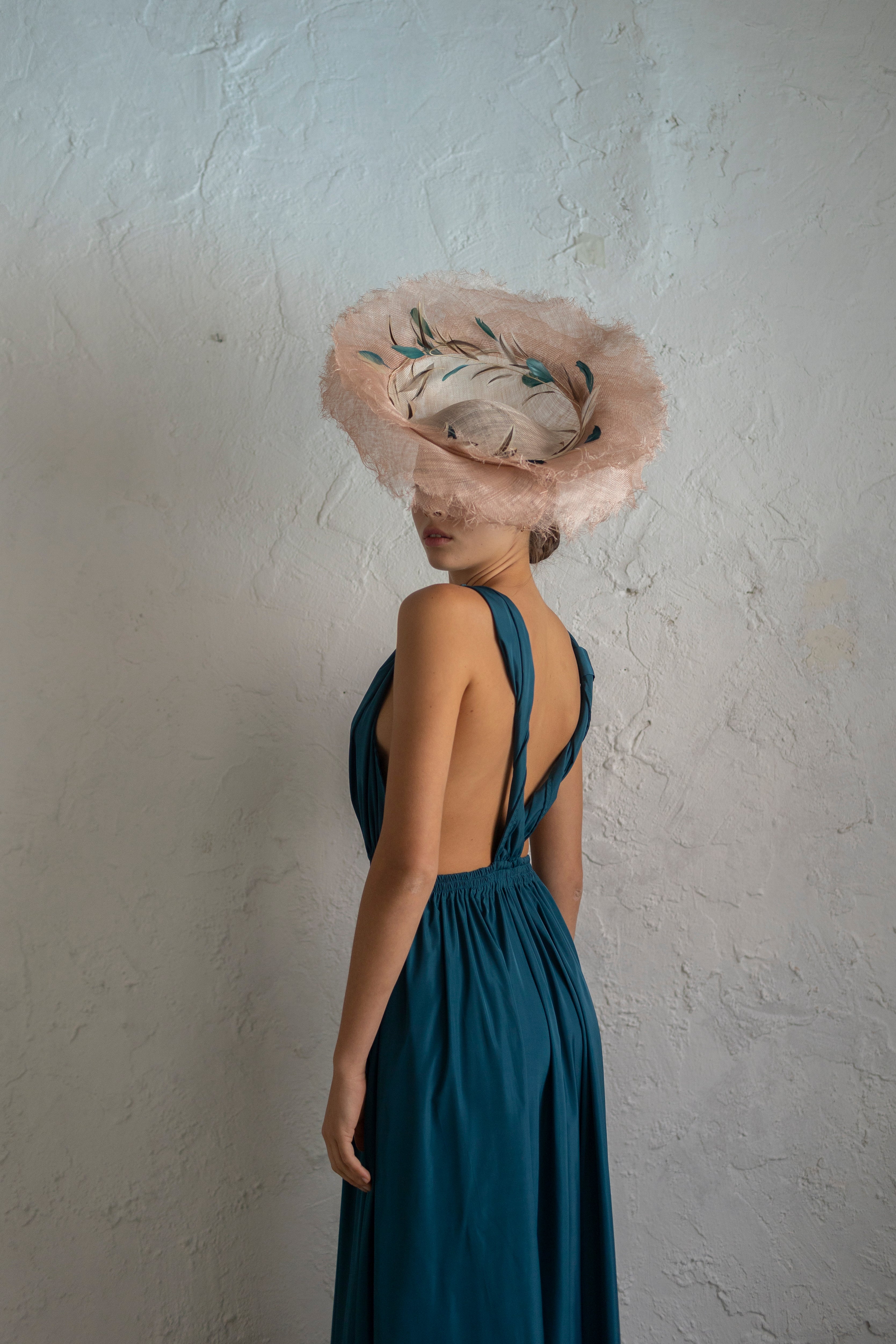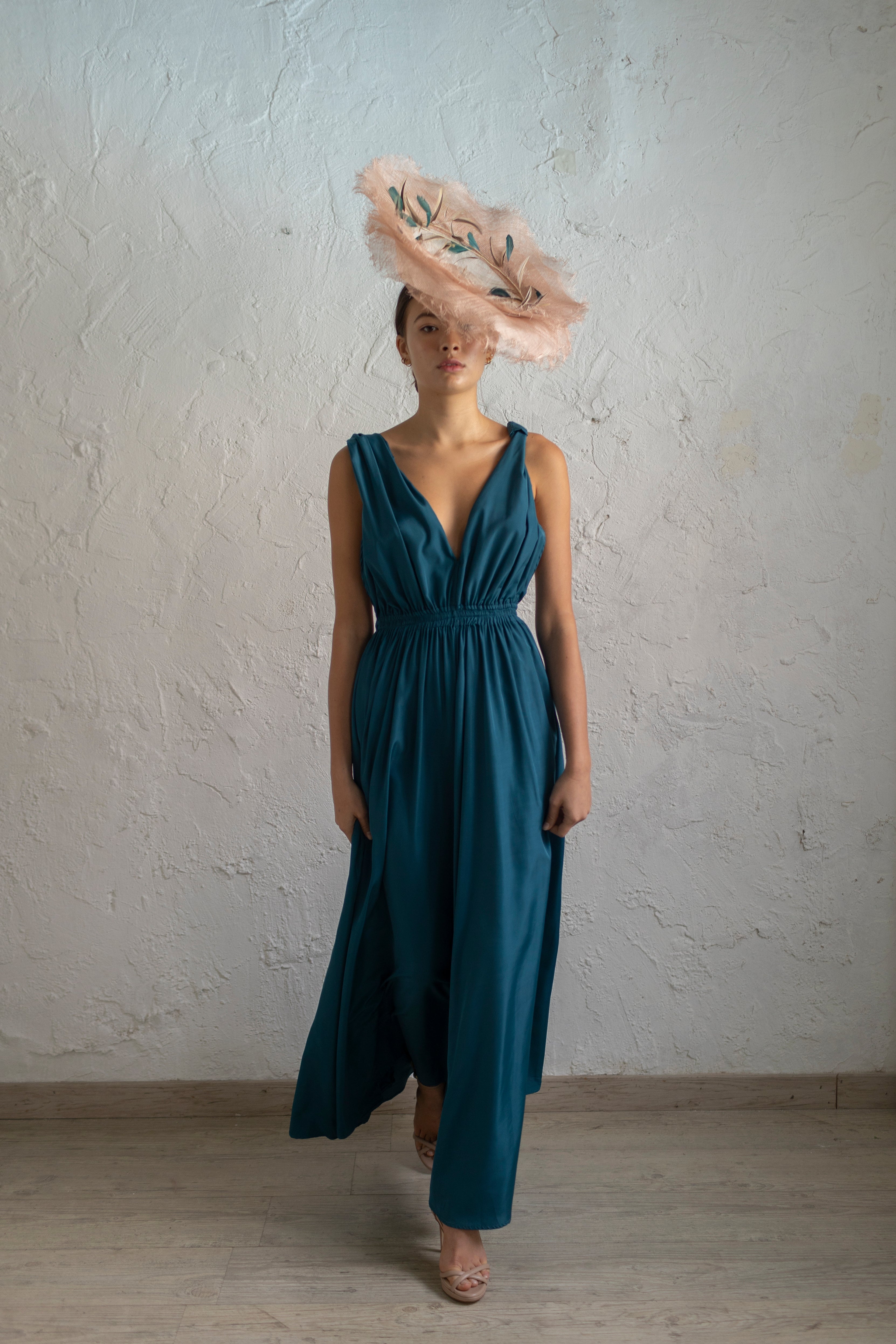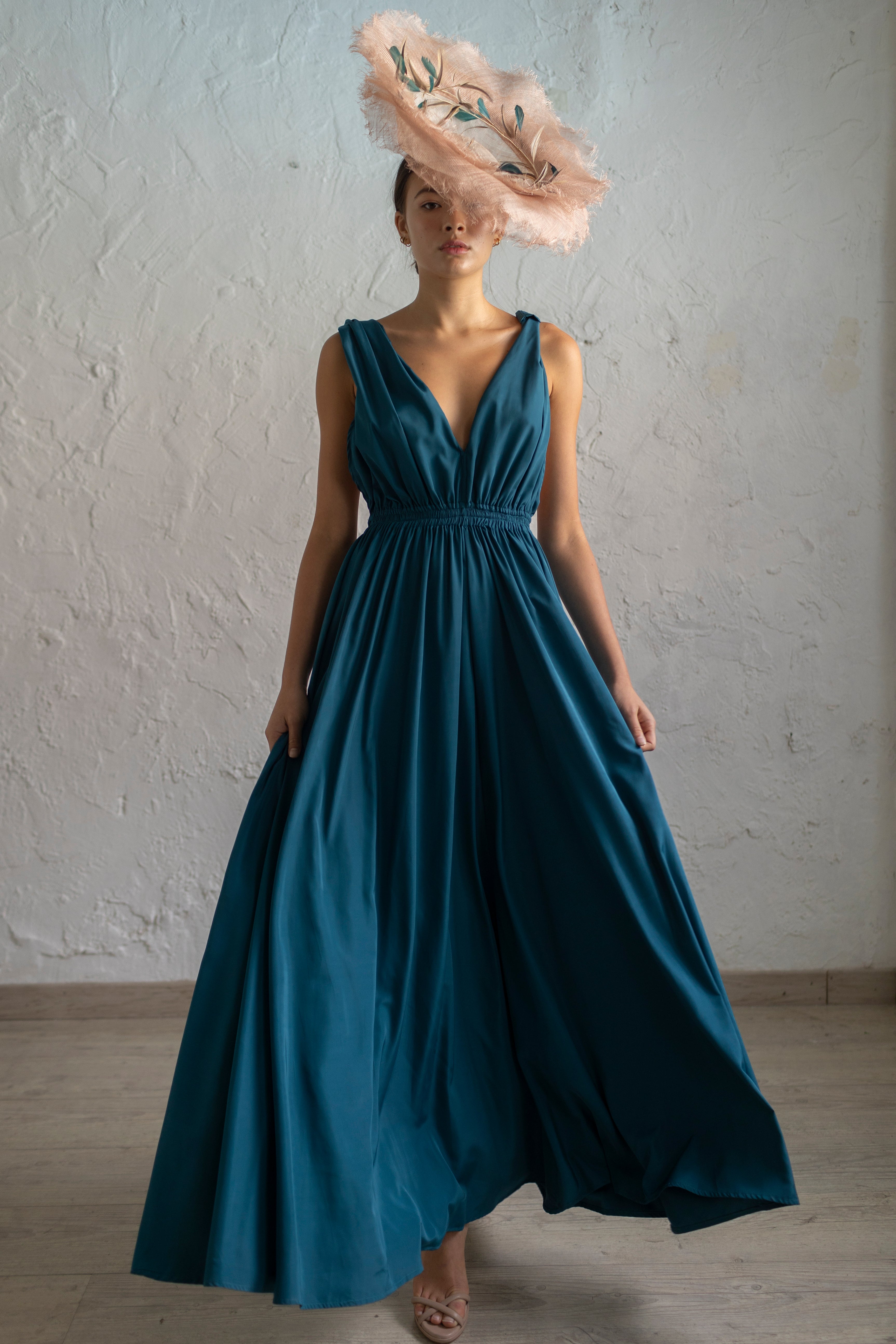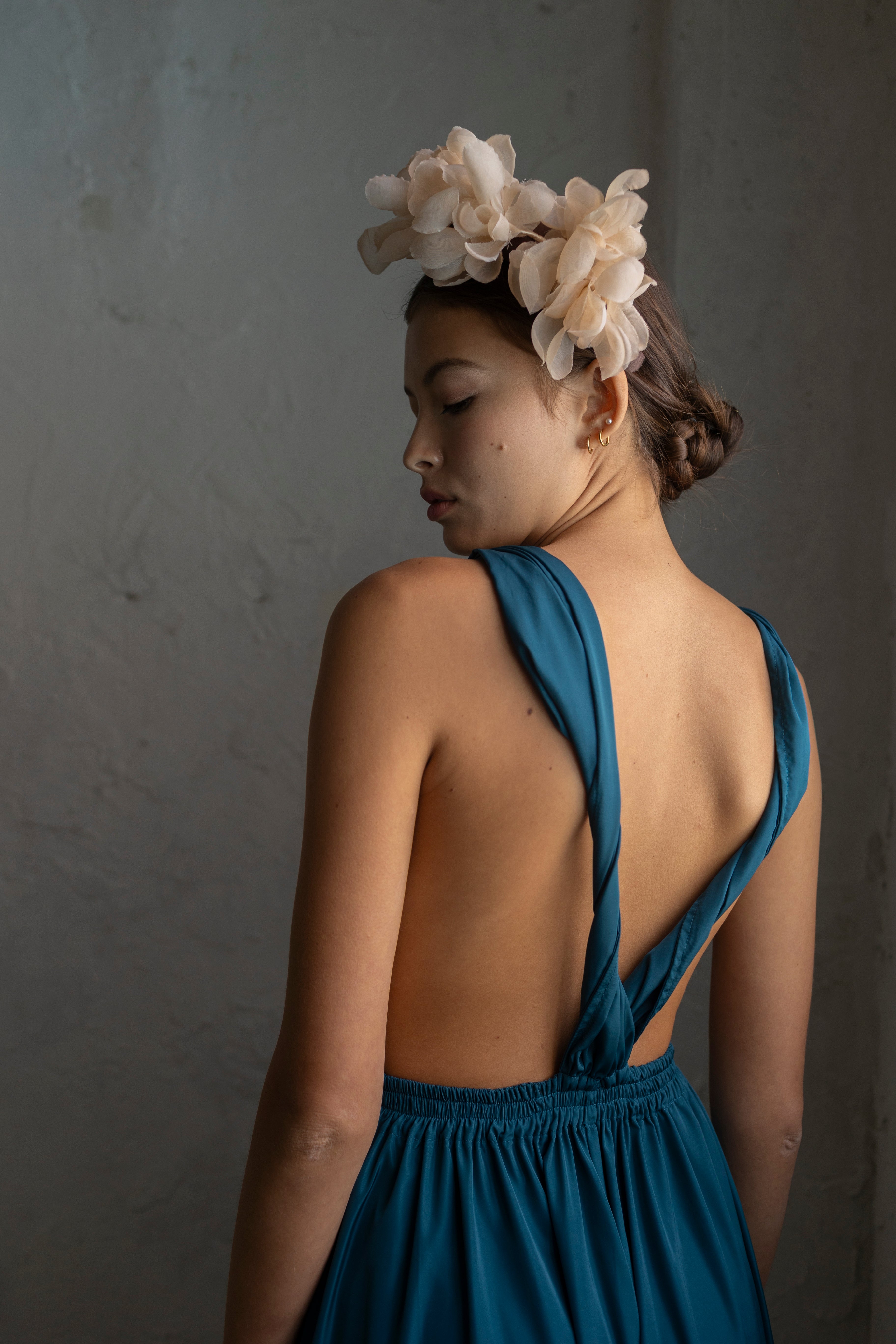 Long dress with rolled straps, V-neckline and open back.