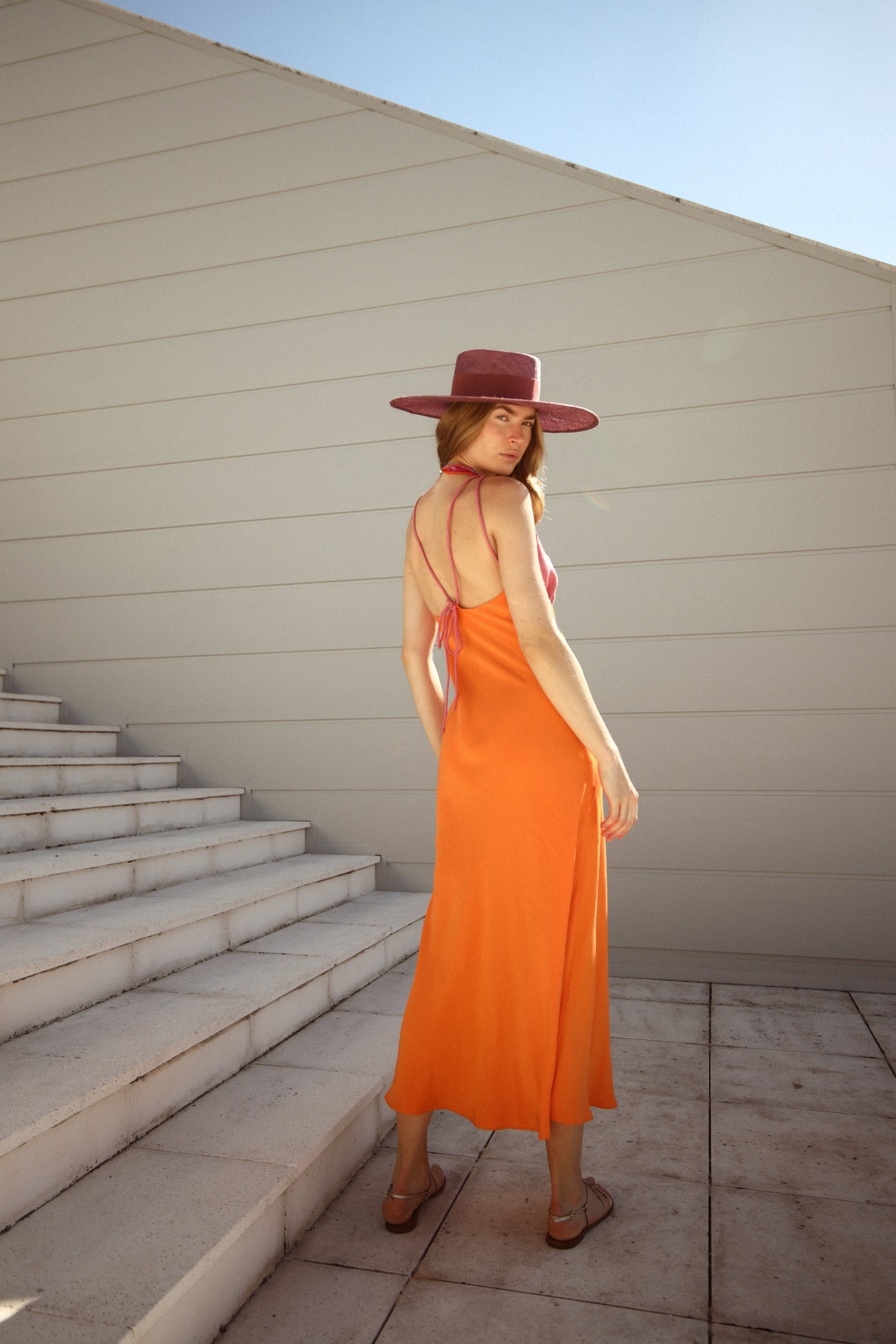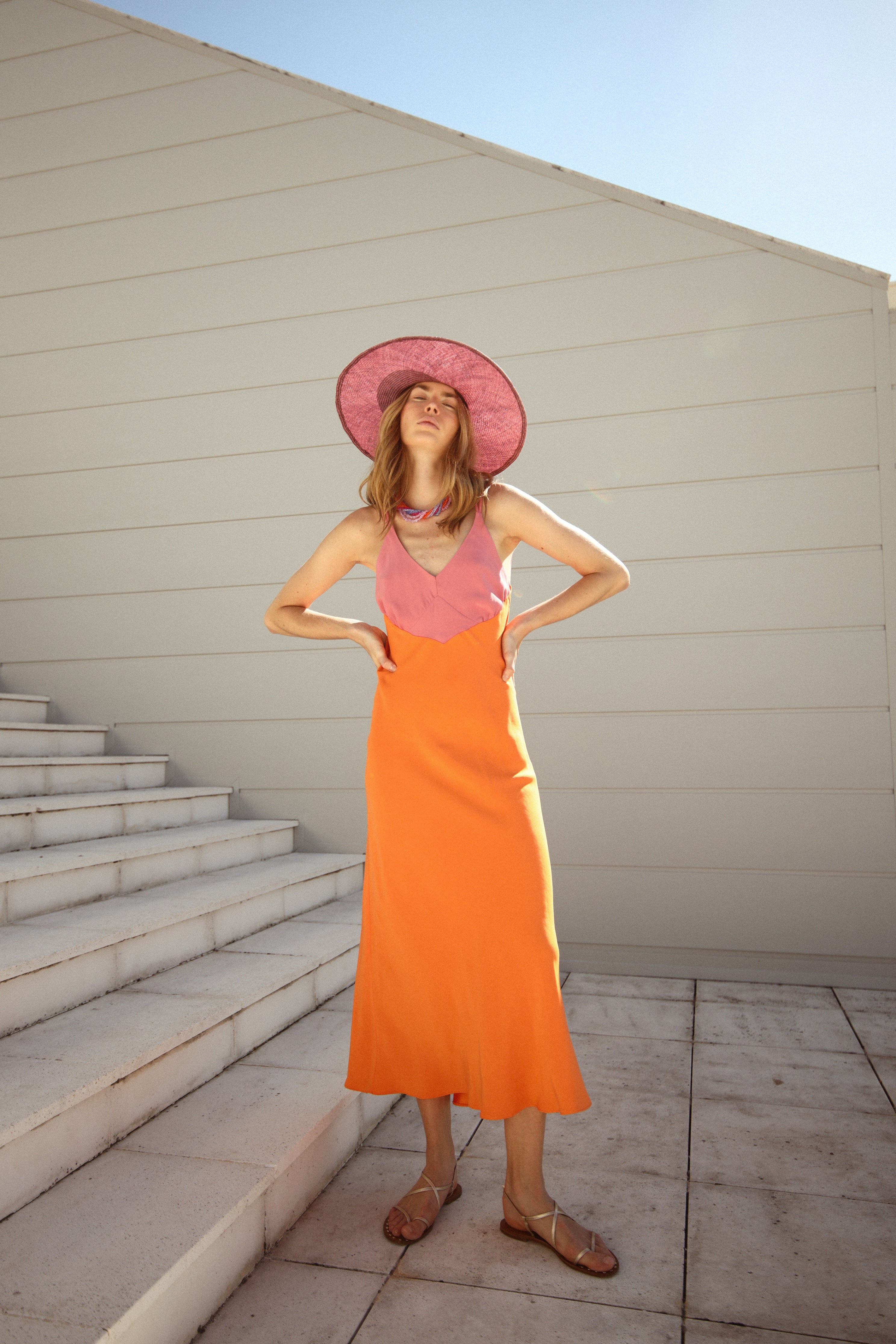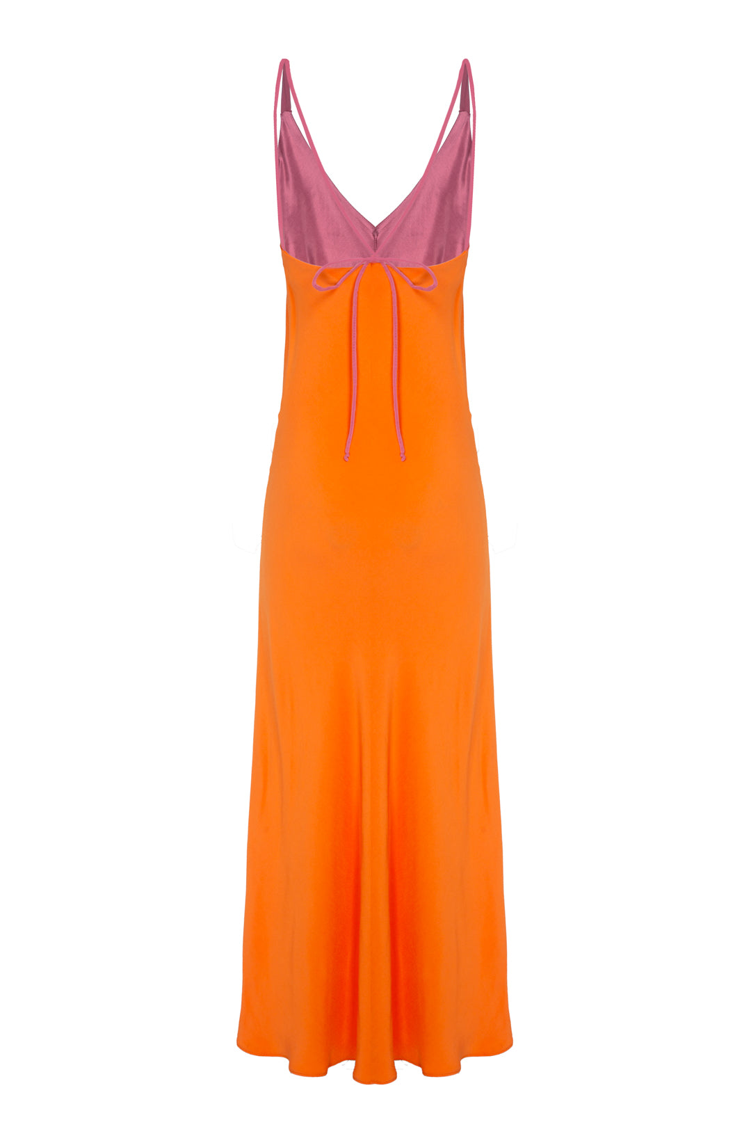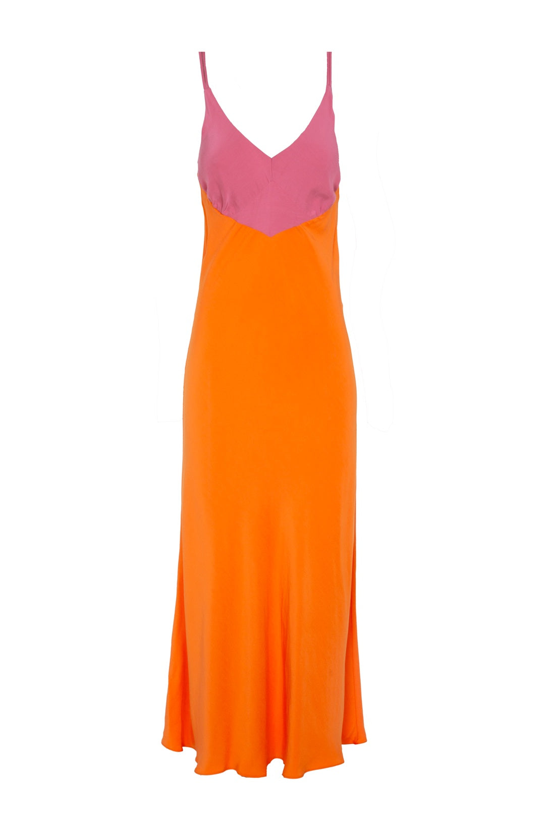 Dress with straps and a V-neckline, ankle length.