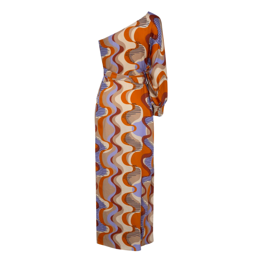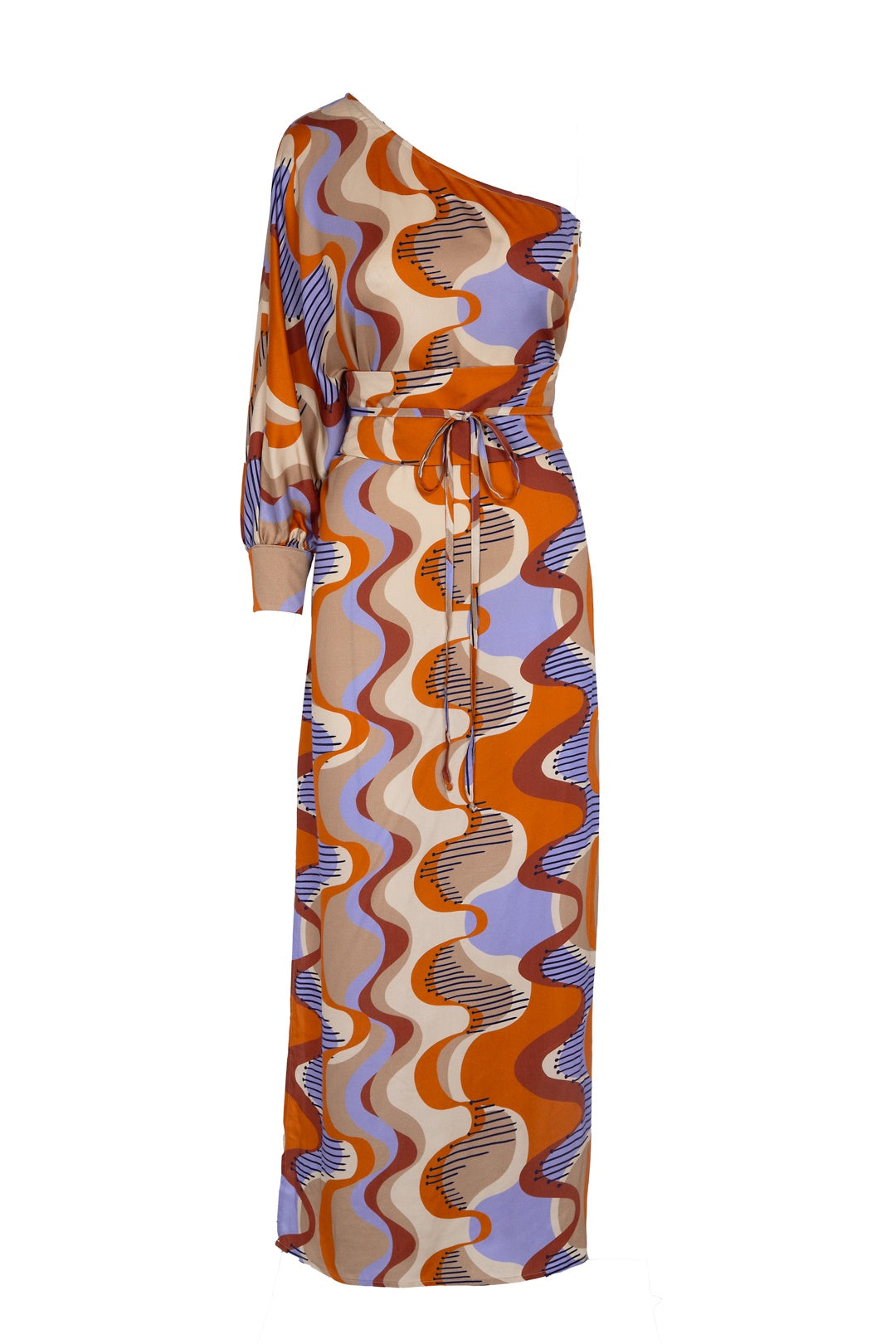 Asymmetrical one-shoulder white gingham dress with Japanese sash.