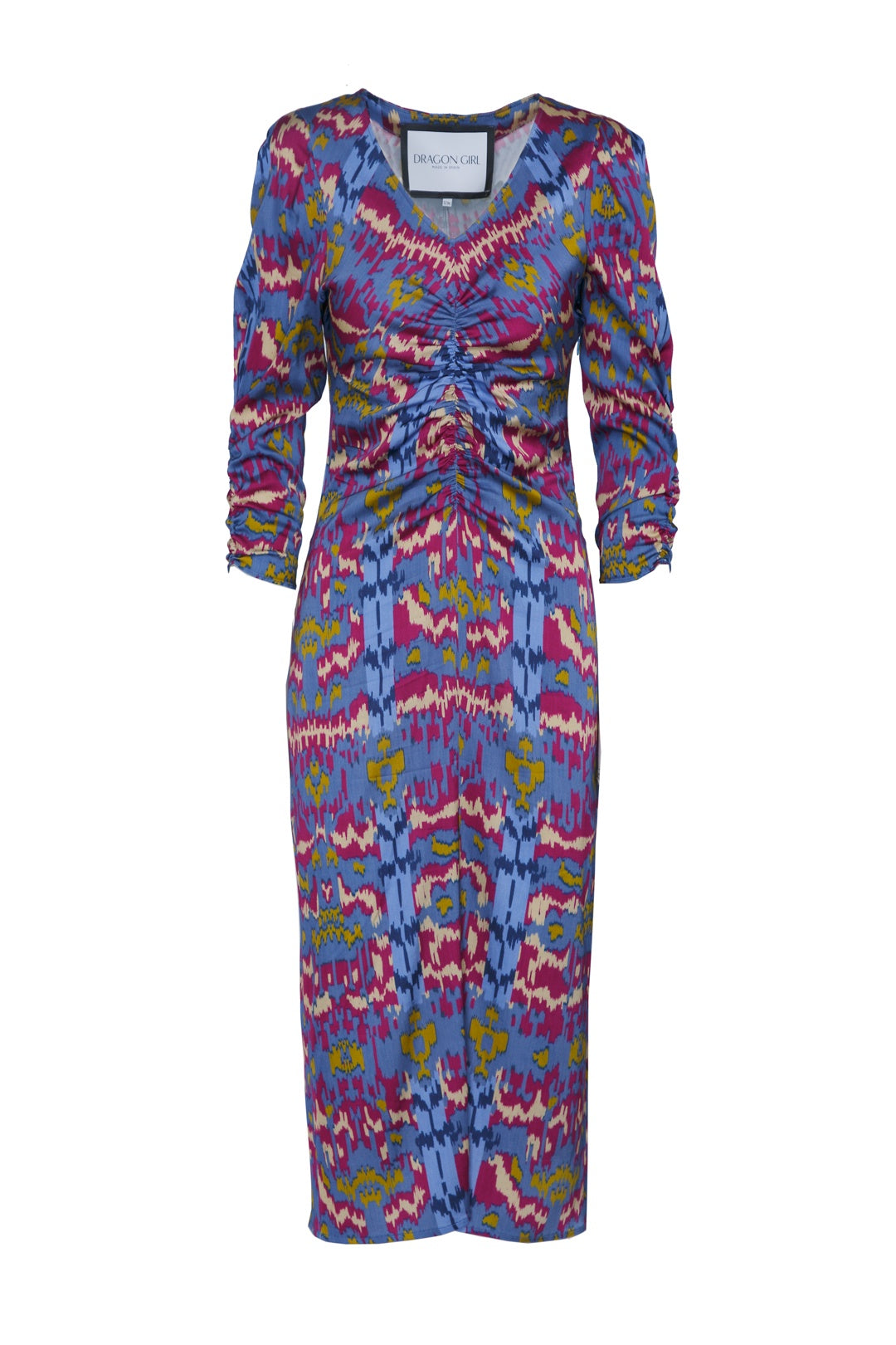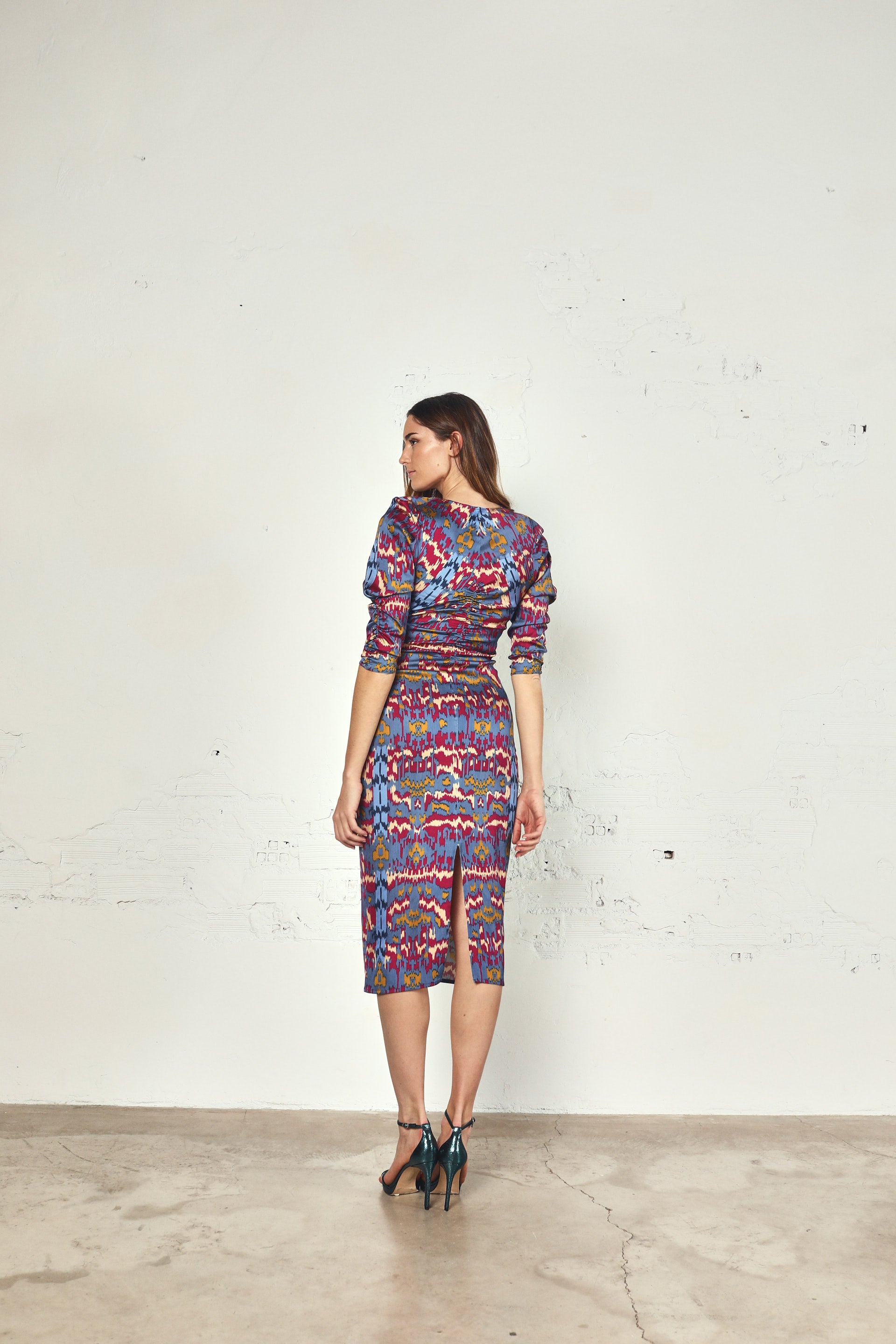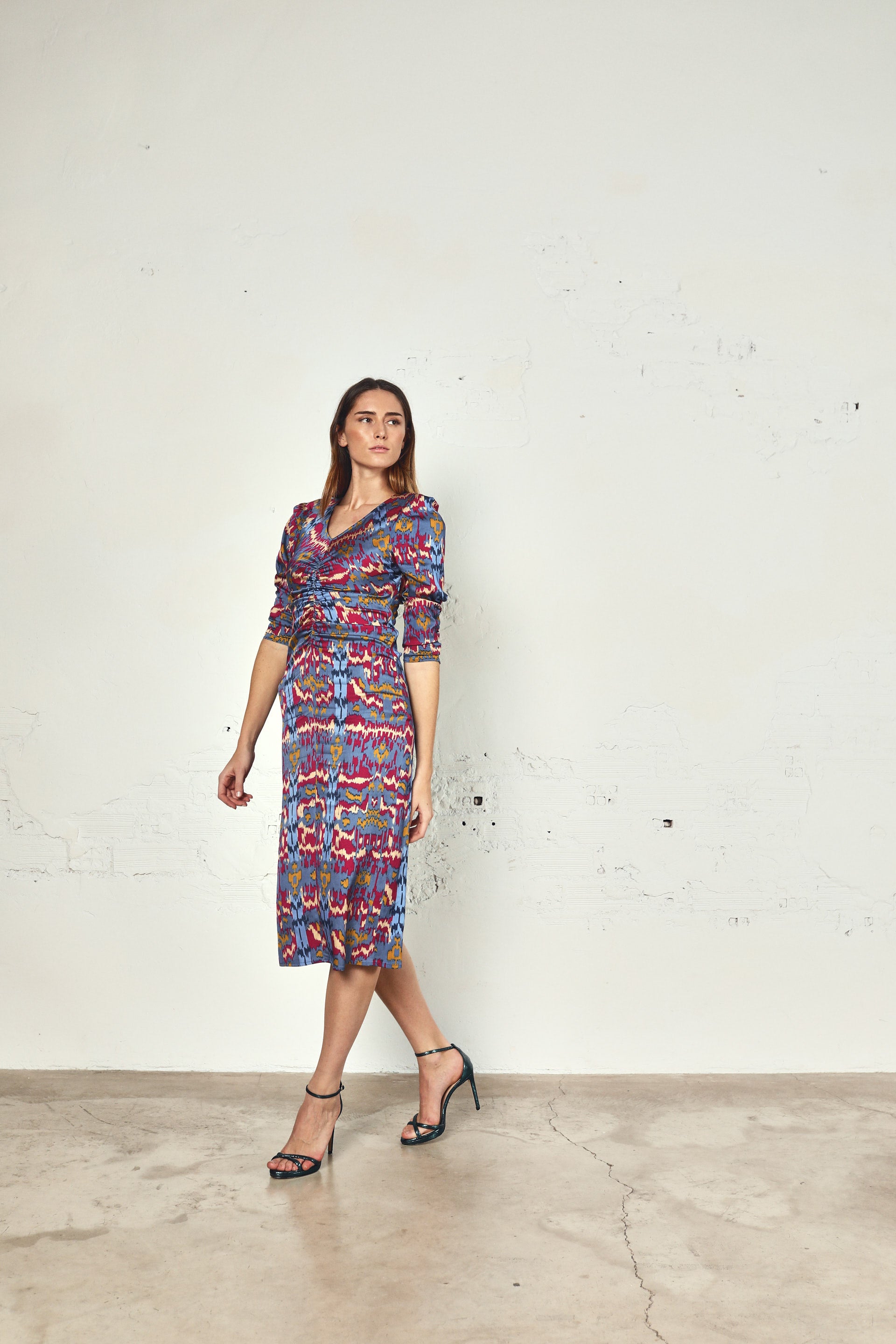 Midi dress, V-neckline, with French sleeves and central gathering.