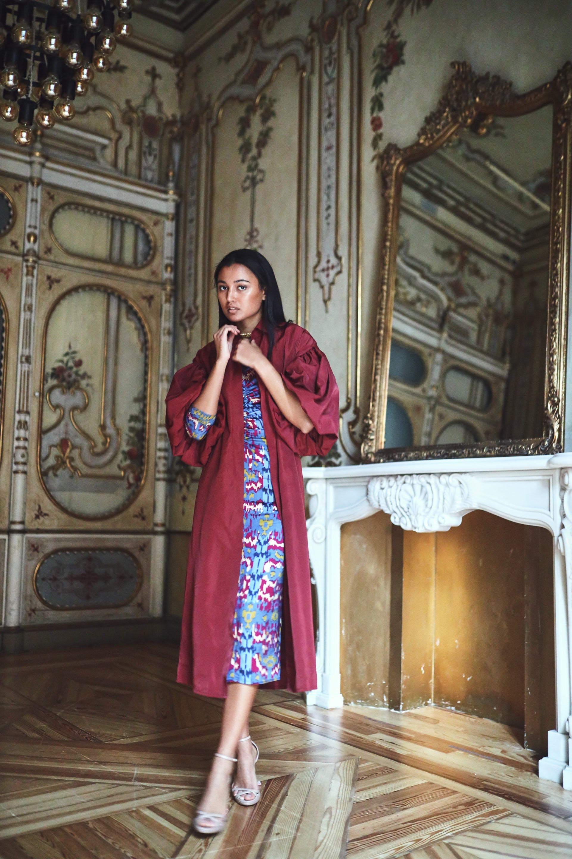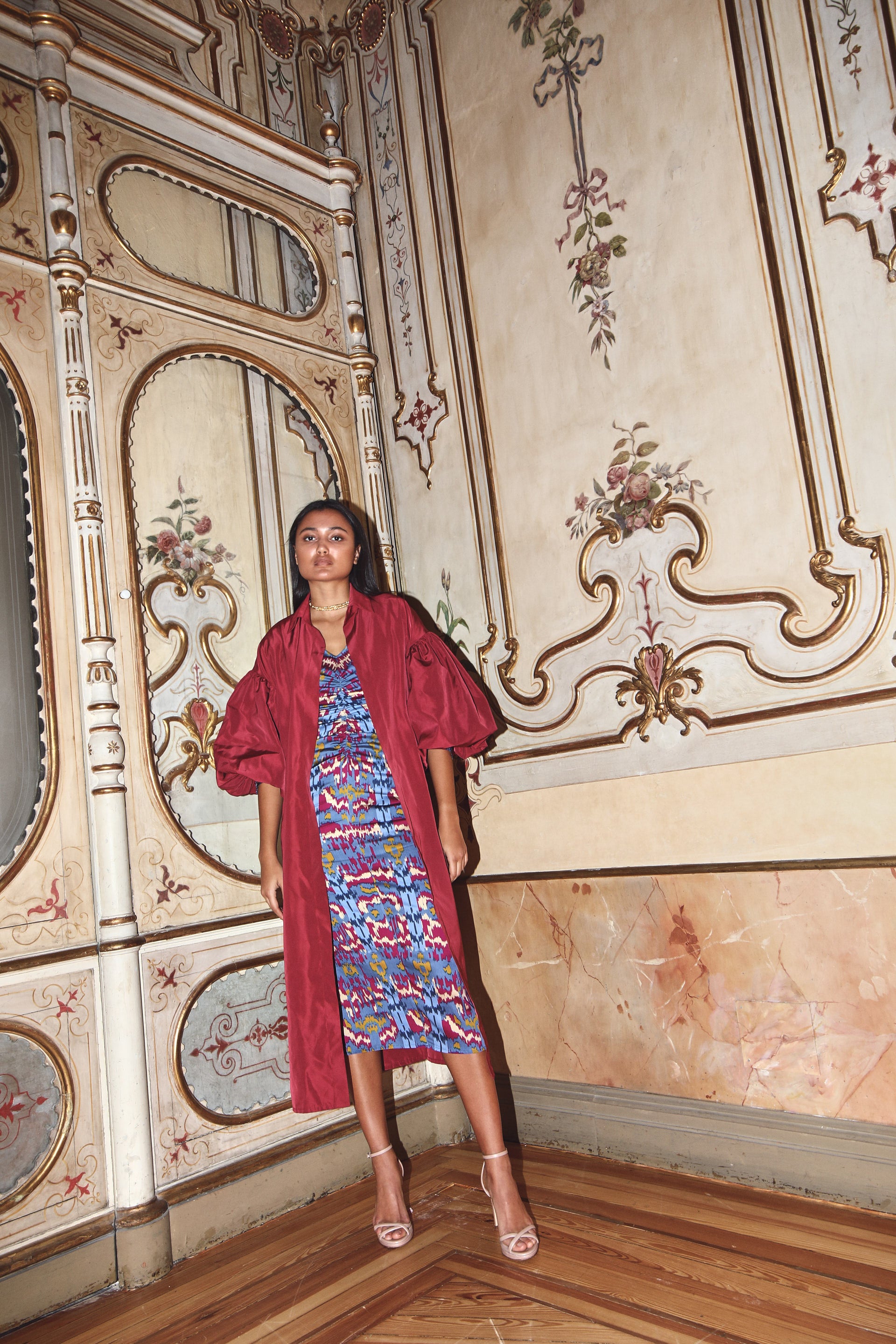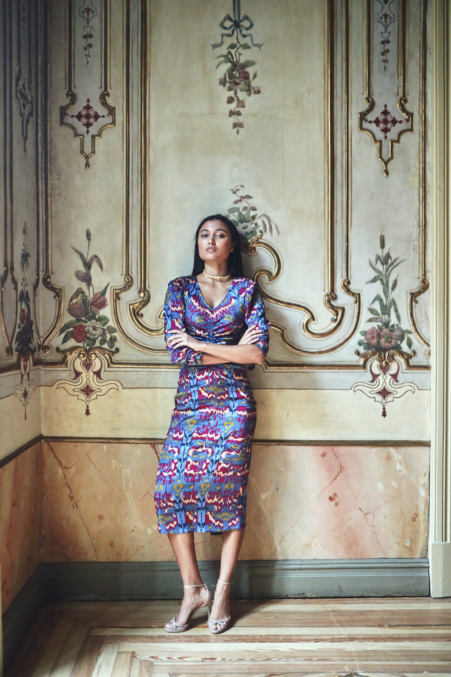 Midi dress, V-neckline, with French sleeves and central gathering.
