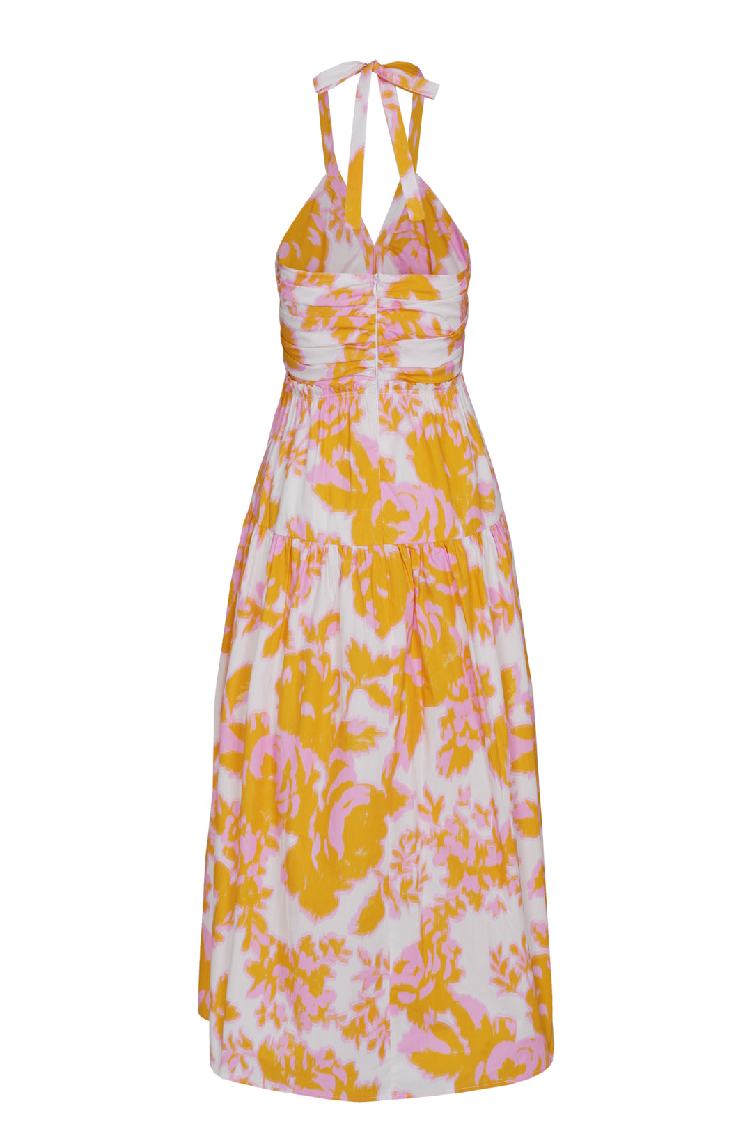 Vestido midi con frunce en el pecho con escote en V y lazada en el cuello.