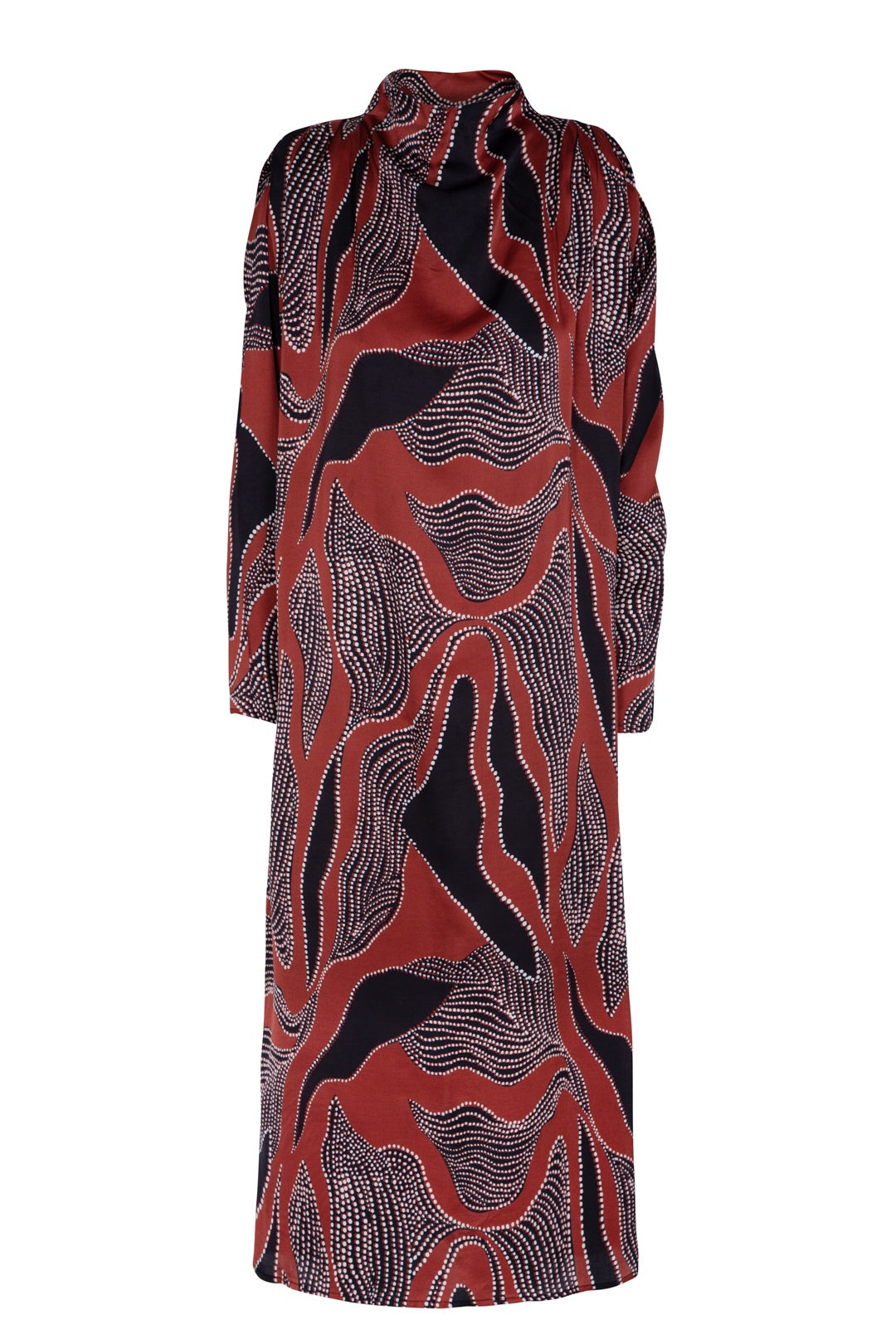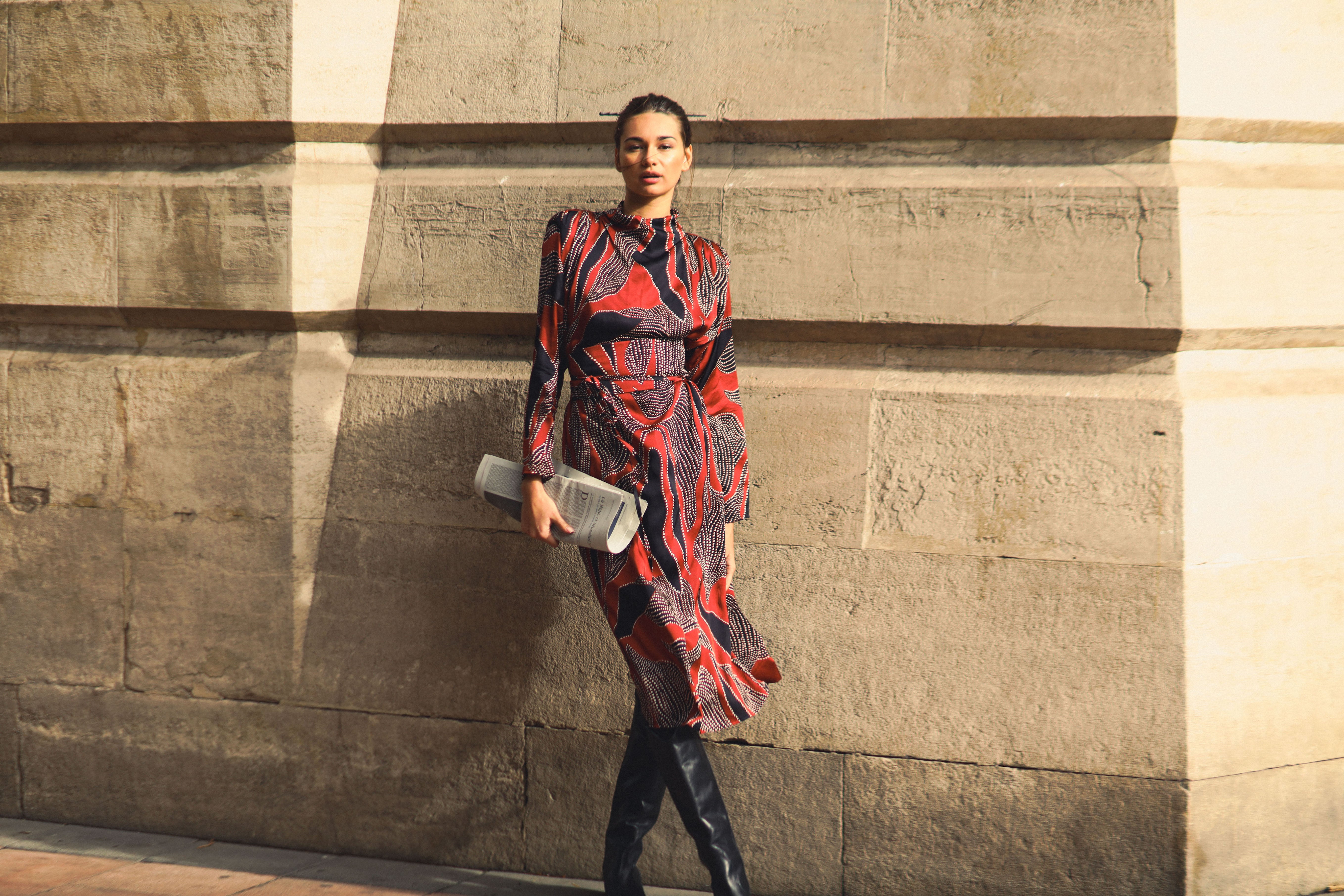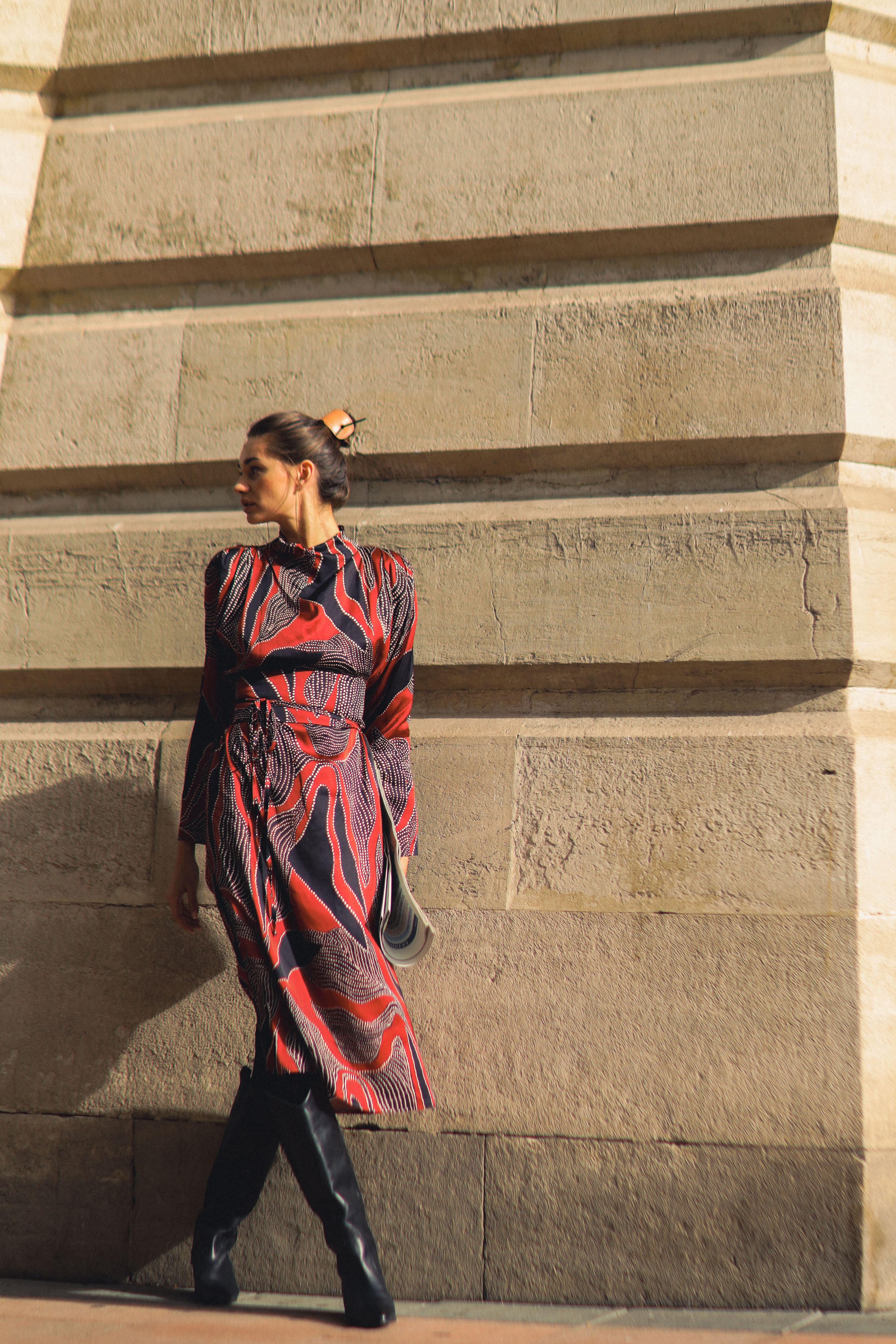 Dress with shoulder pads in printed fabric and Perkins collar.