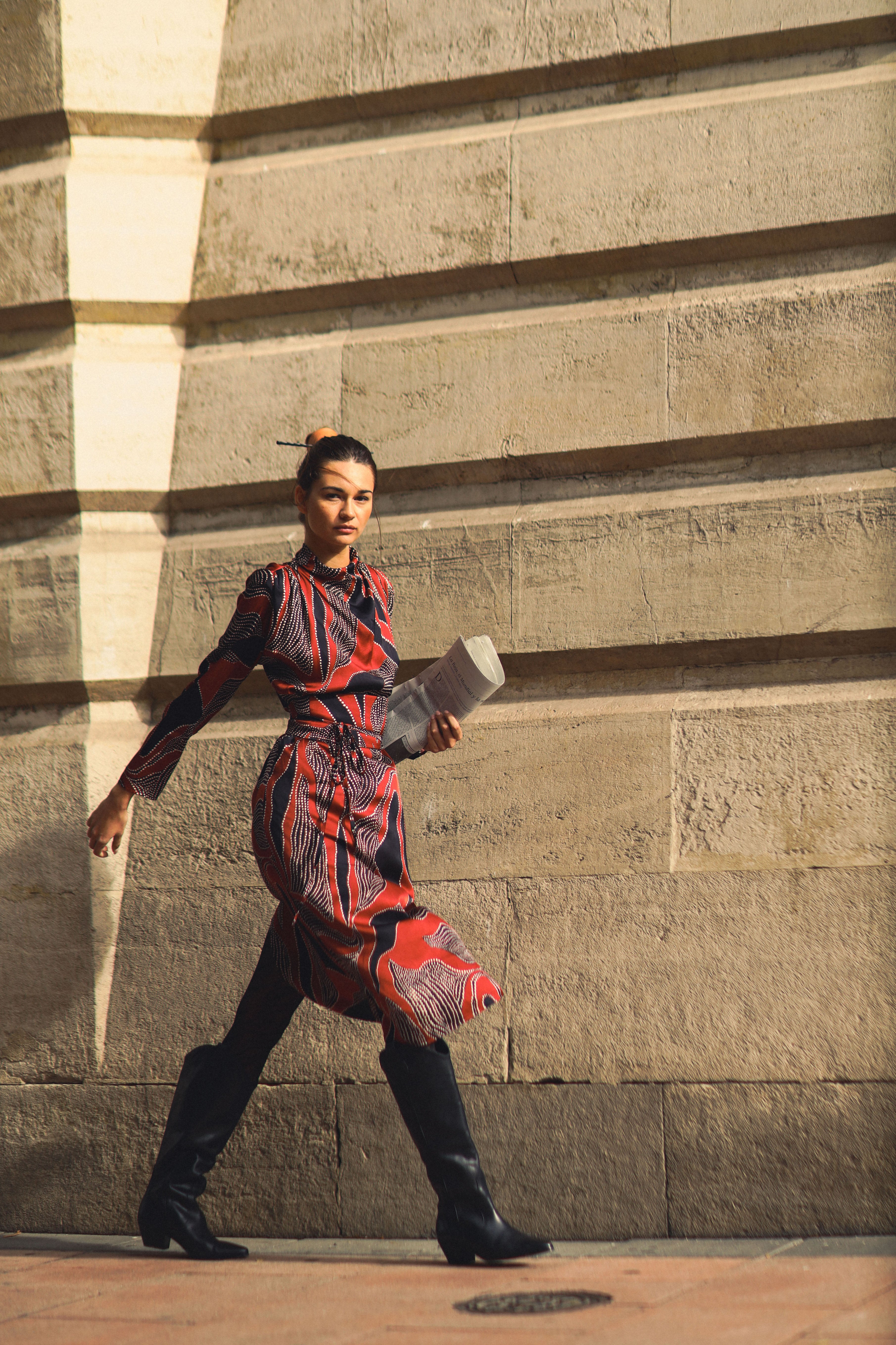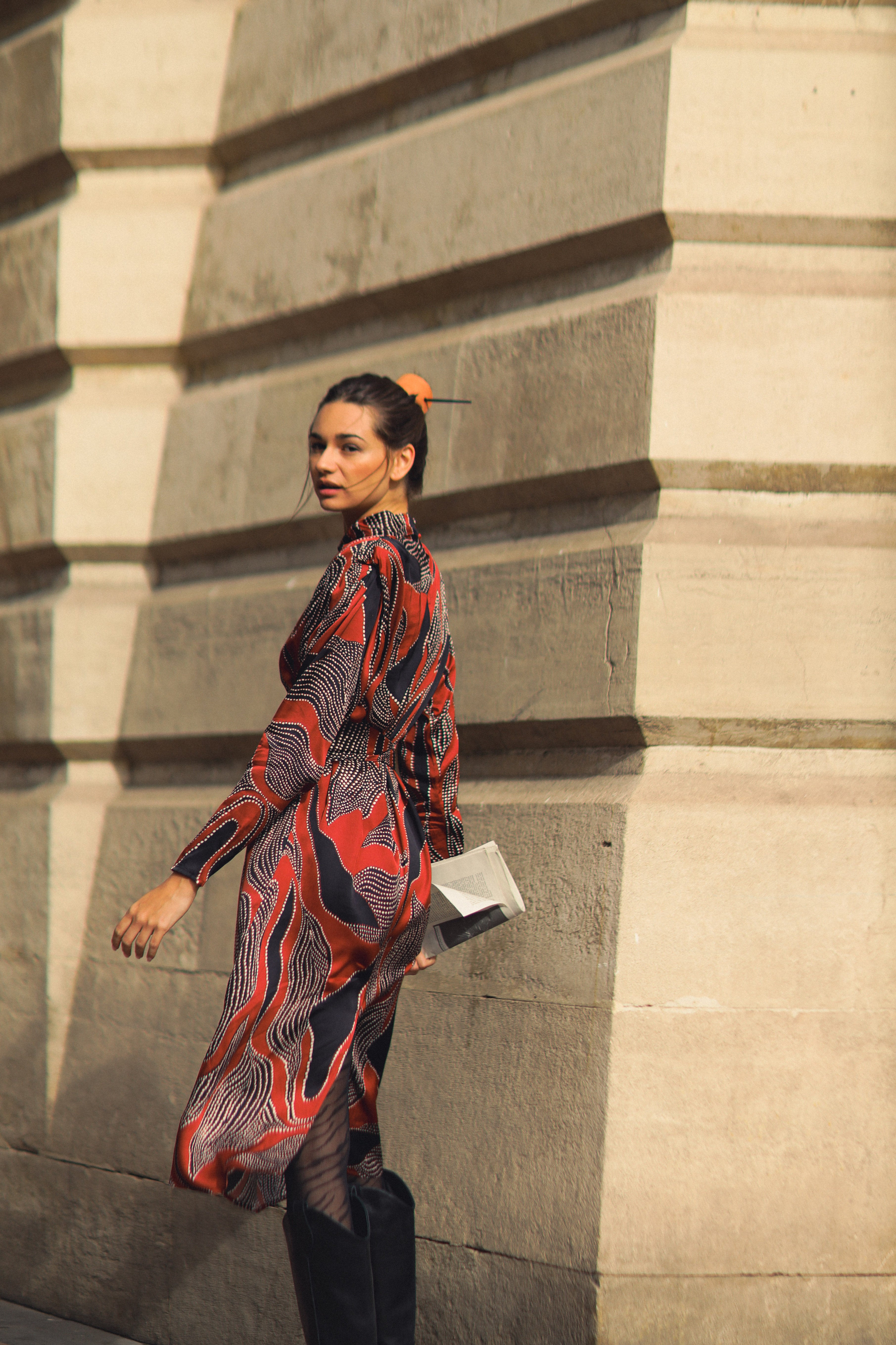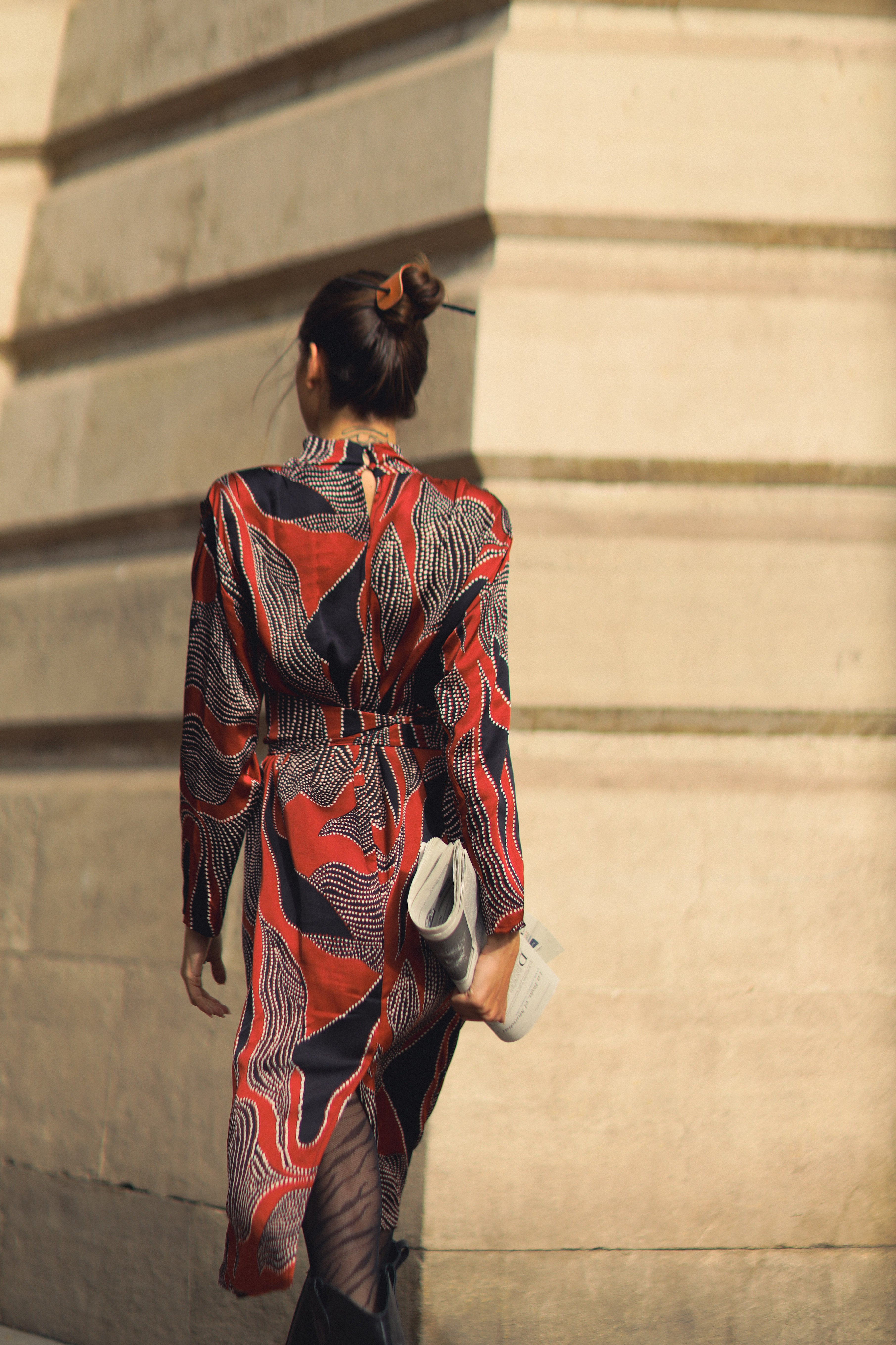 Dress with shoulder pads in printed fabric and Perkins collar.