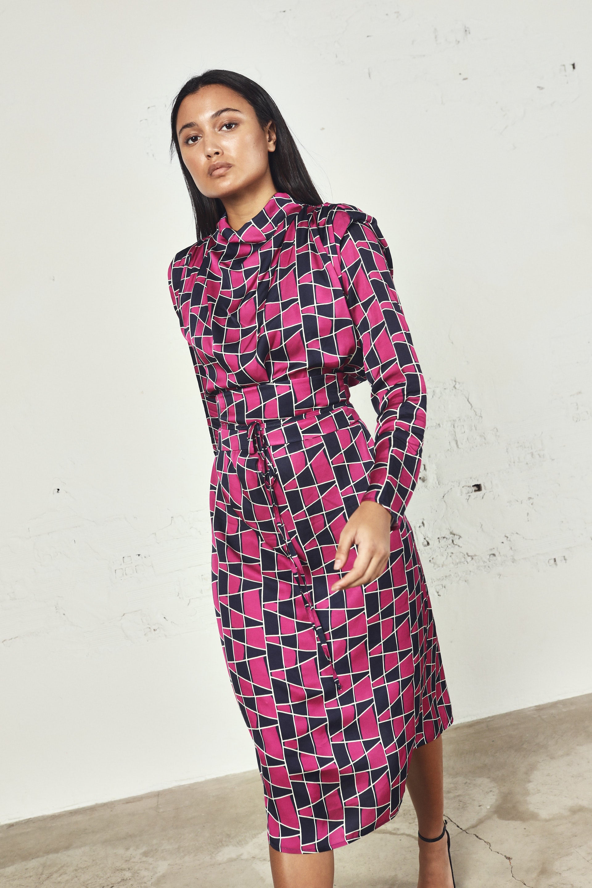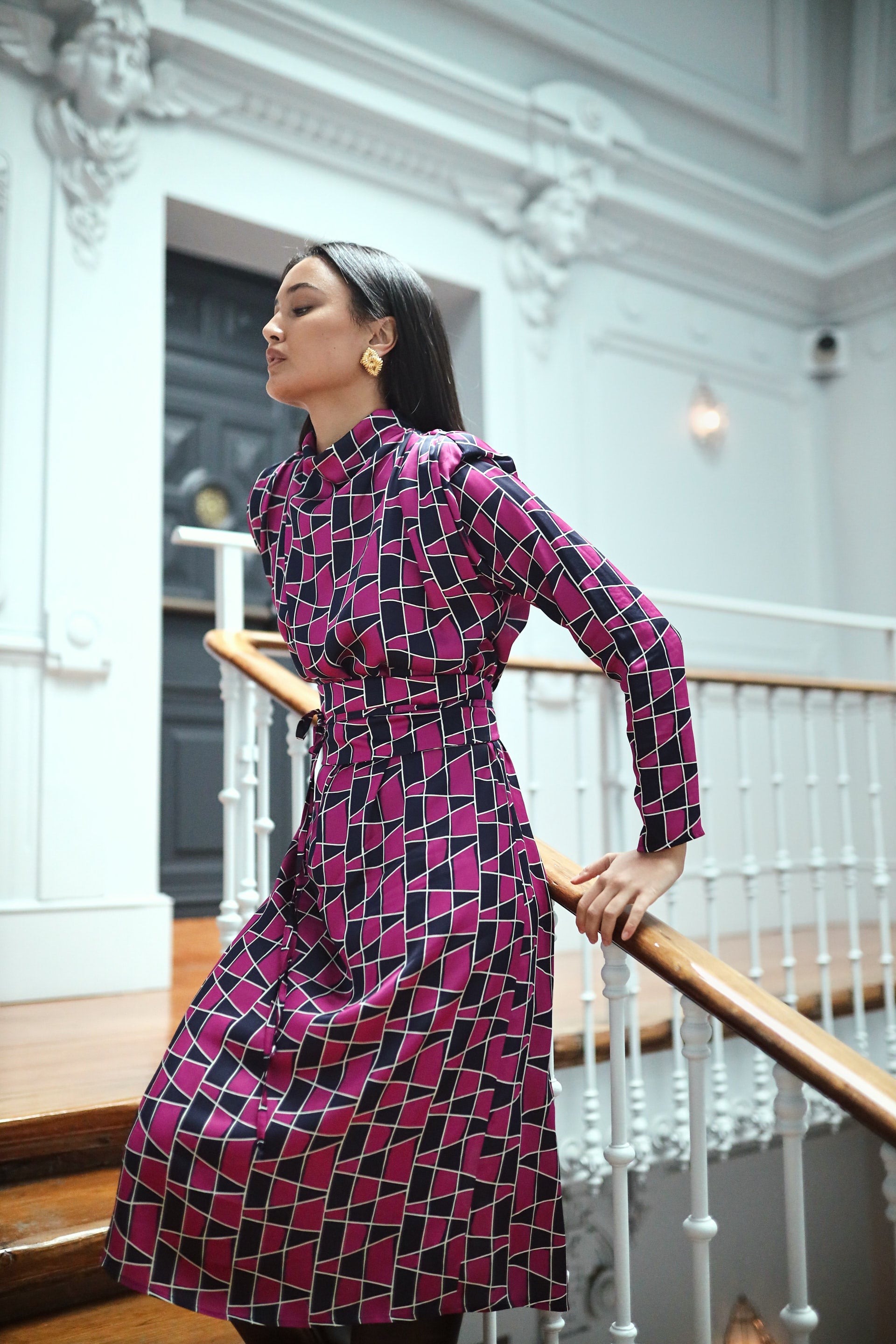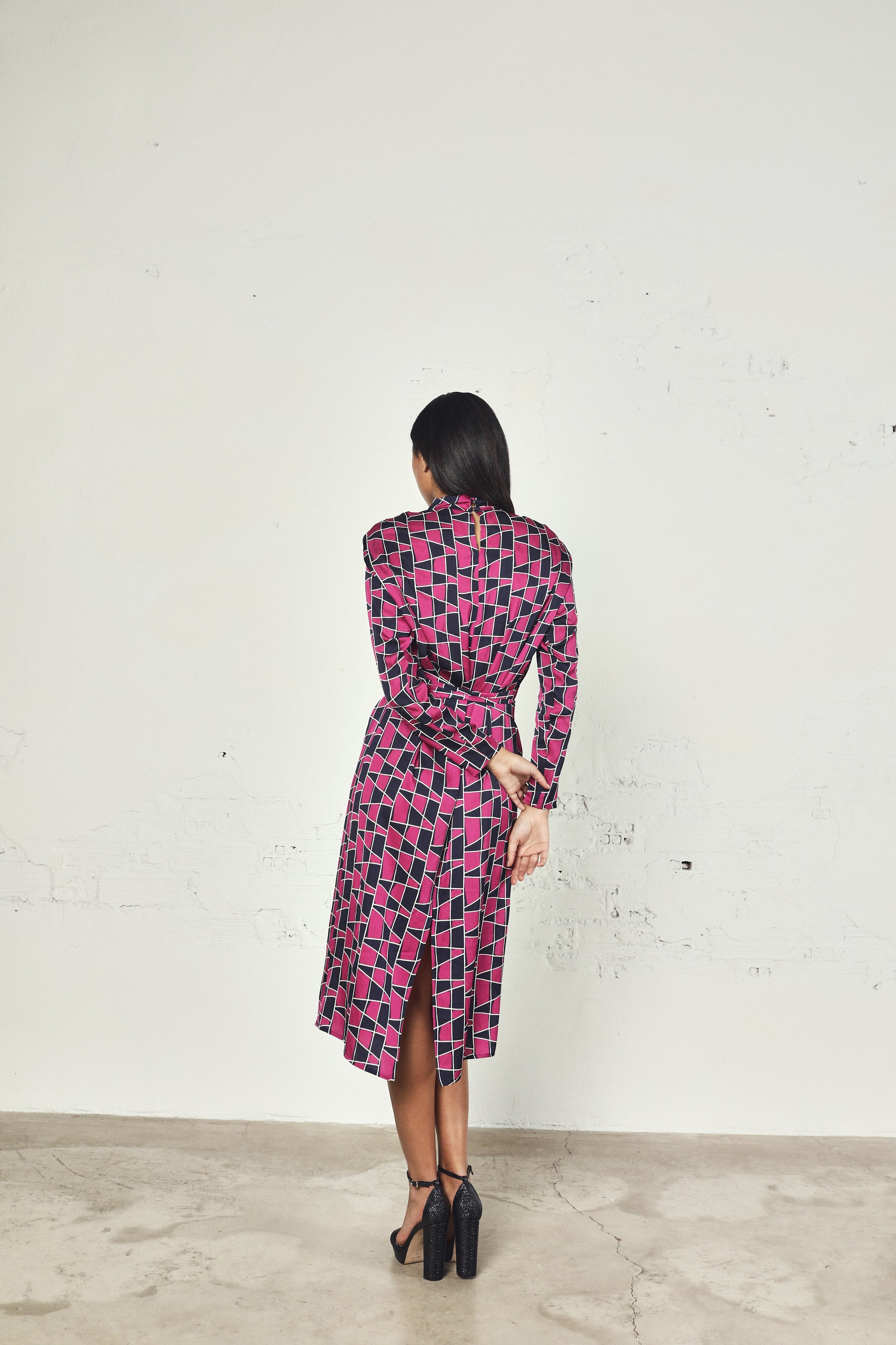 Dress with shoulder pads in printed fabric and Perkins collar.
