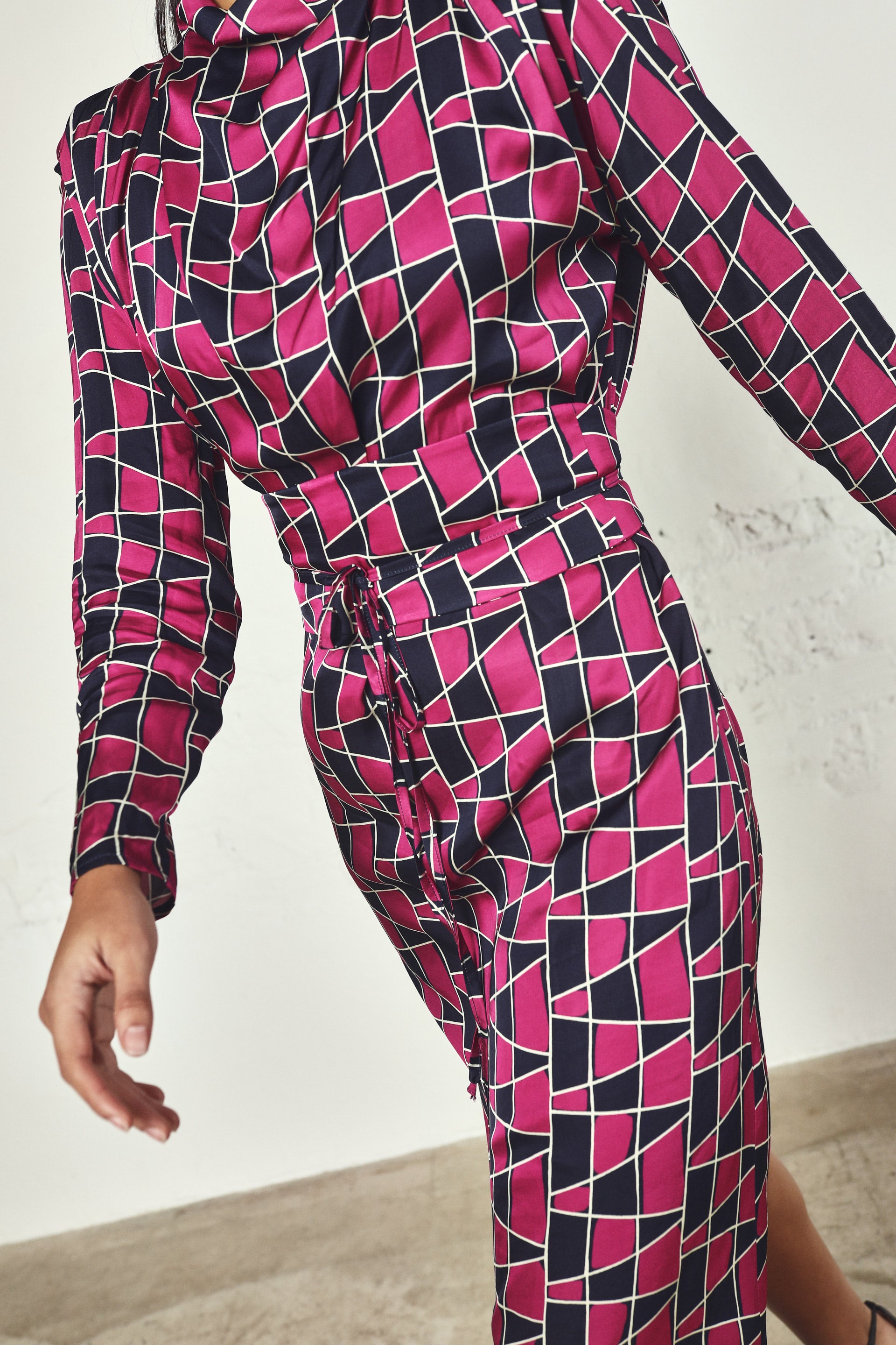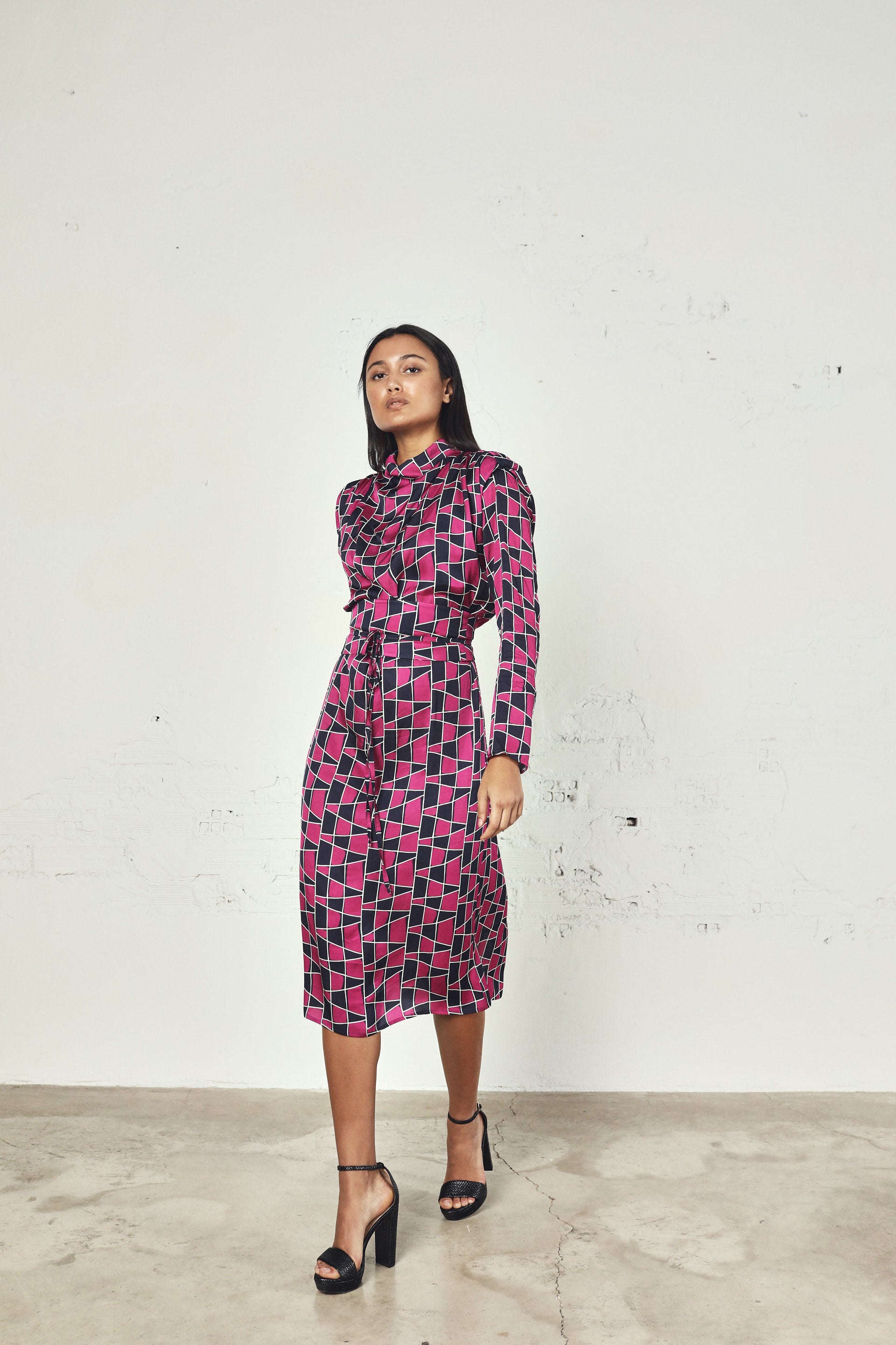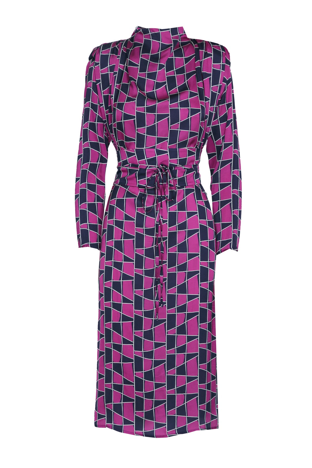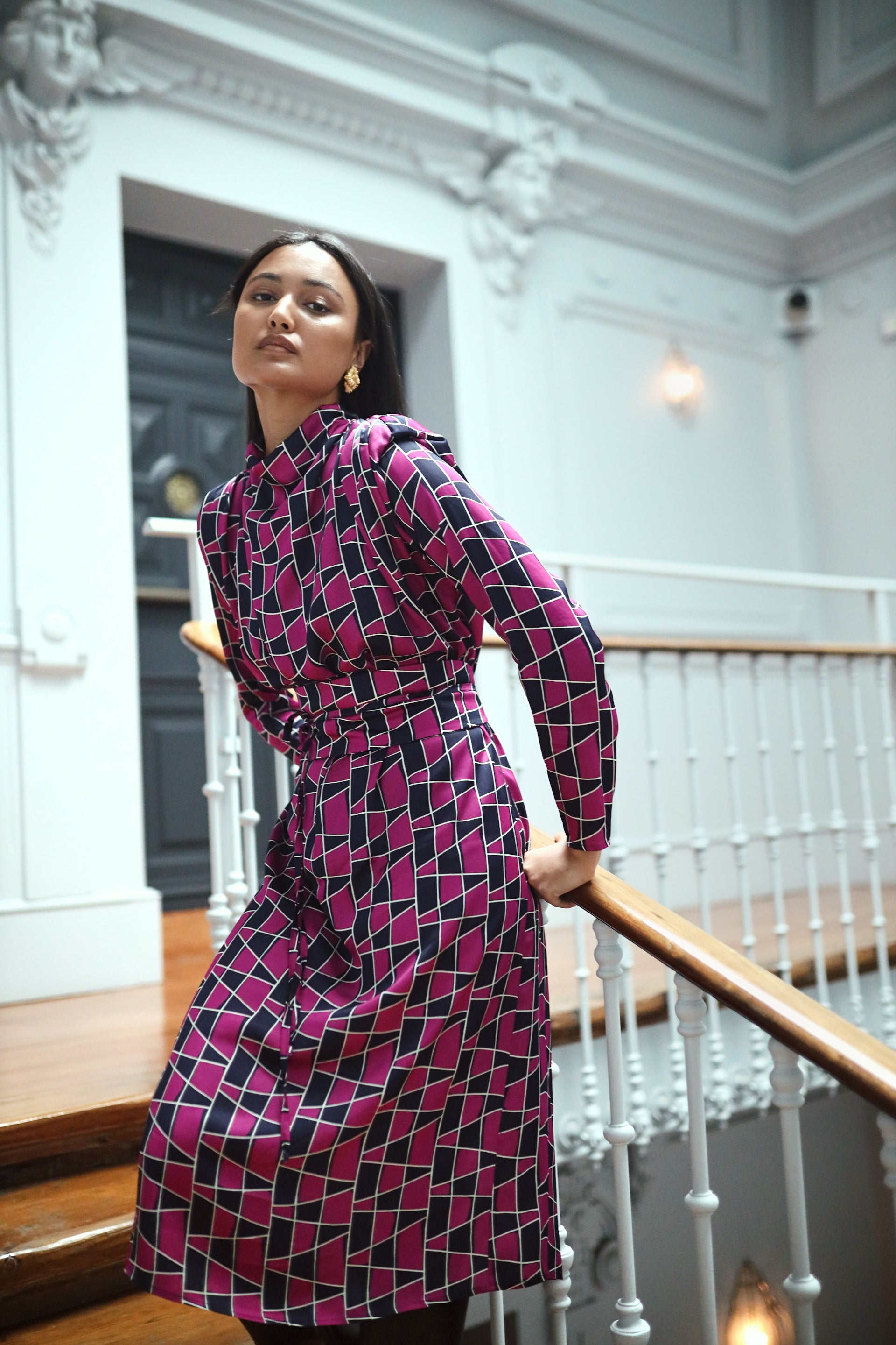 Dress with shoulder pads in printed fabric and Perkins collar.