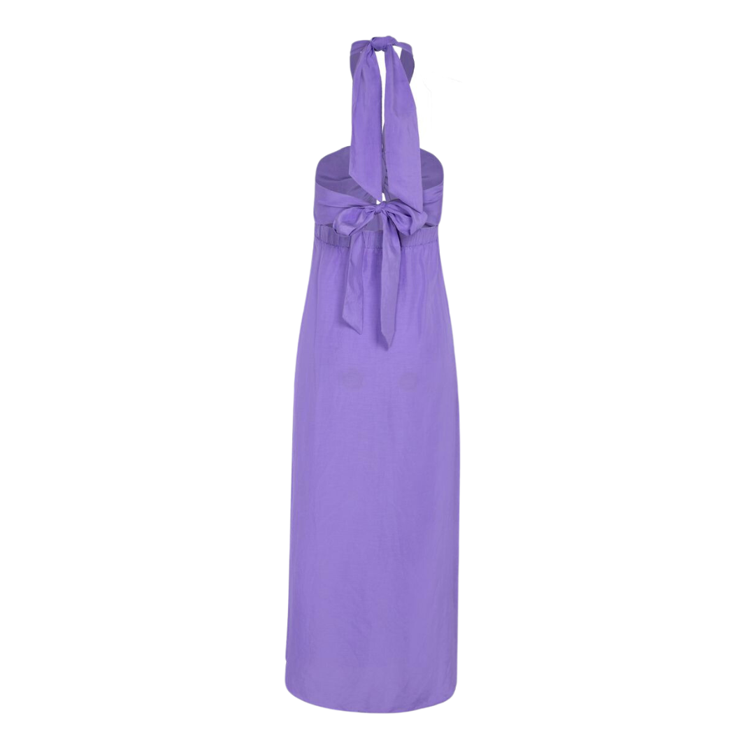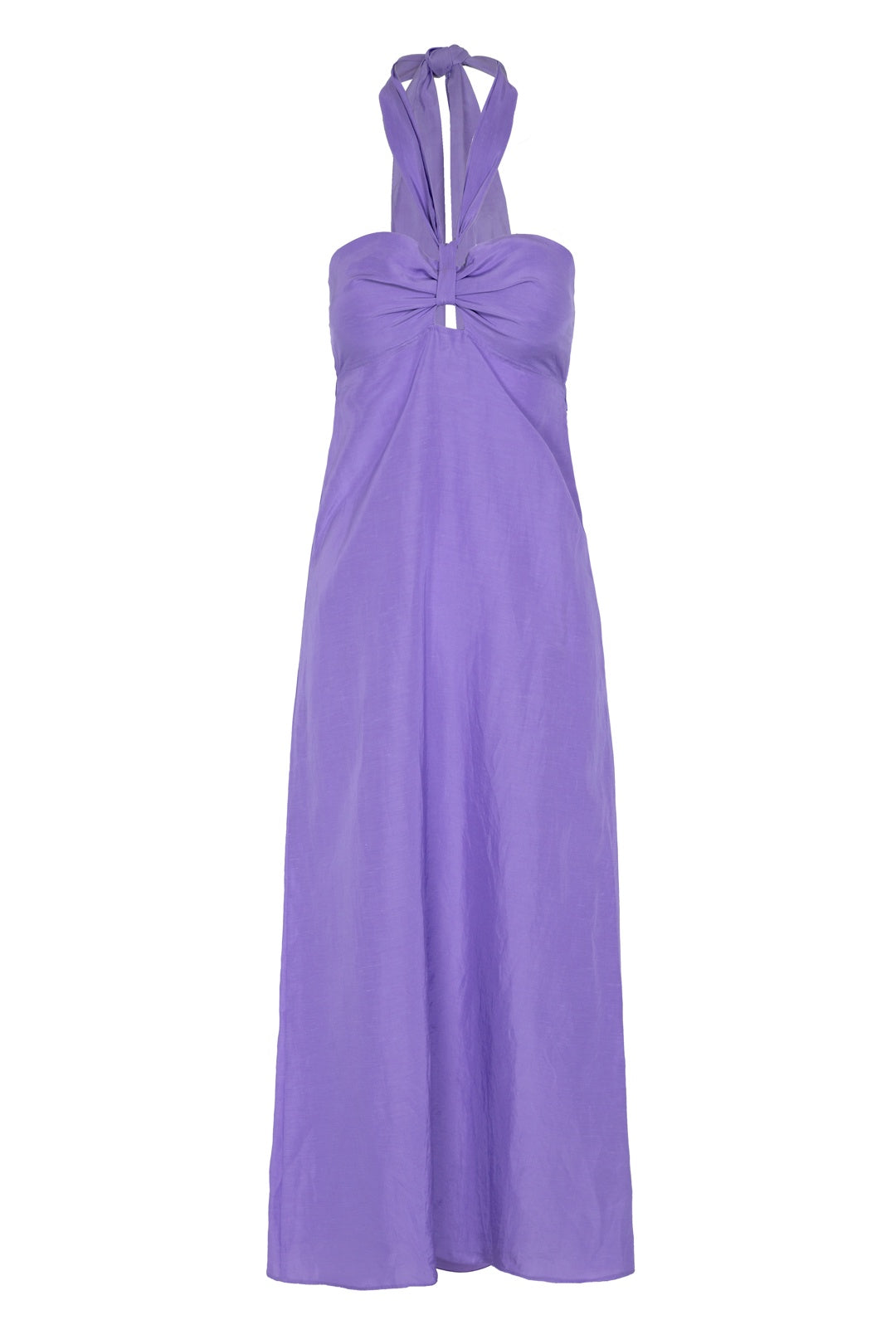 Dress with a sweetheart neckline, with a bow at the neck, ankle length.