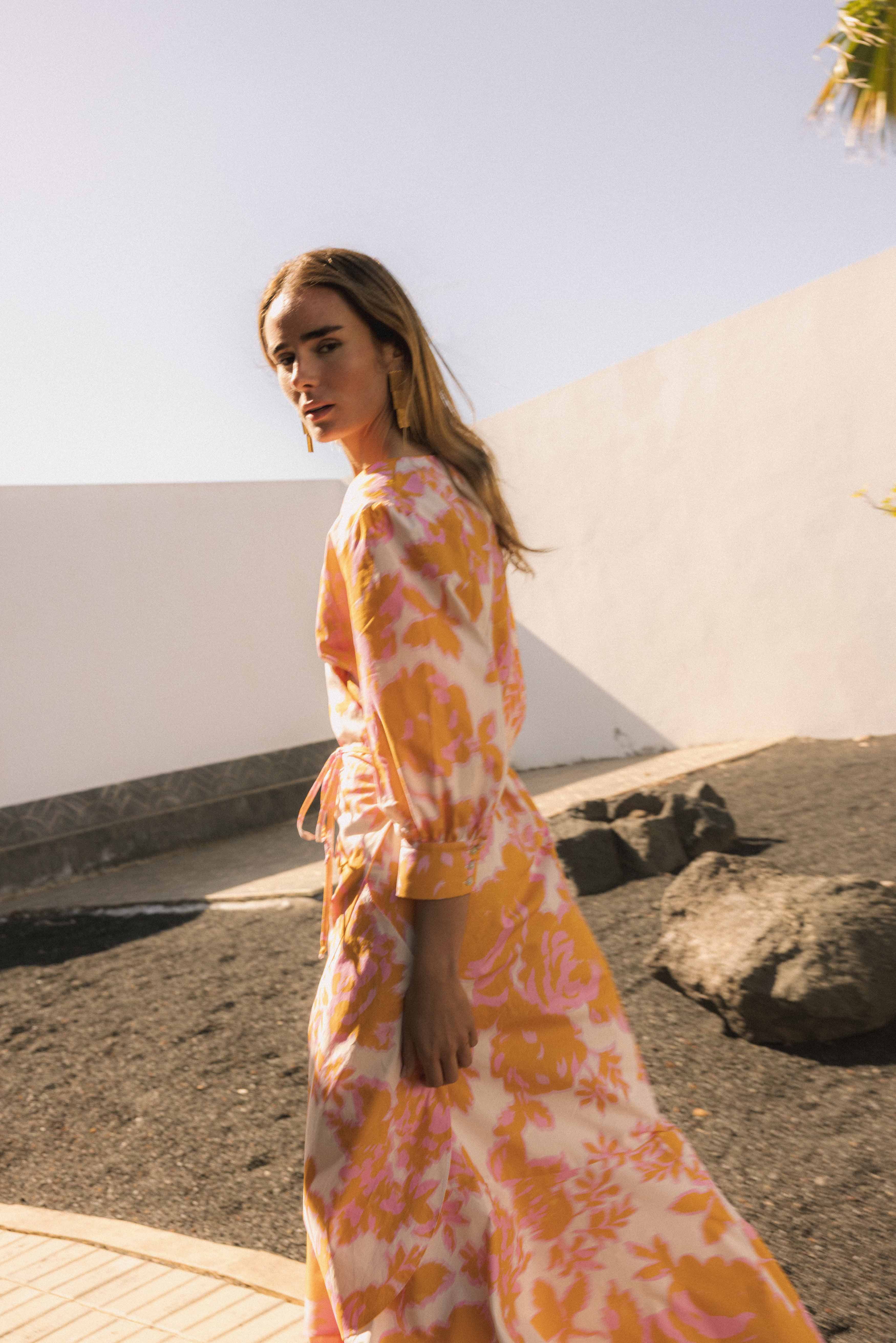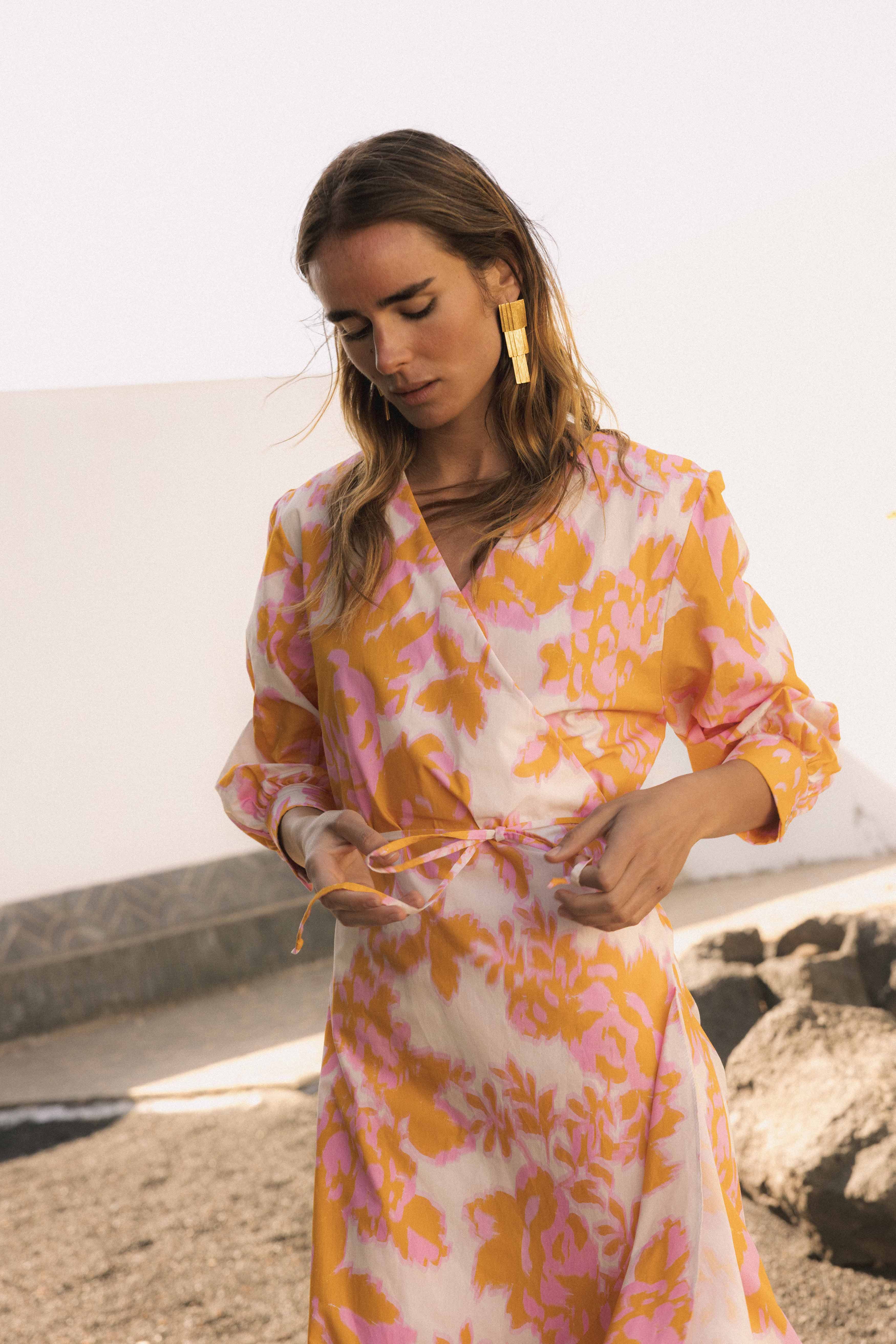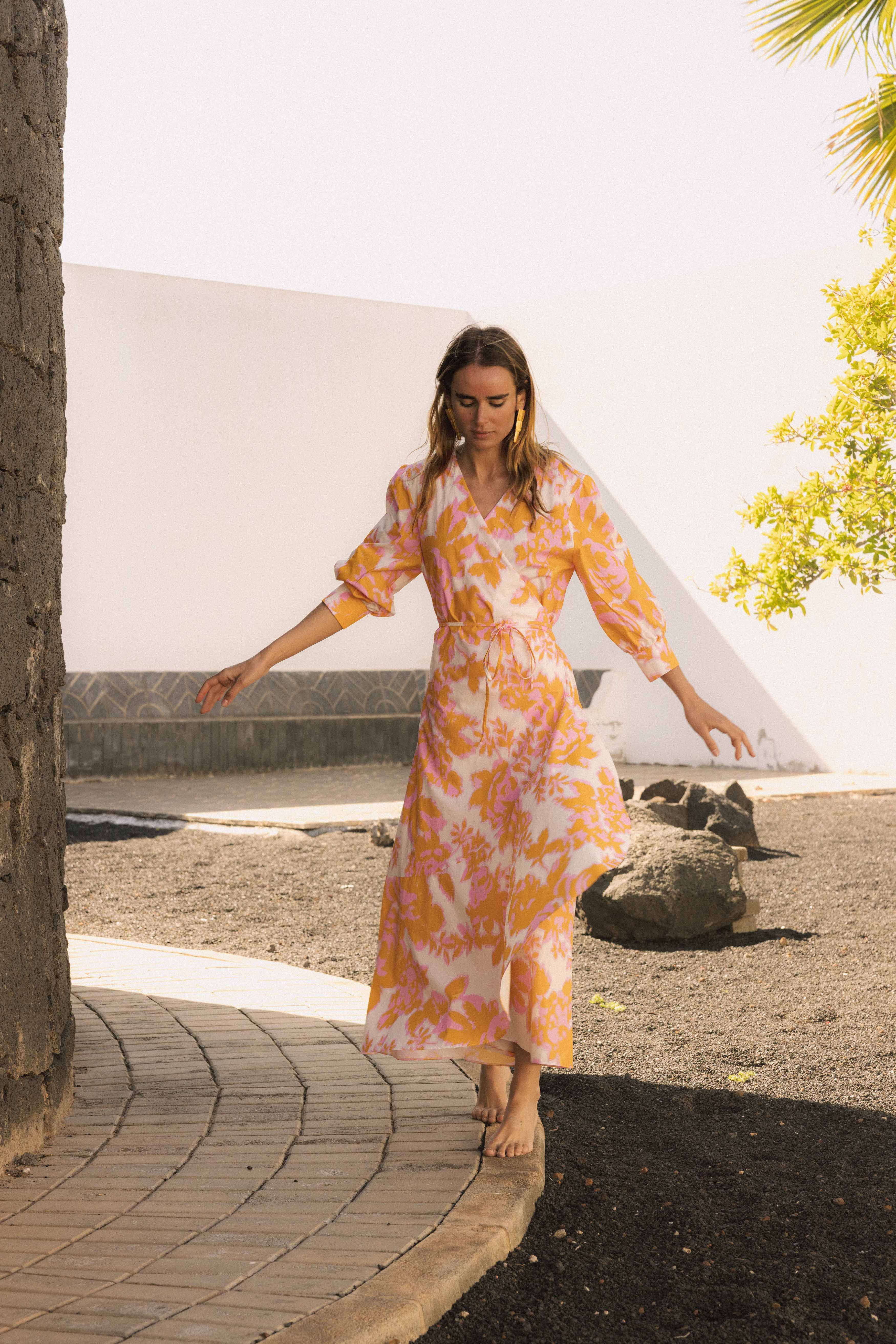 Vestido largo cruzado con manga francesa, escote en V y lazada a cintura.