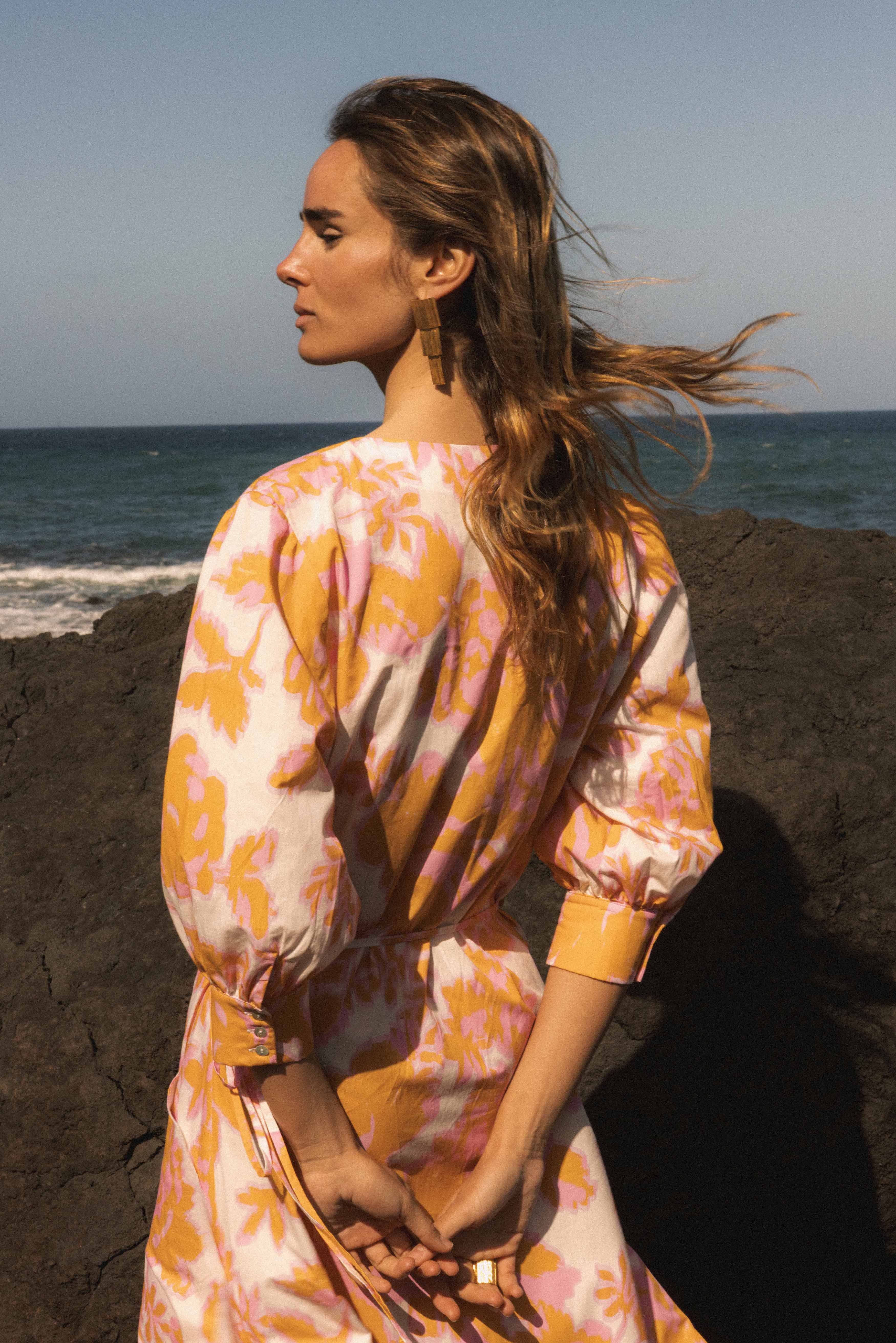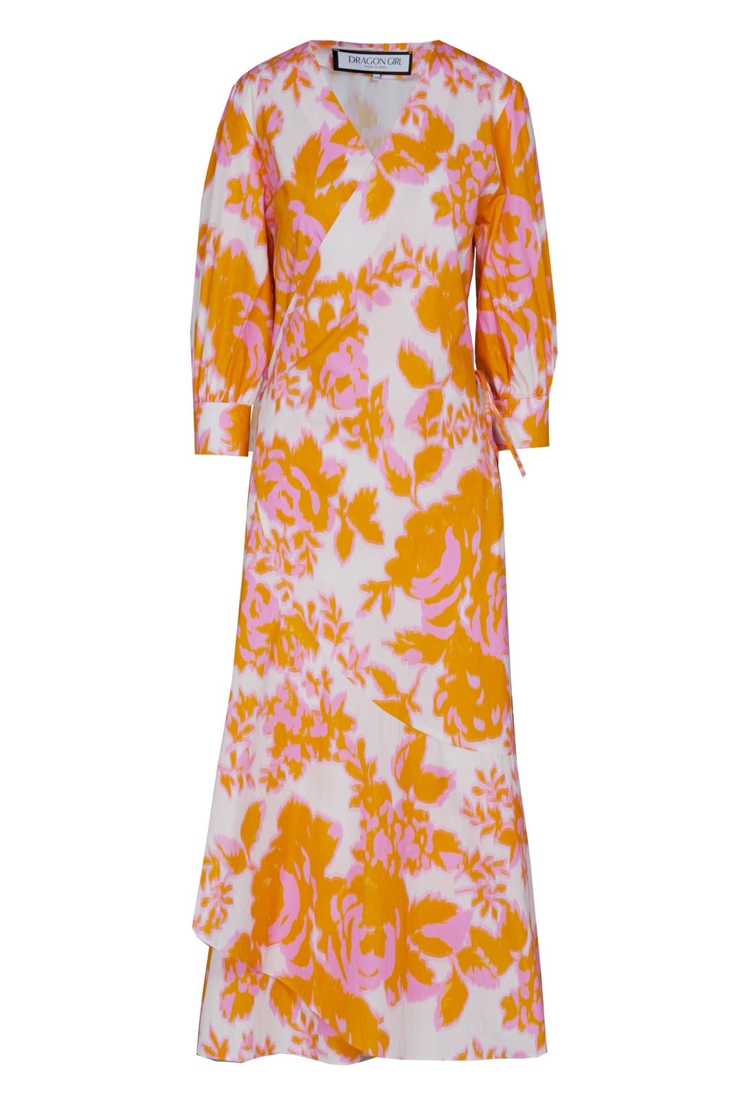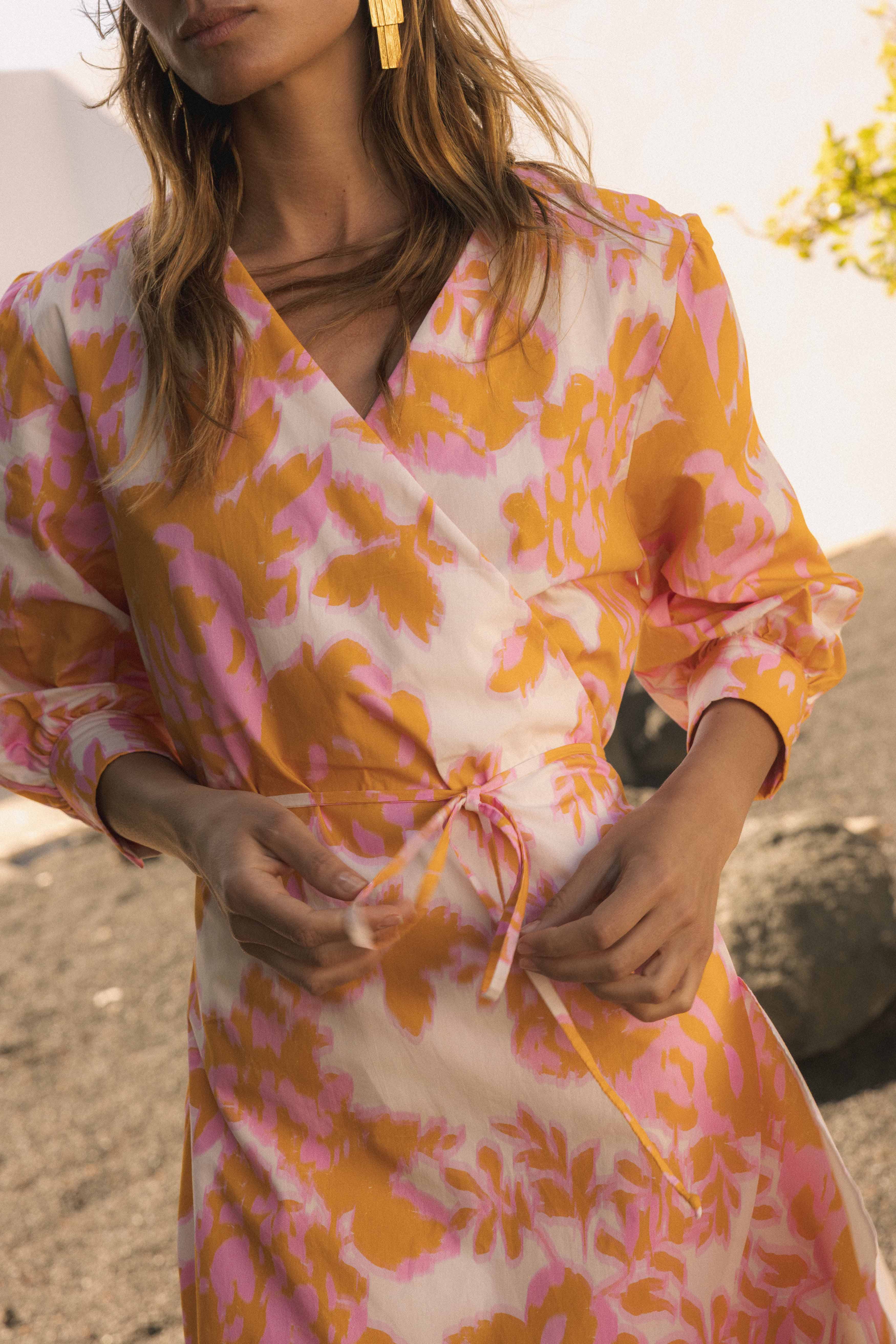 Vestido largo cruzado con manga francesa, escote en V y lazada a cintura.