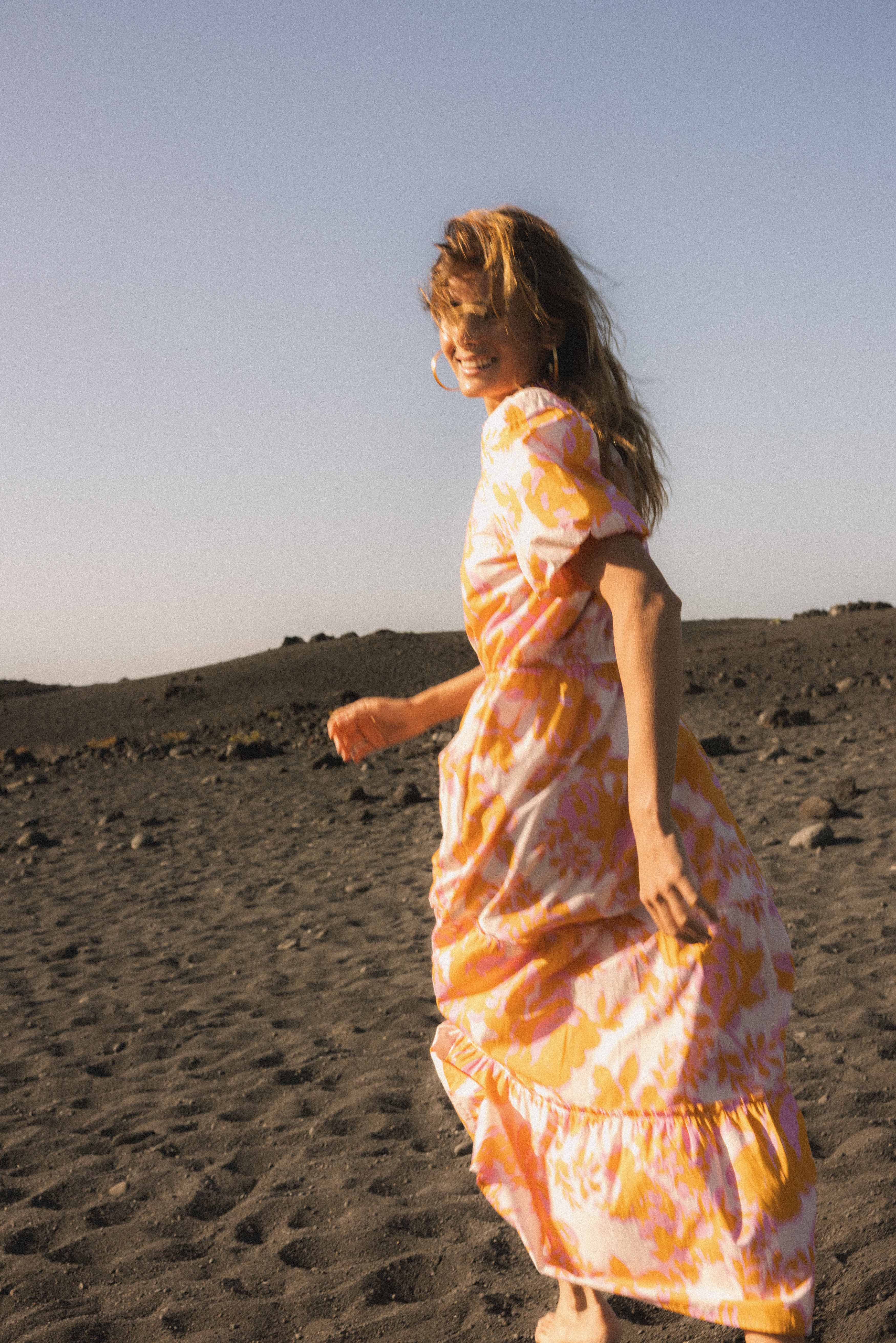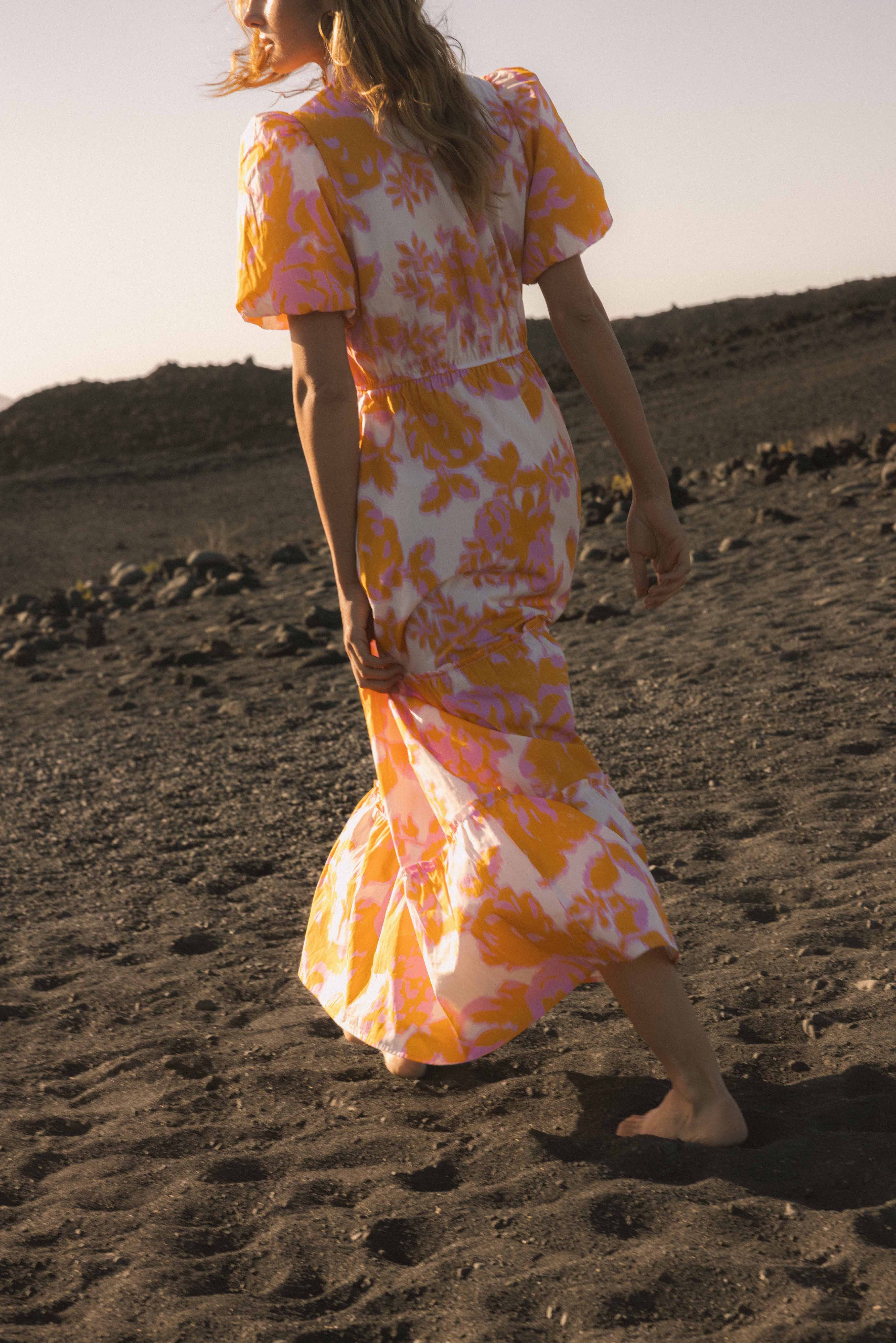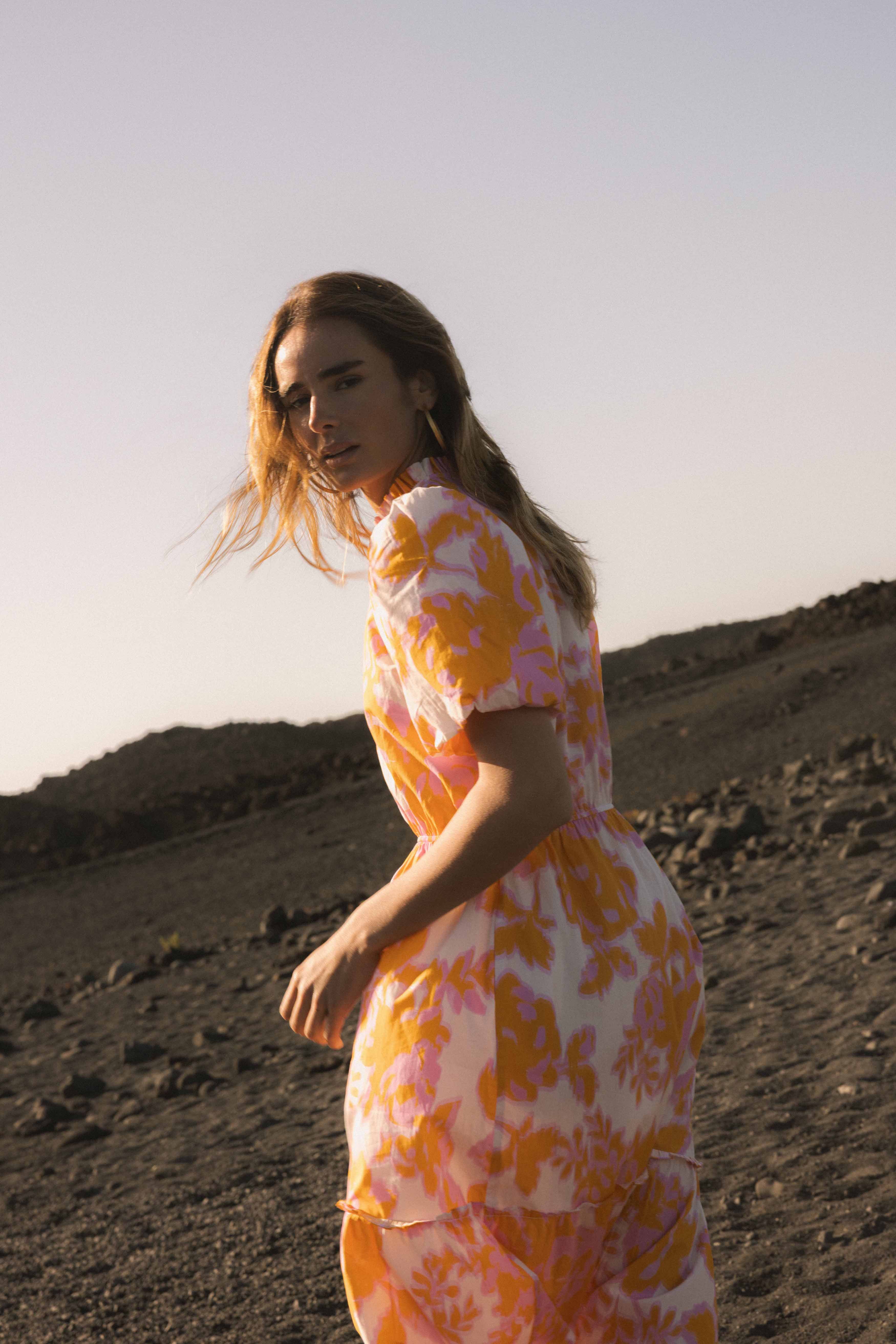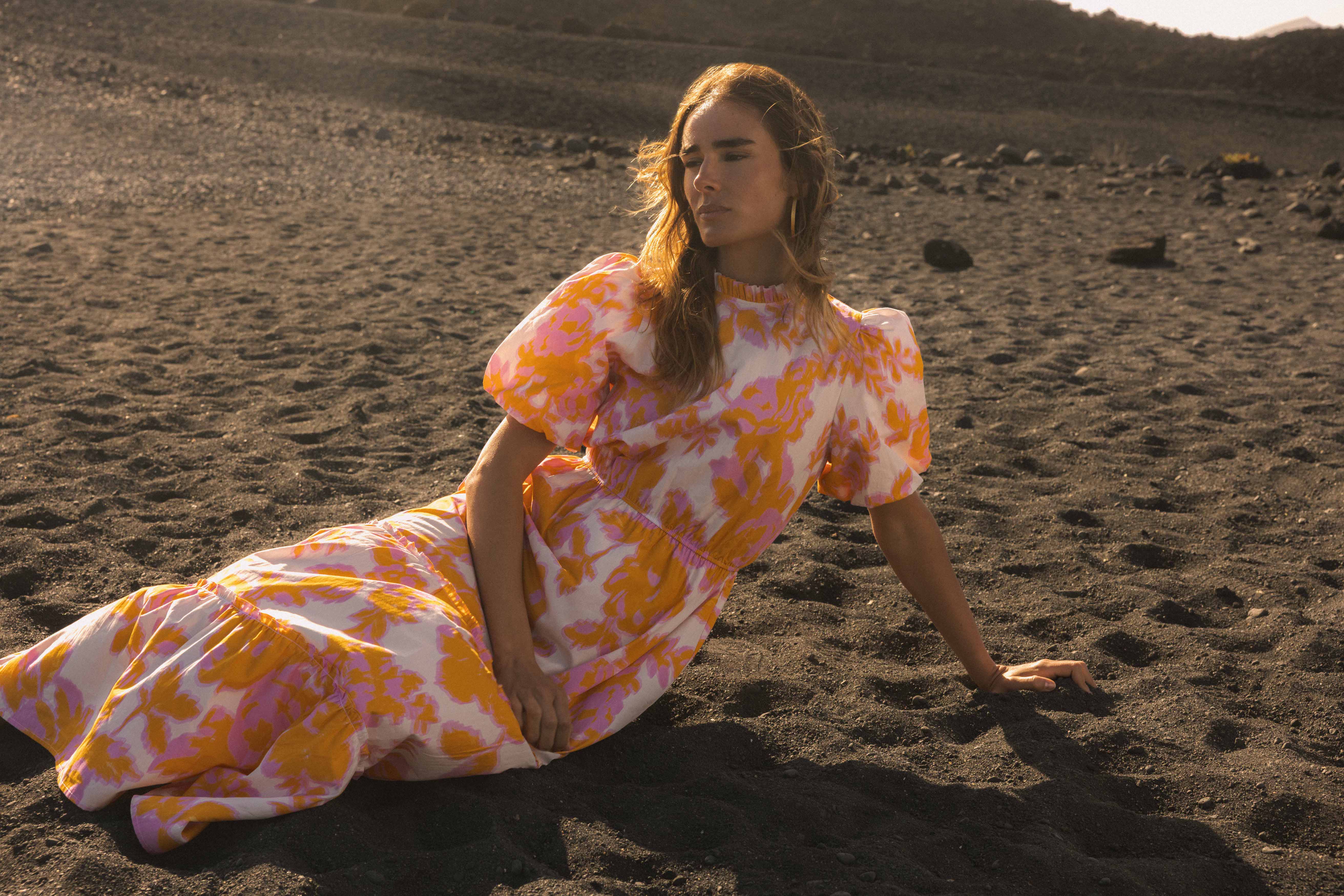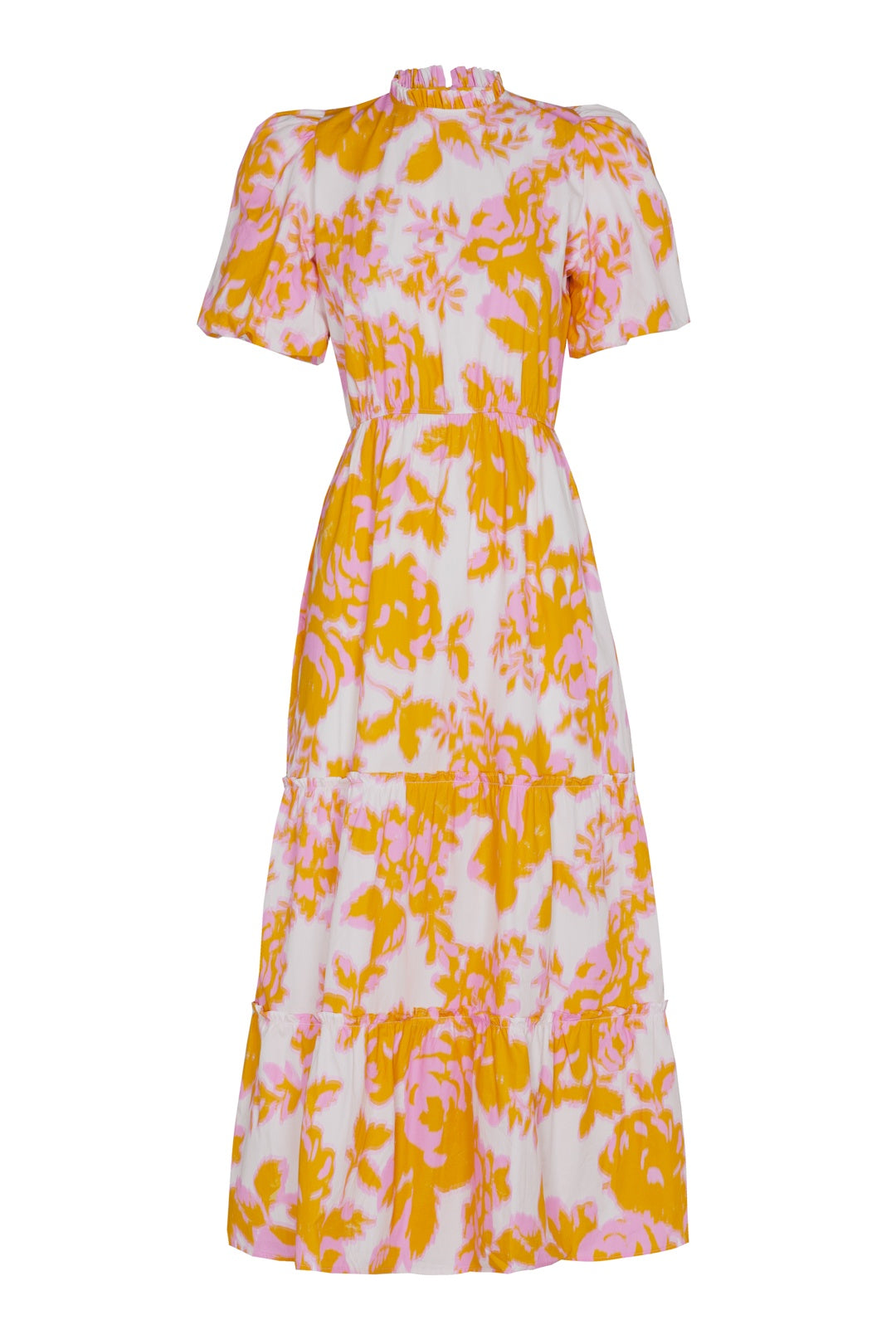Vestido largo con mangas abullonadas y cuello cerrado fruncido.