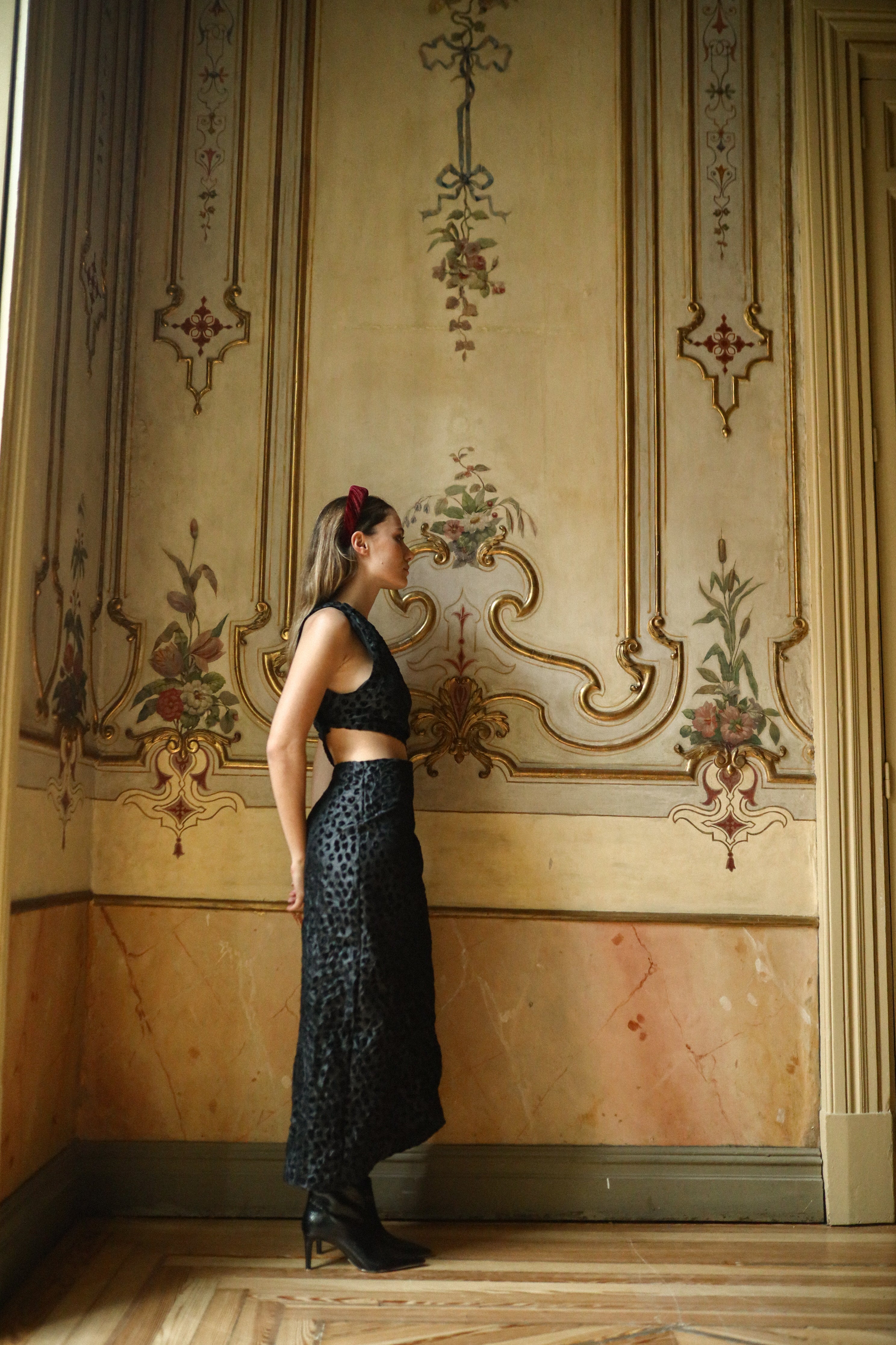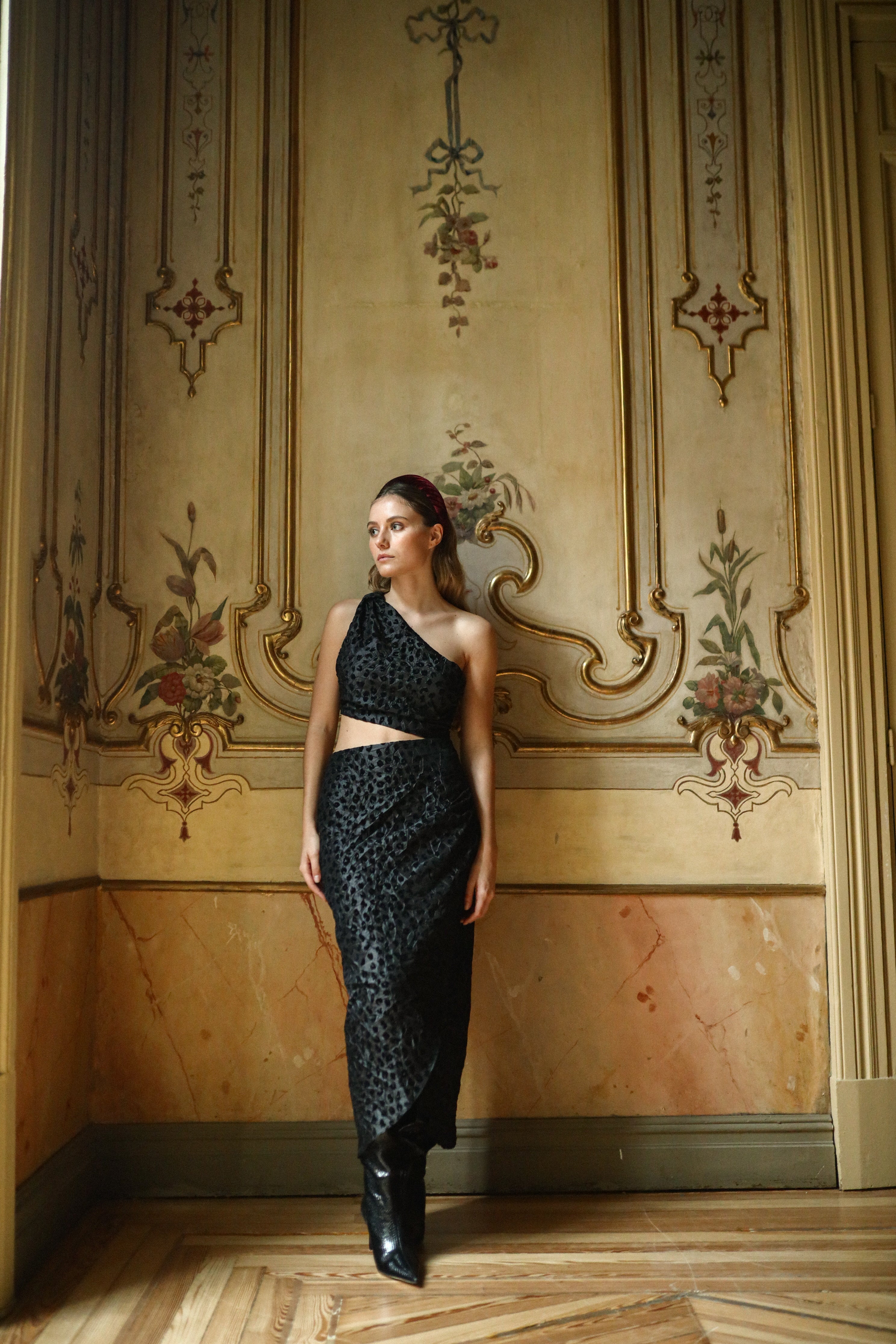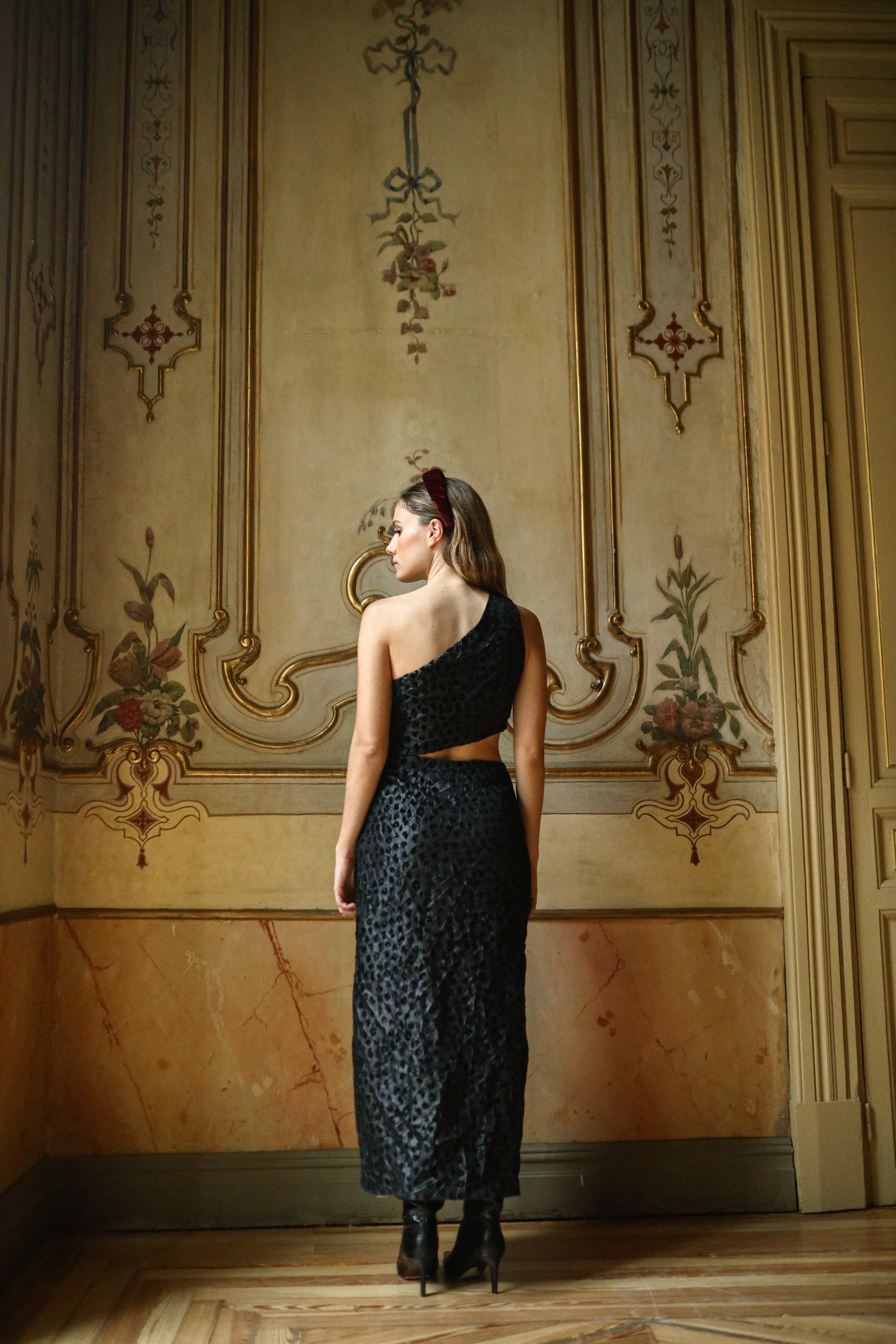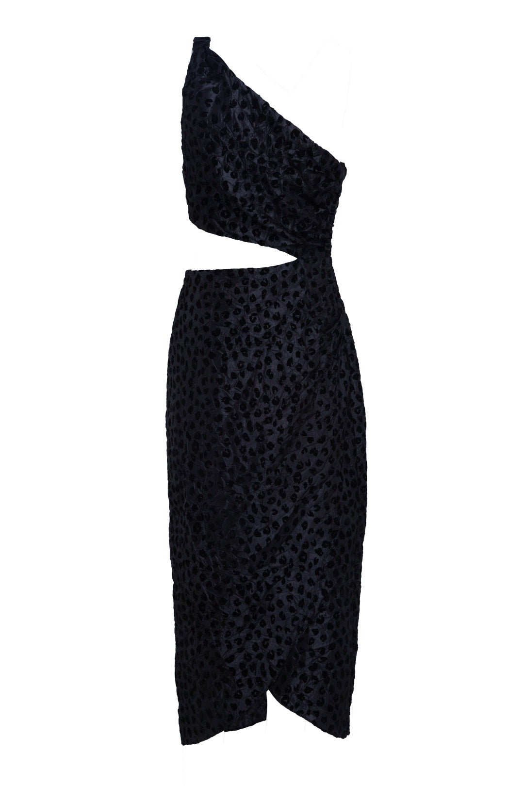 Cut out midi dress with asymmetrical neckline, sleeveless and asymmetrical neckline