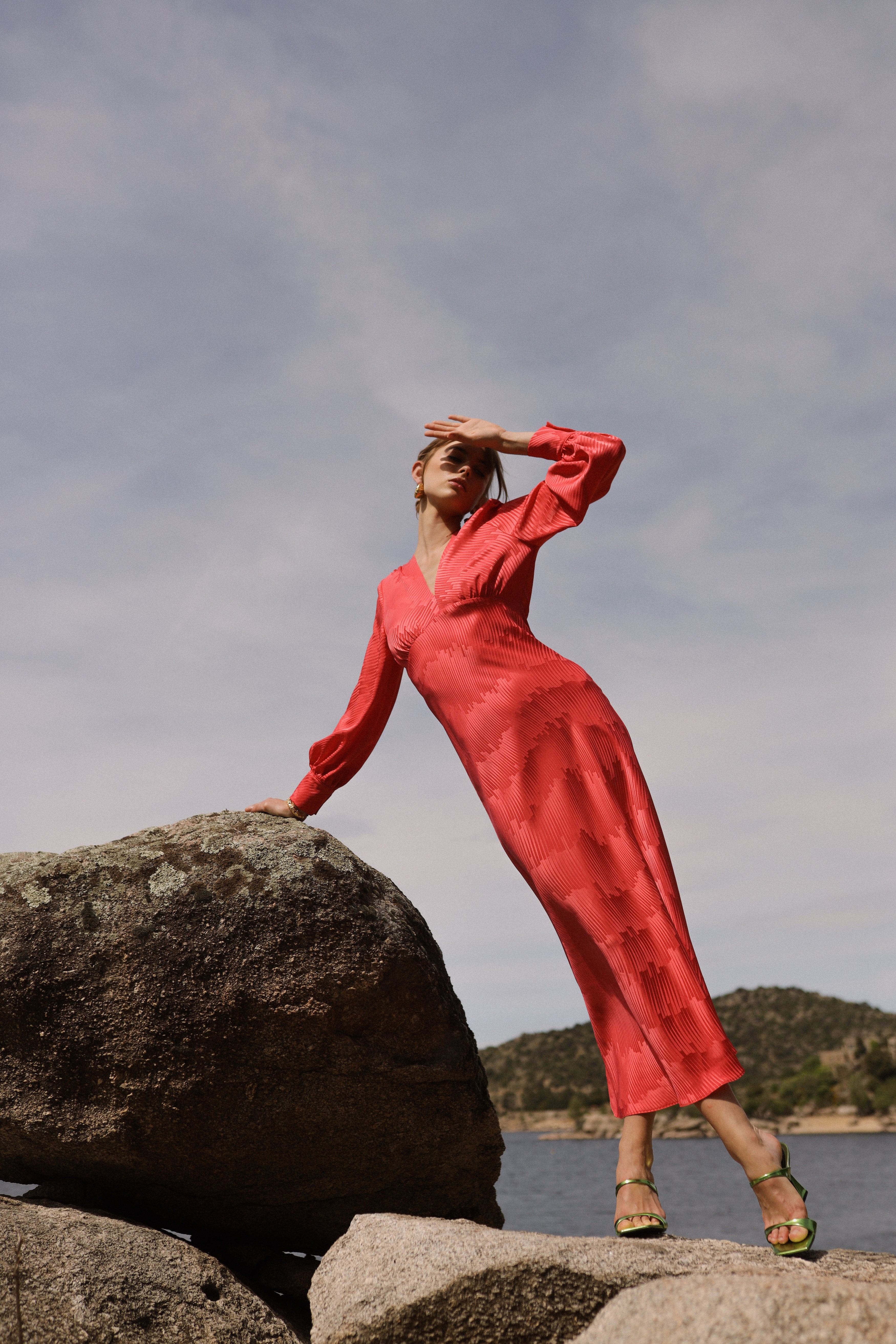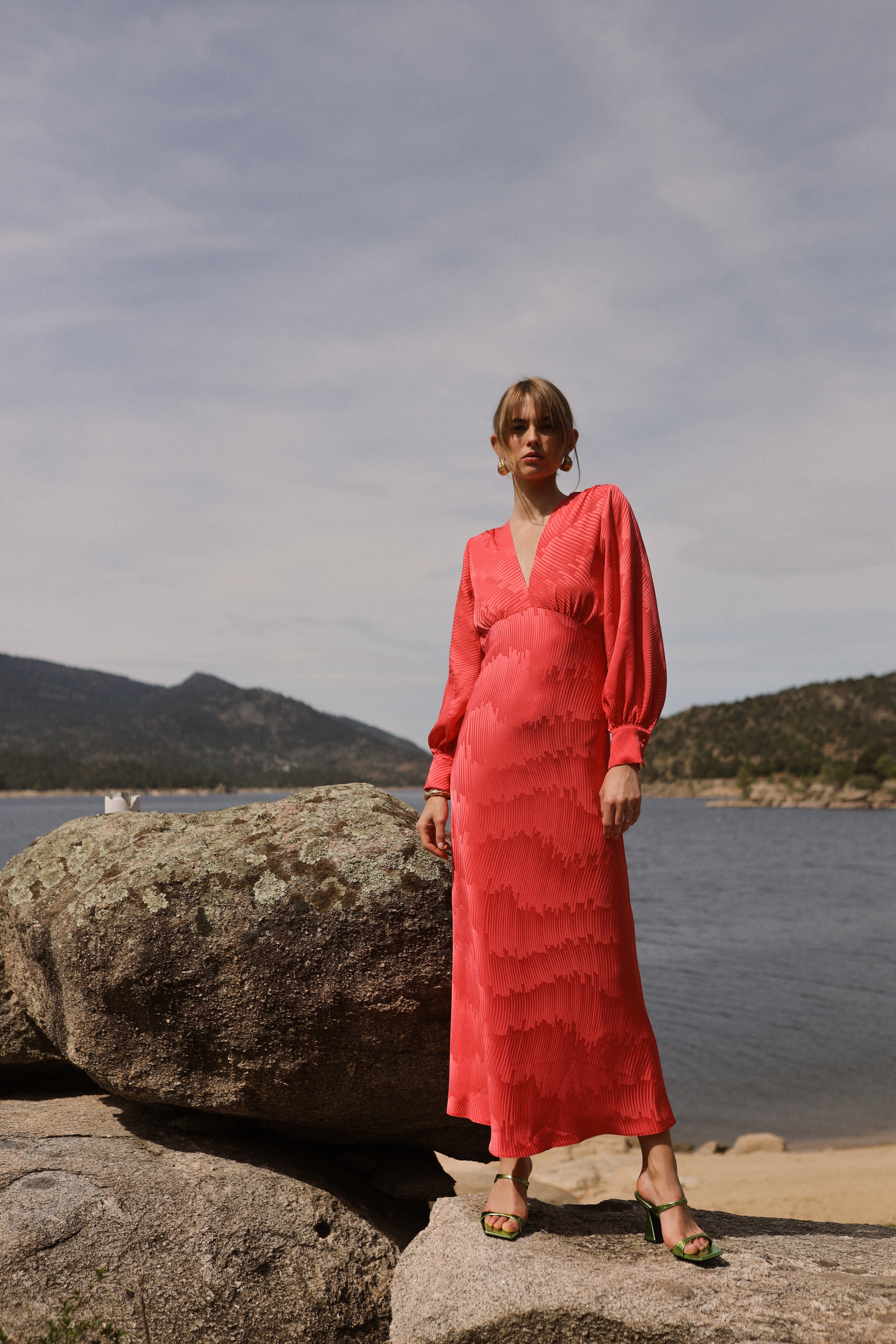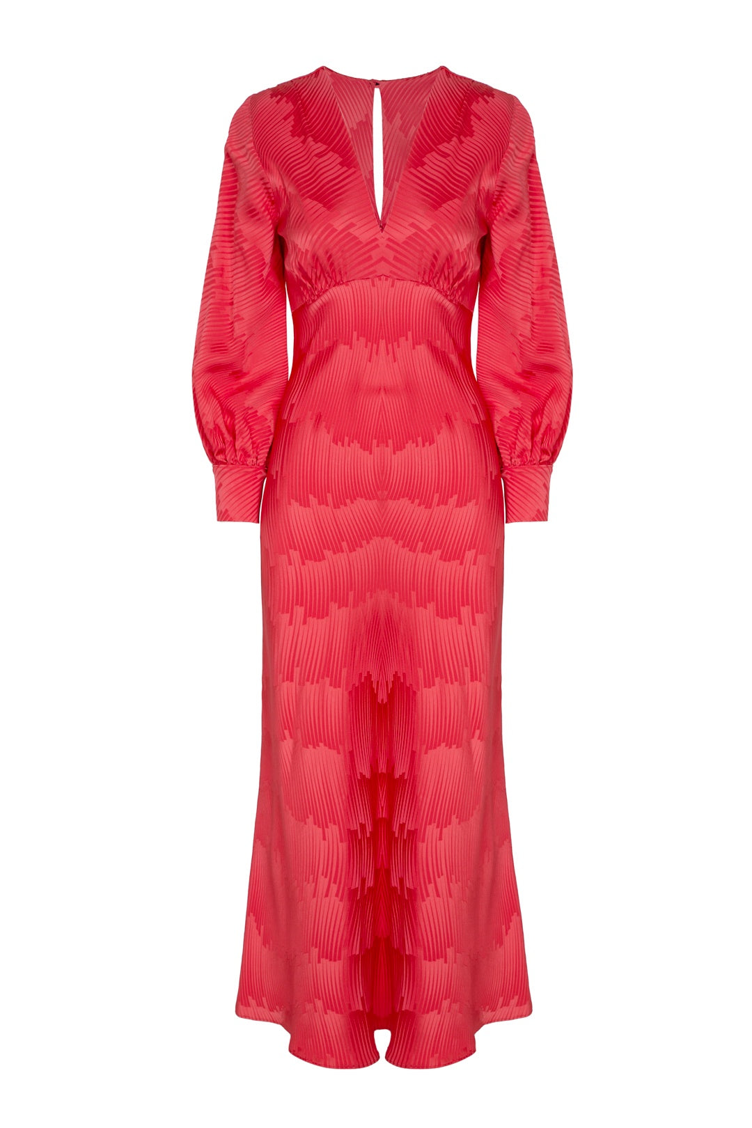 Midi dress with long sleeves and V-neckline.
